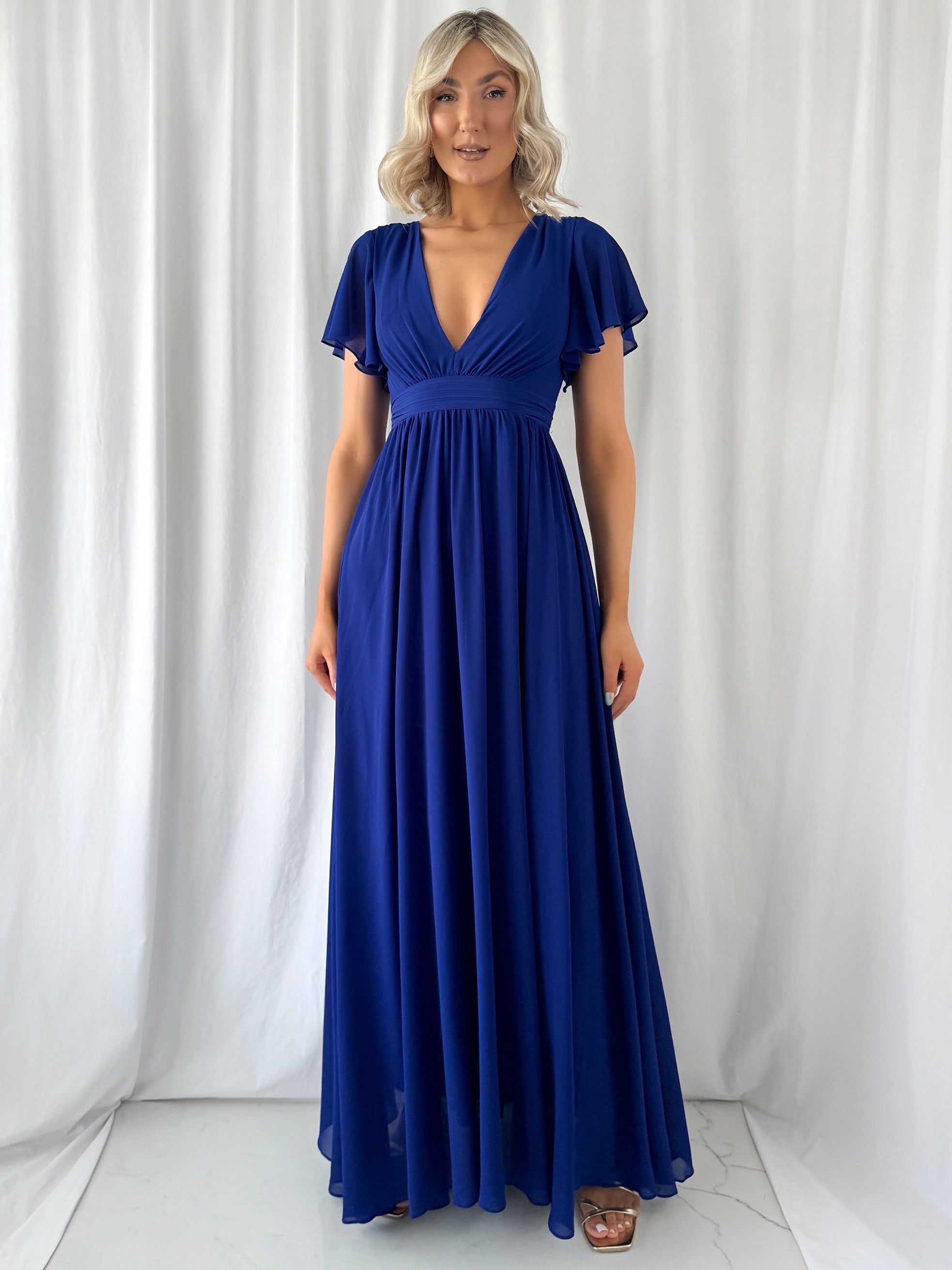 Agathe Off The Shoulder Maxi Dress – Navy – Zipper – Side Slit – Comes with Strappy – Small fit Model 6ft – Size Small – UK8