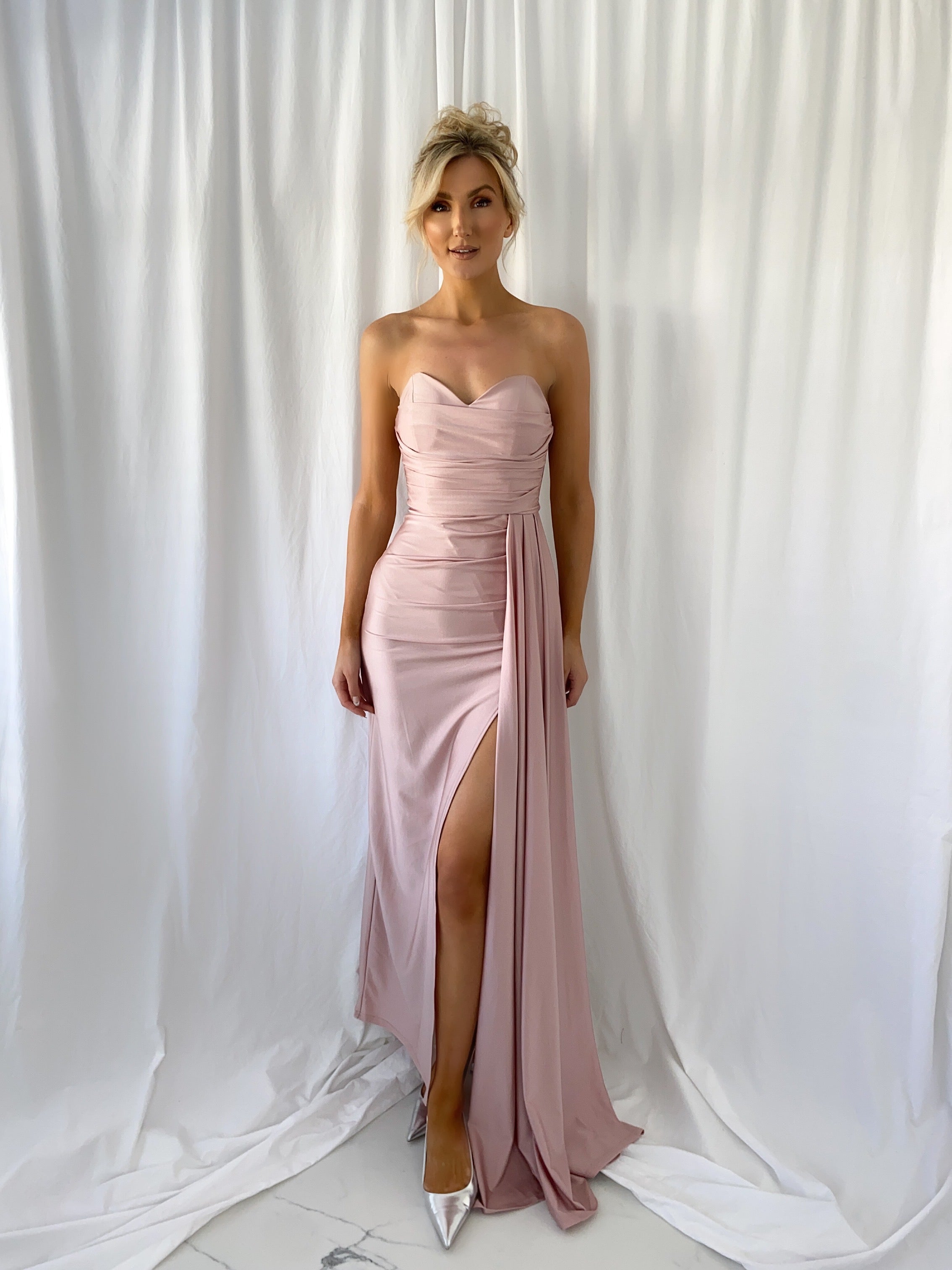 Agathe Off The Shoulder Maxi Dress – Old Rose – Zipper – Side Slit – Comes with Strappy – Small fit Model 6ft – Size Small – UK8