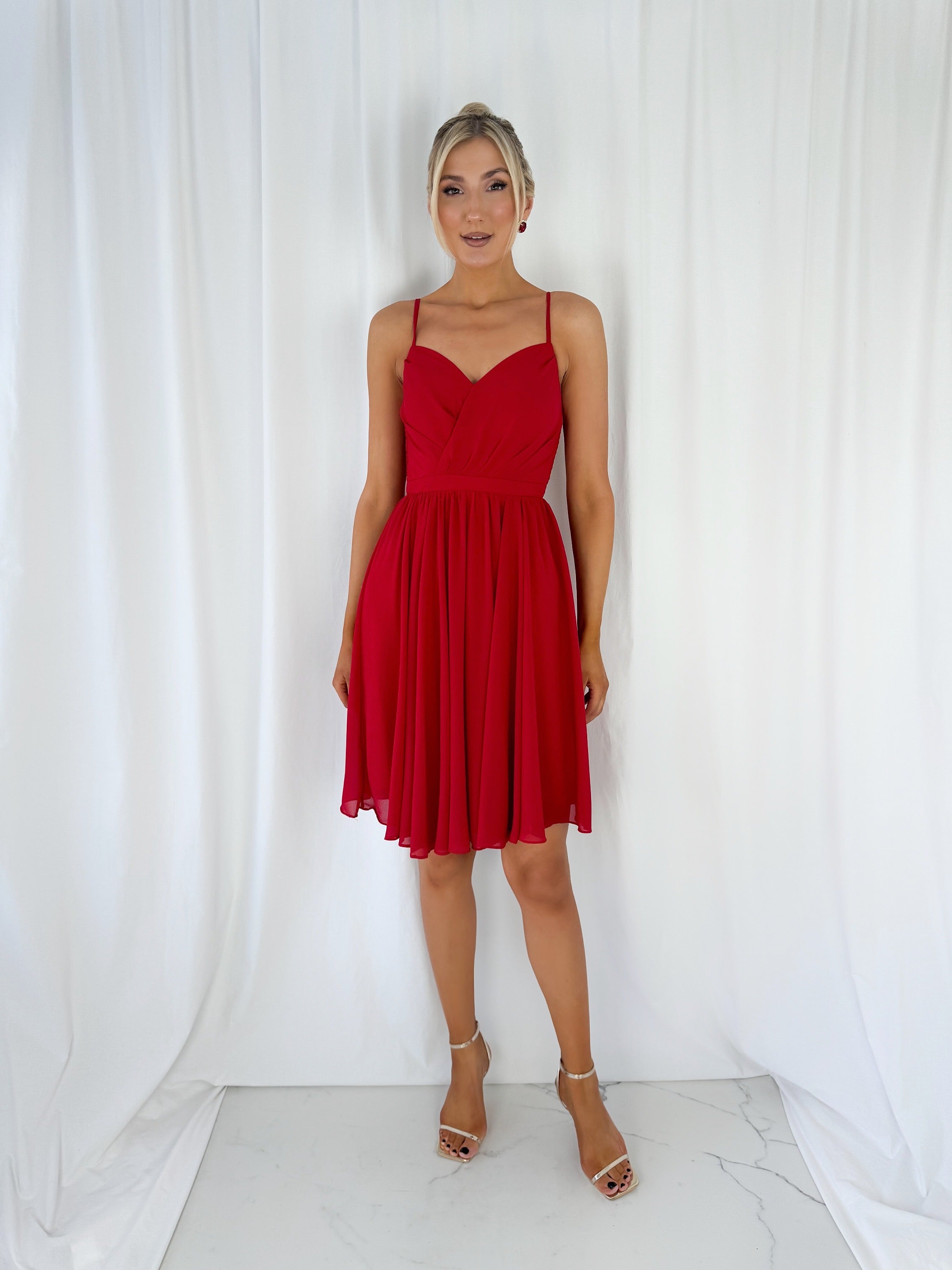 Amandine Cross Over Top – Short Dress – Red Elastic Back Model 6ft – Size Small – UK8