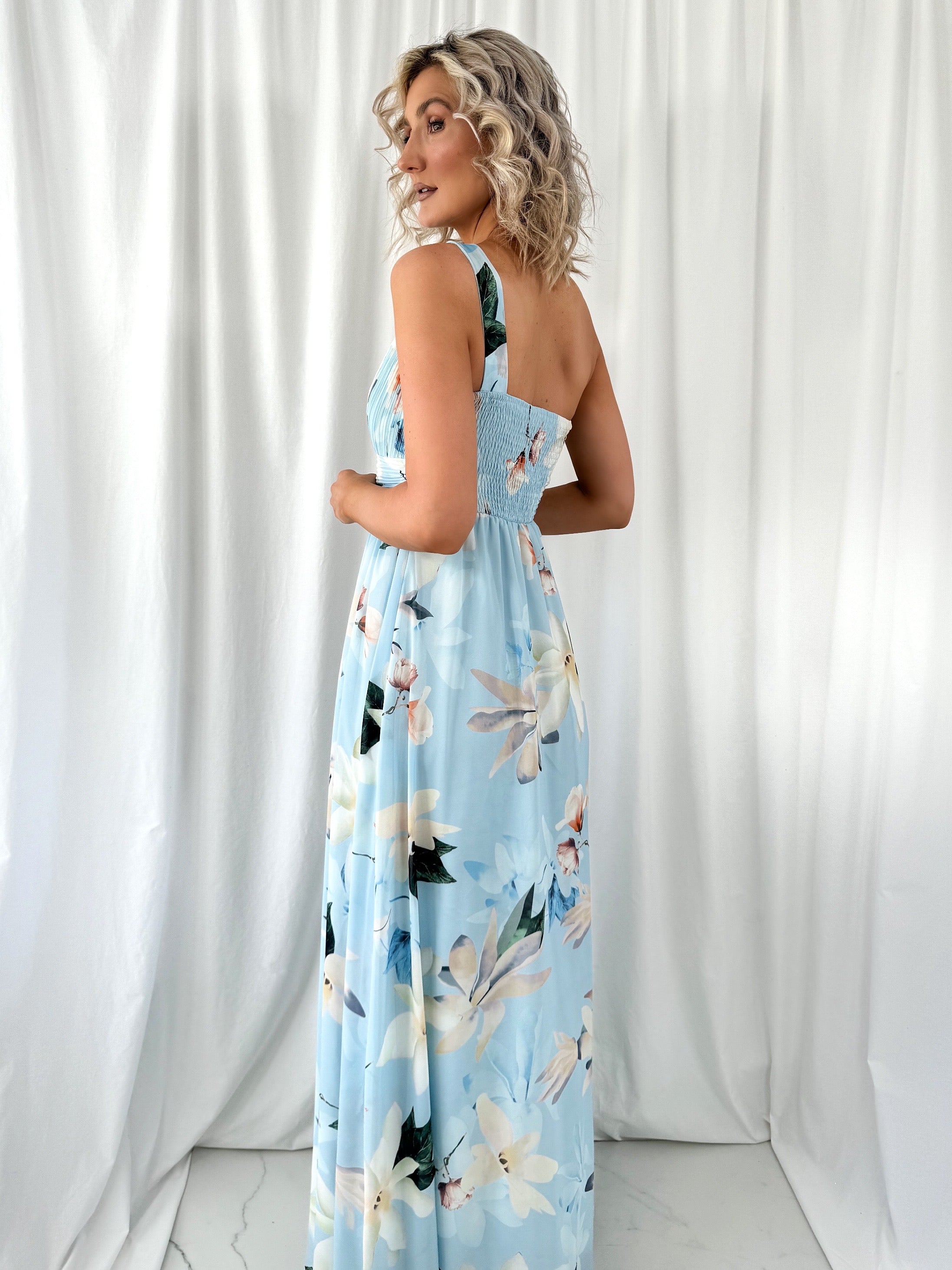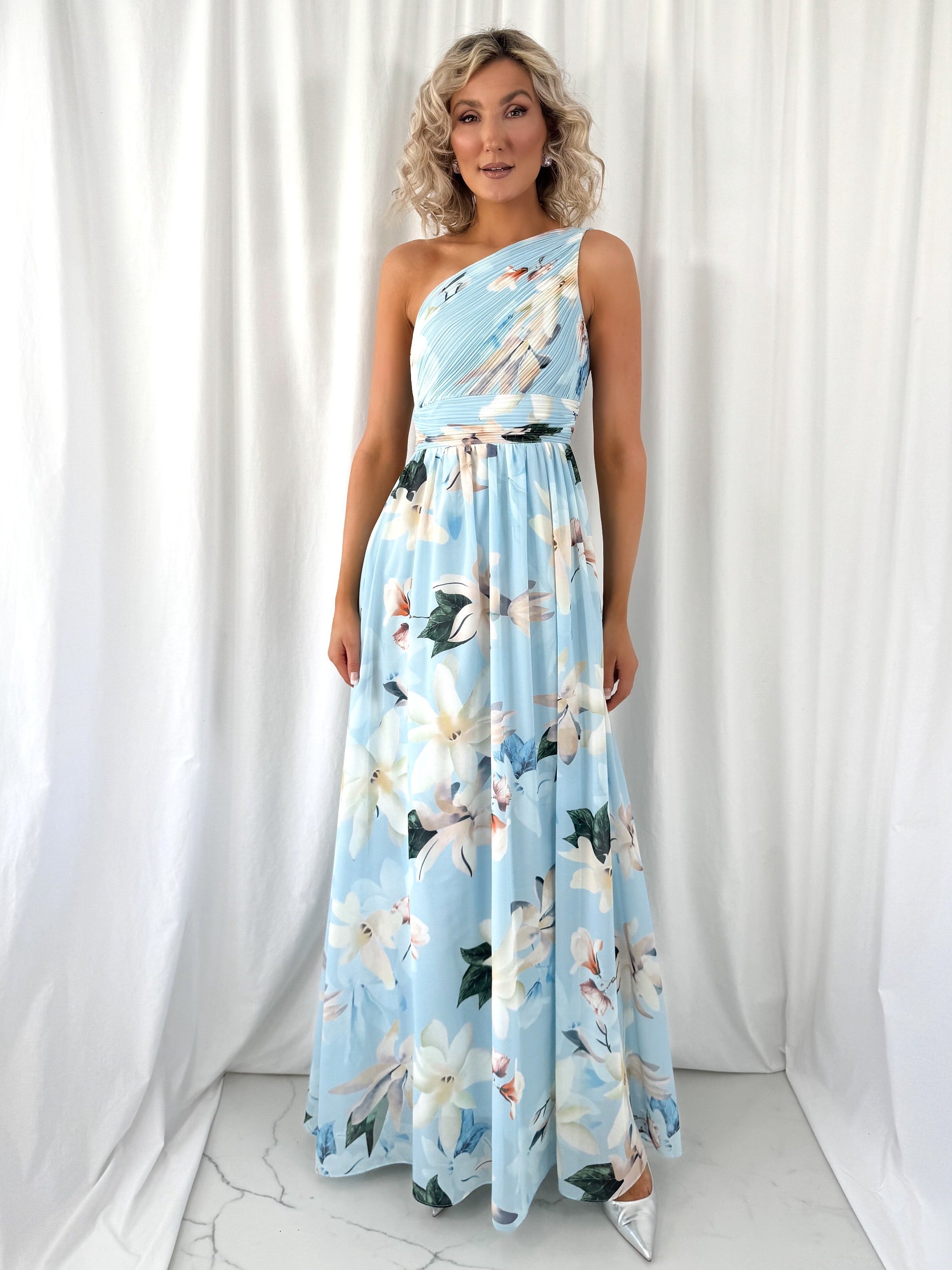 Ashley Maxi Dress with Draped One Shoulder Top – Light Blue Elasticated at the back Lined True to size Model 6ft – Size Small – UK8