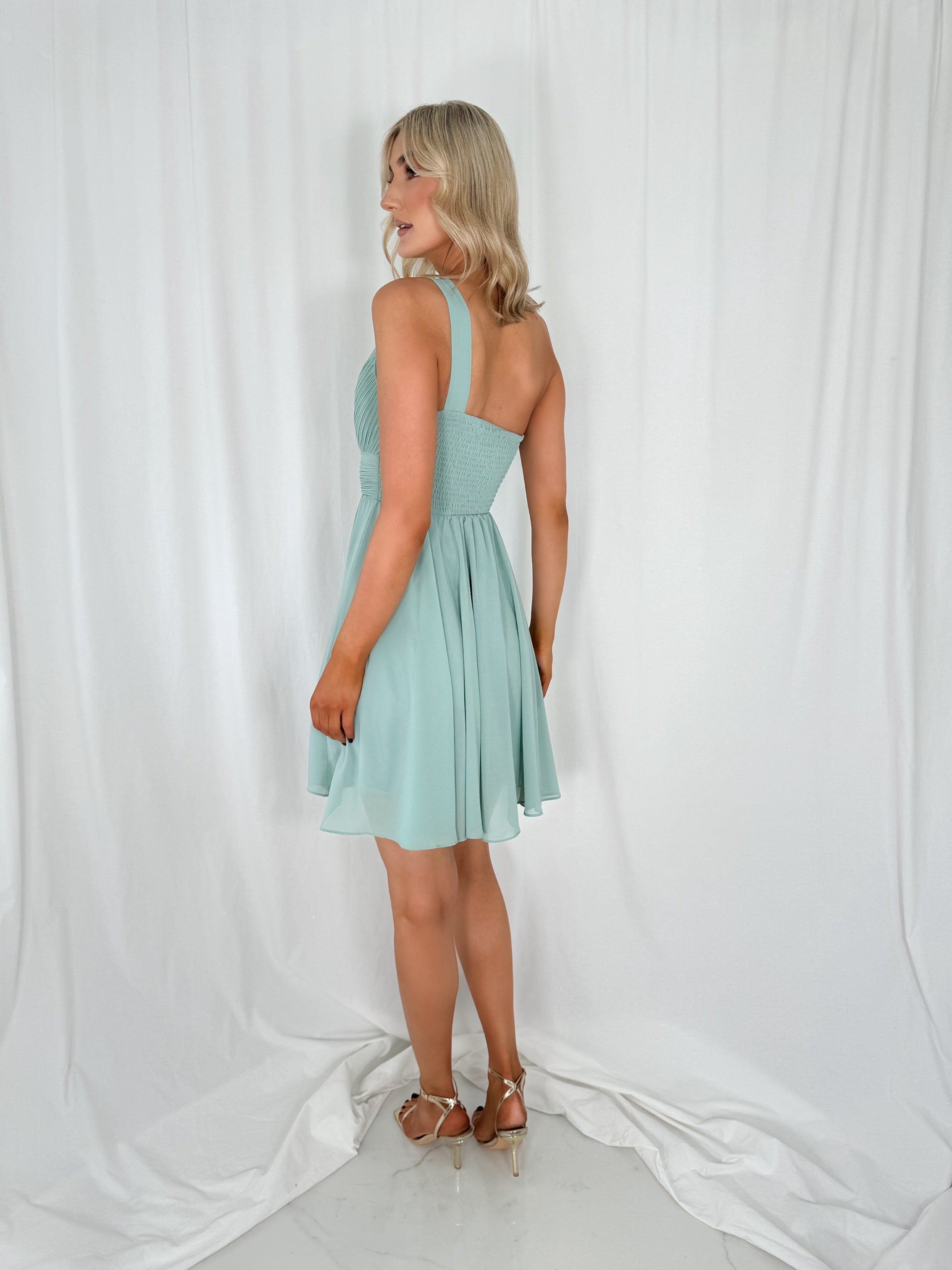 Catia One Shoulder Mini Dress – Sage Green – Lined – Back Elastic Model 6ft – Size Small – UK8