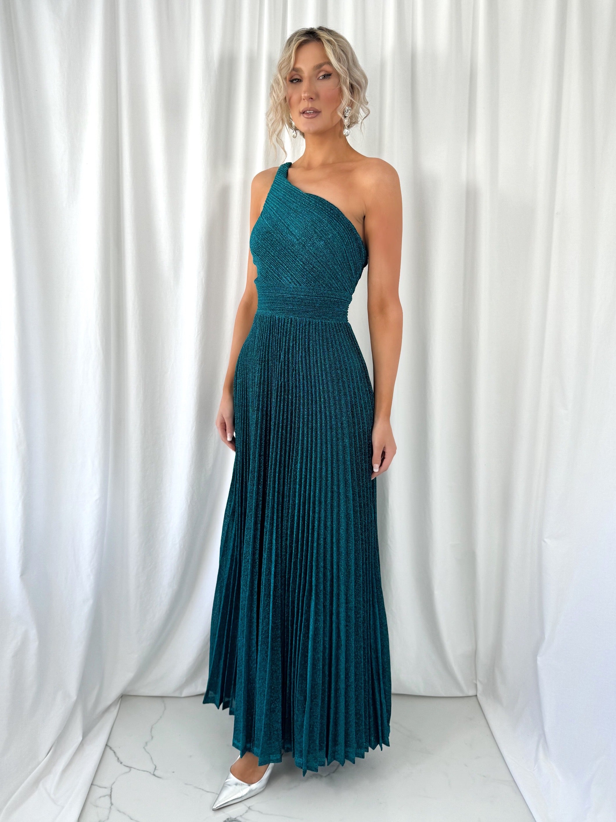 Coraly Bright Pleated Maxi Dress with Draped One Shoulder Top – Green Elasticated at the back Lined True to size Model 6ft – Size Small – UK8