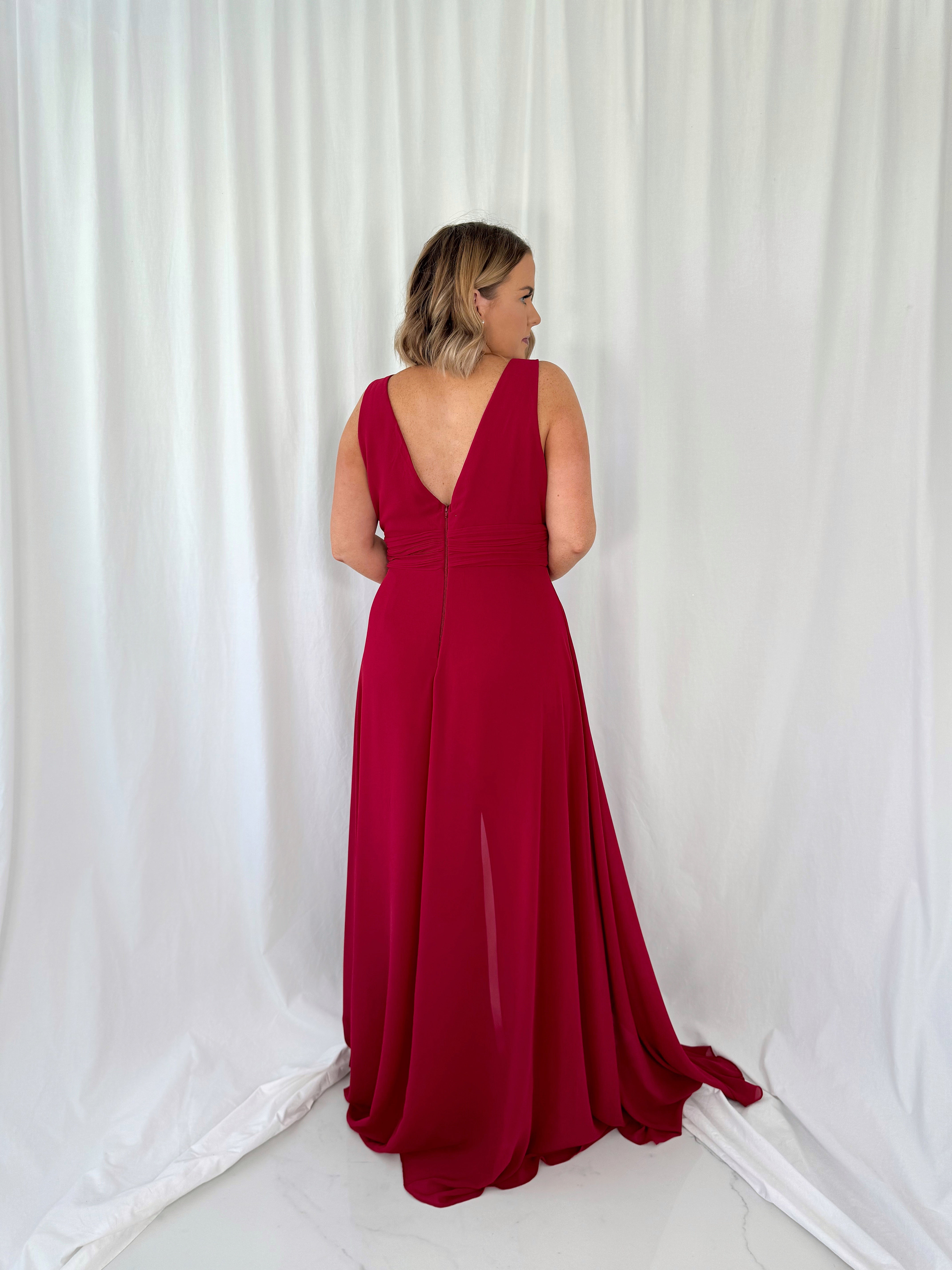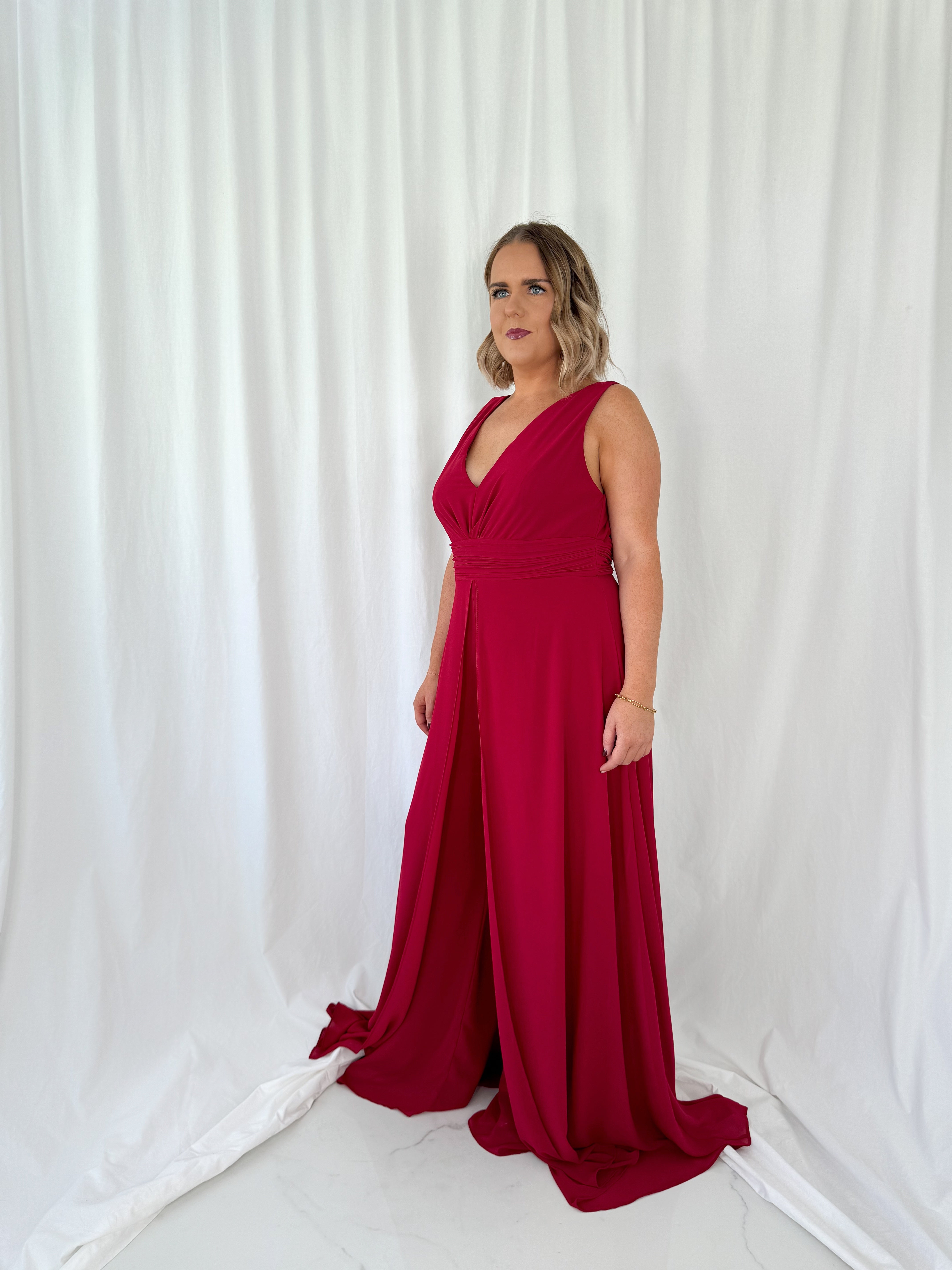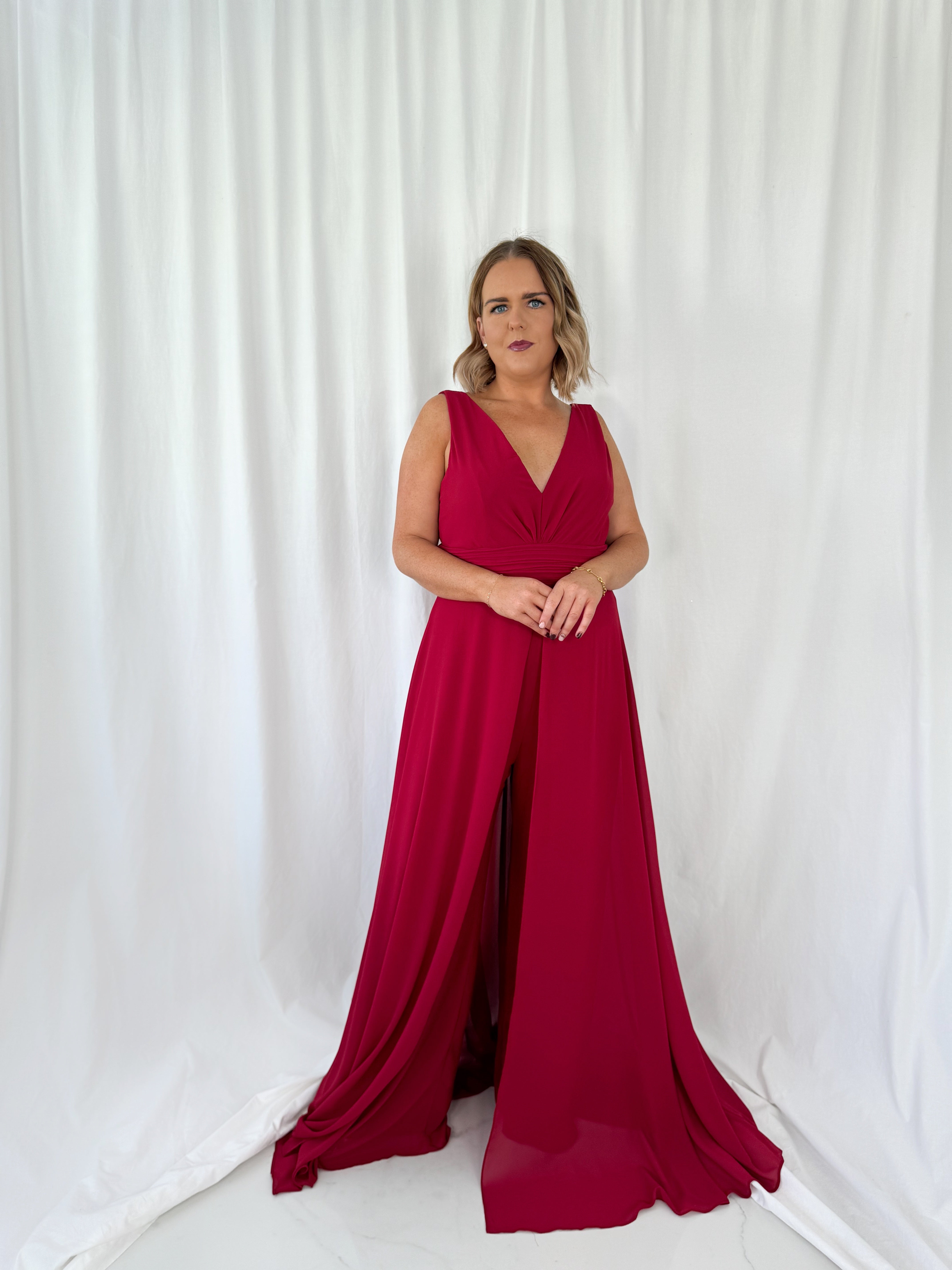 Curve Jumpsuit with a Cape – Cherry Model Height is 5ft 2 Model wears size 42 42 – UK14 44 – UK16 46 – UK18 48 – UK20 50 – UK22