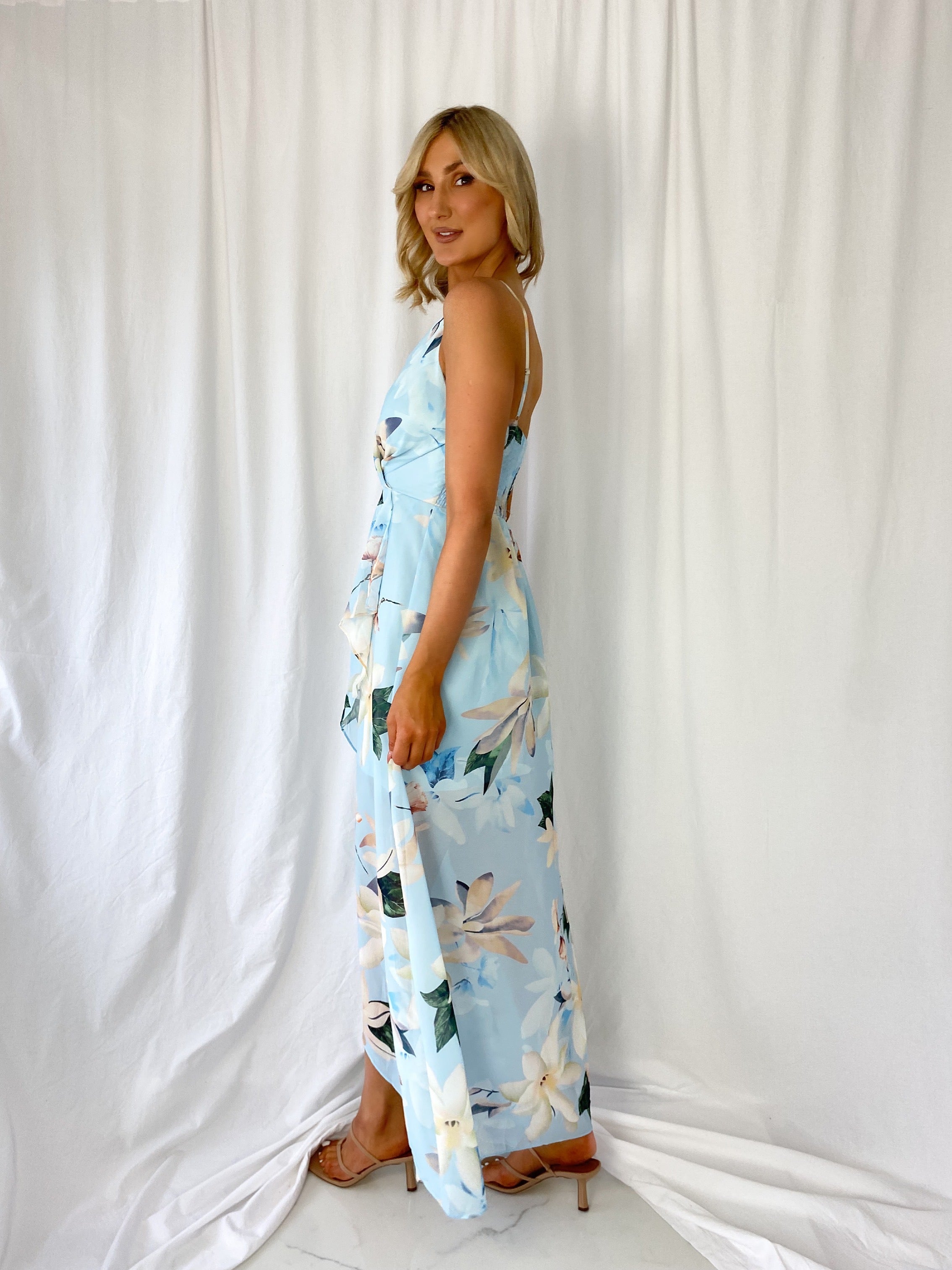 Sorcha Floral Maxi Dress – Light Blue Model 6ft – Size Small – UK8