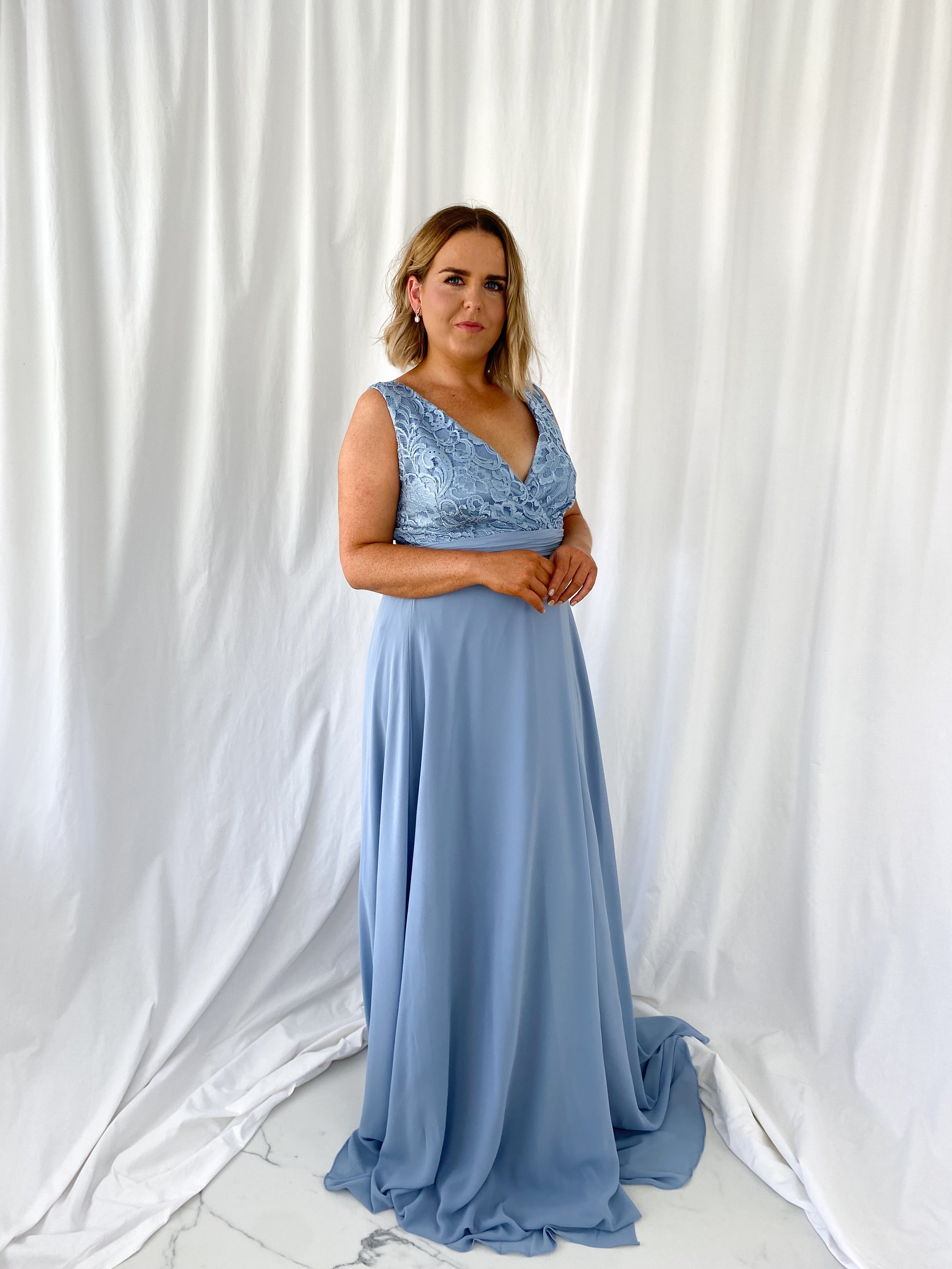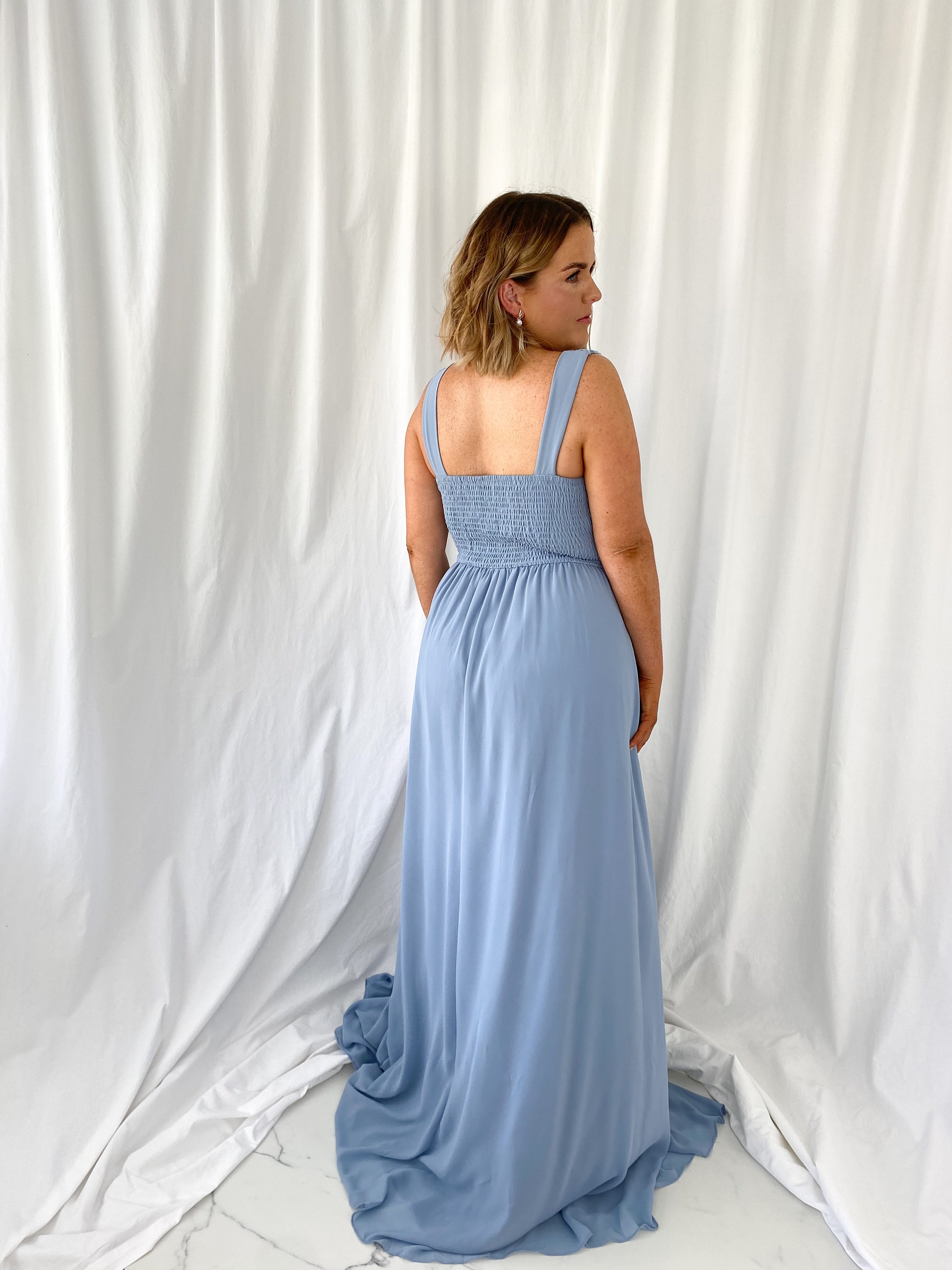 Darlene Maxi Dress with Open Slit – Dusty Blue – Lined – Elastic Back Model Height is 5ft 2 Model wears size 42 42 – UK14 44 – UK16 46 – UK18 48 – UK20 50 – UK22
