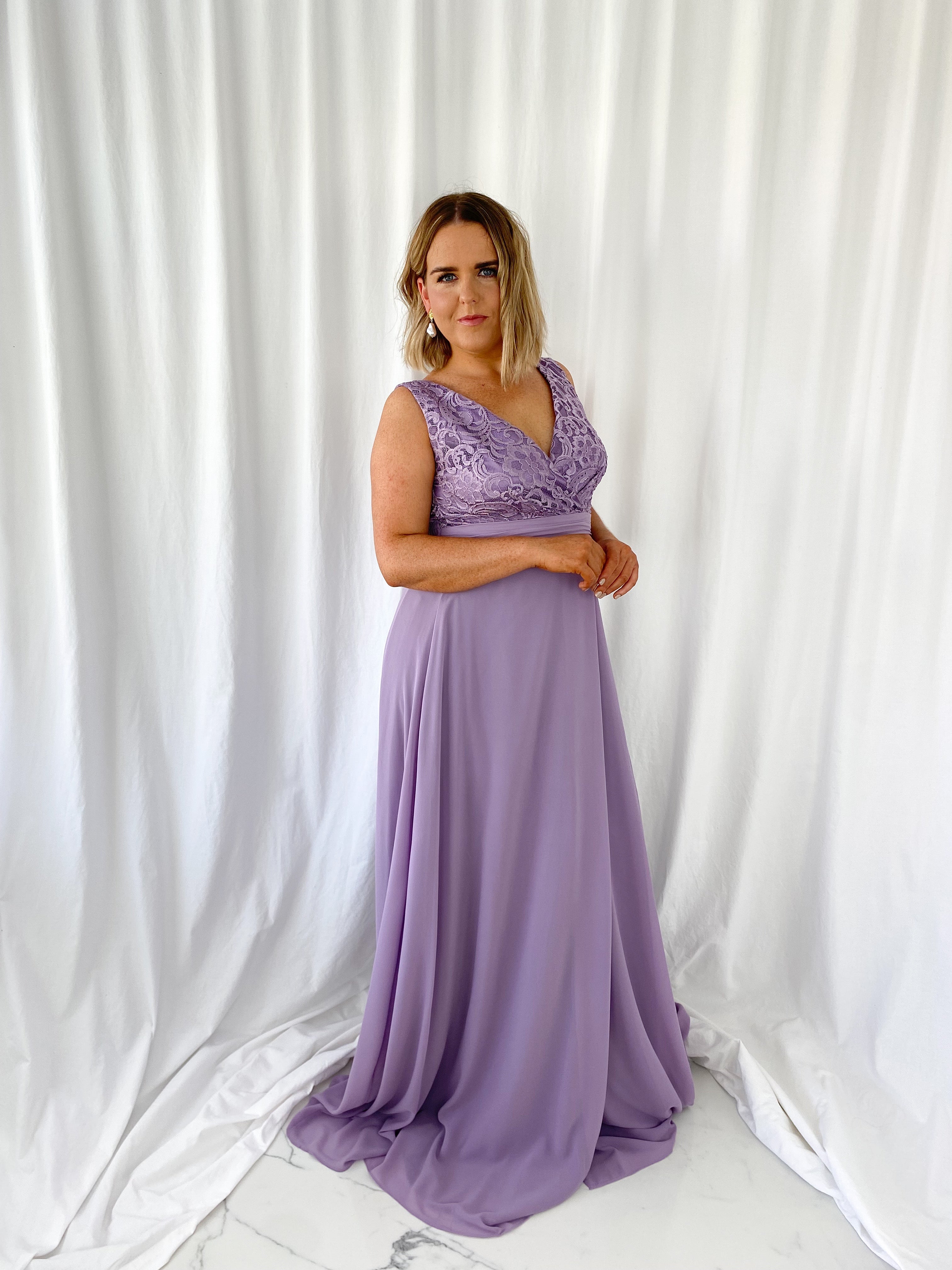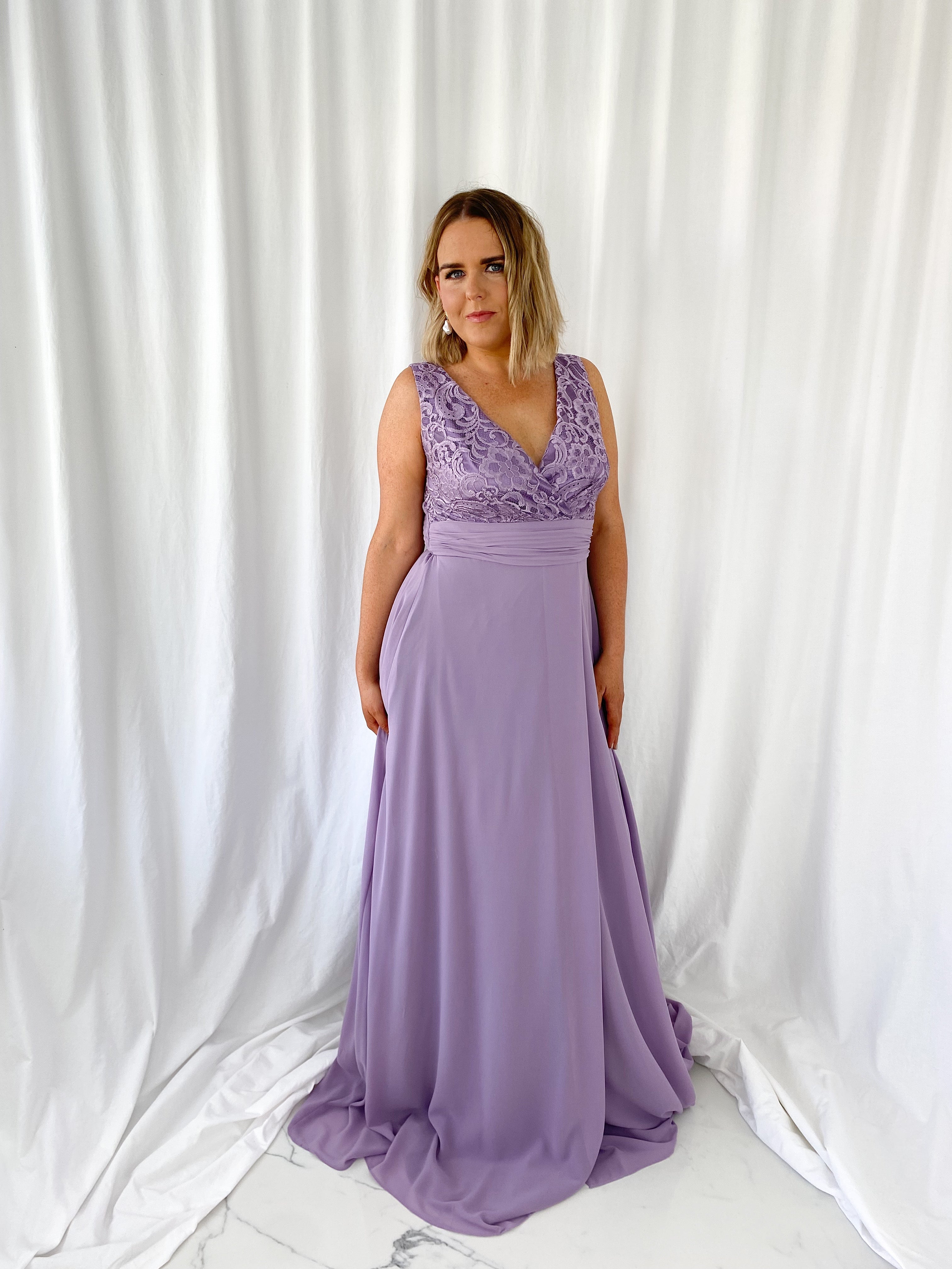 Darlene Maxi Dress with Open Slit – Lavender – Lined – Elastic Back Model Height is 5ft 2 Model wears size 42