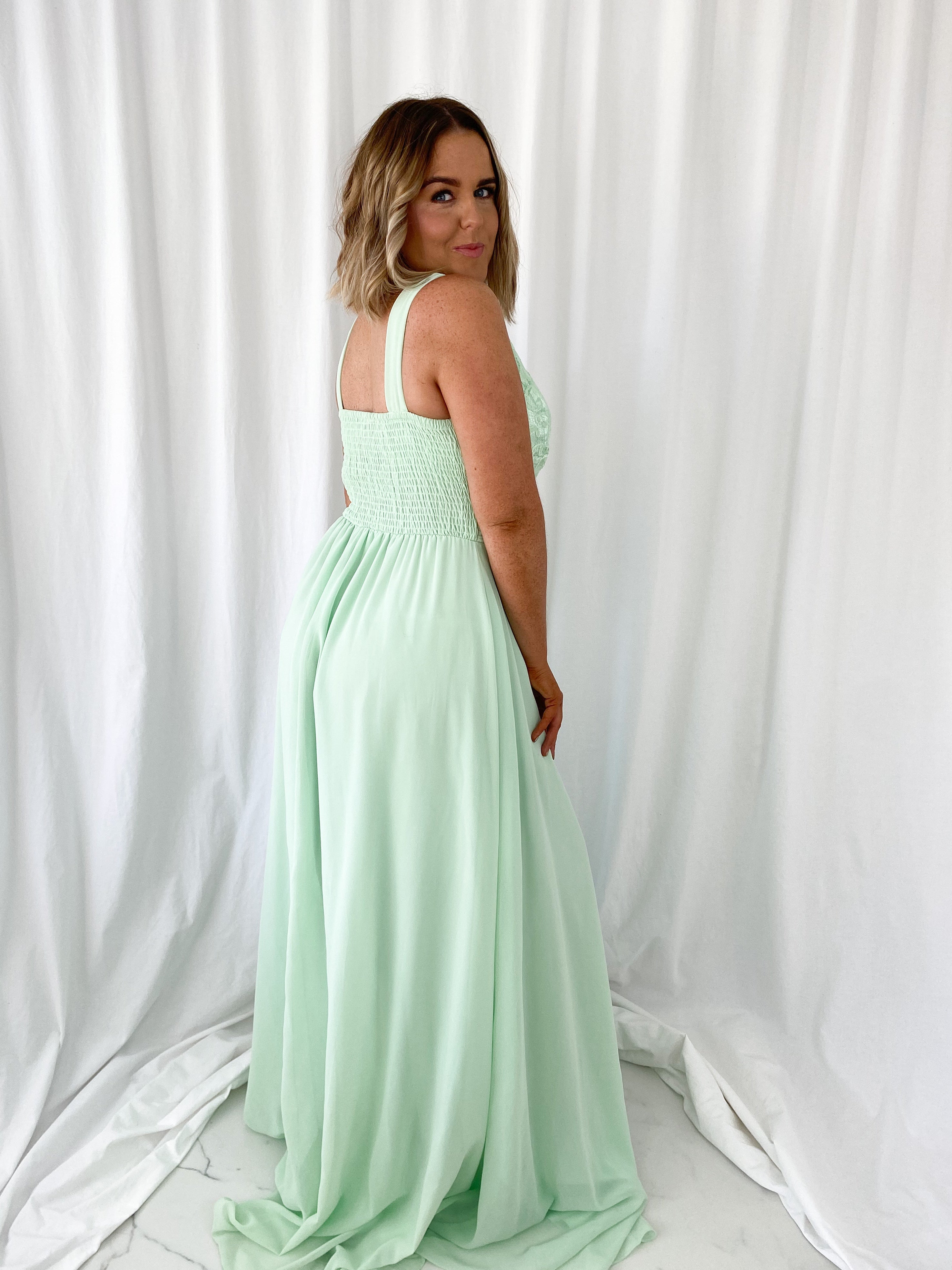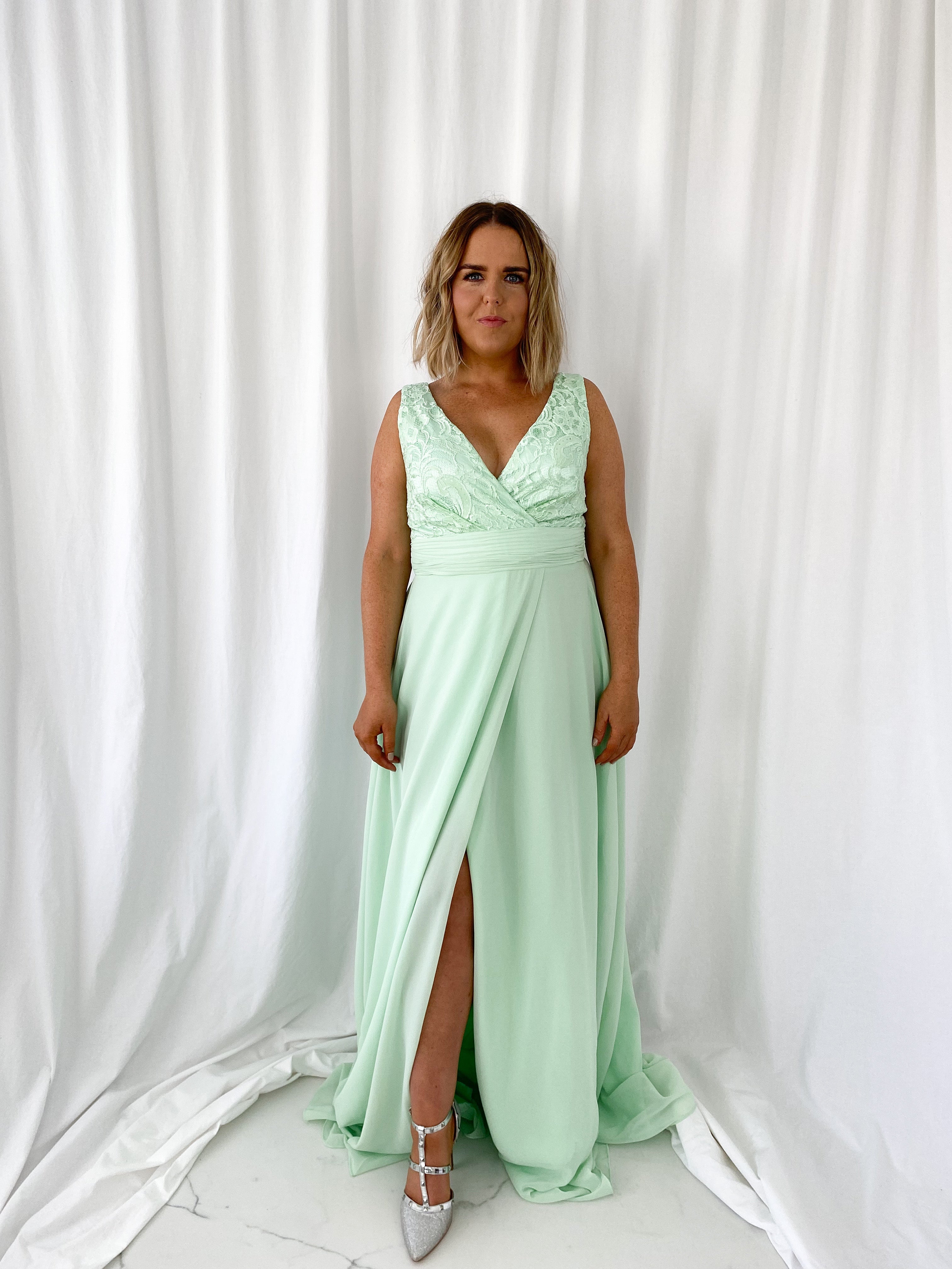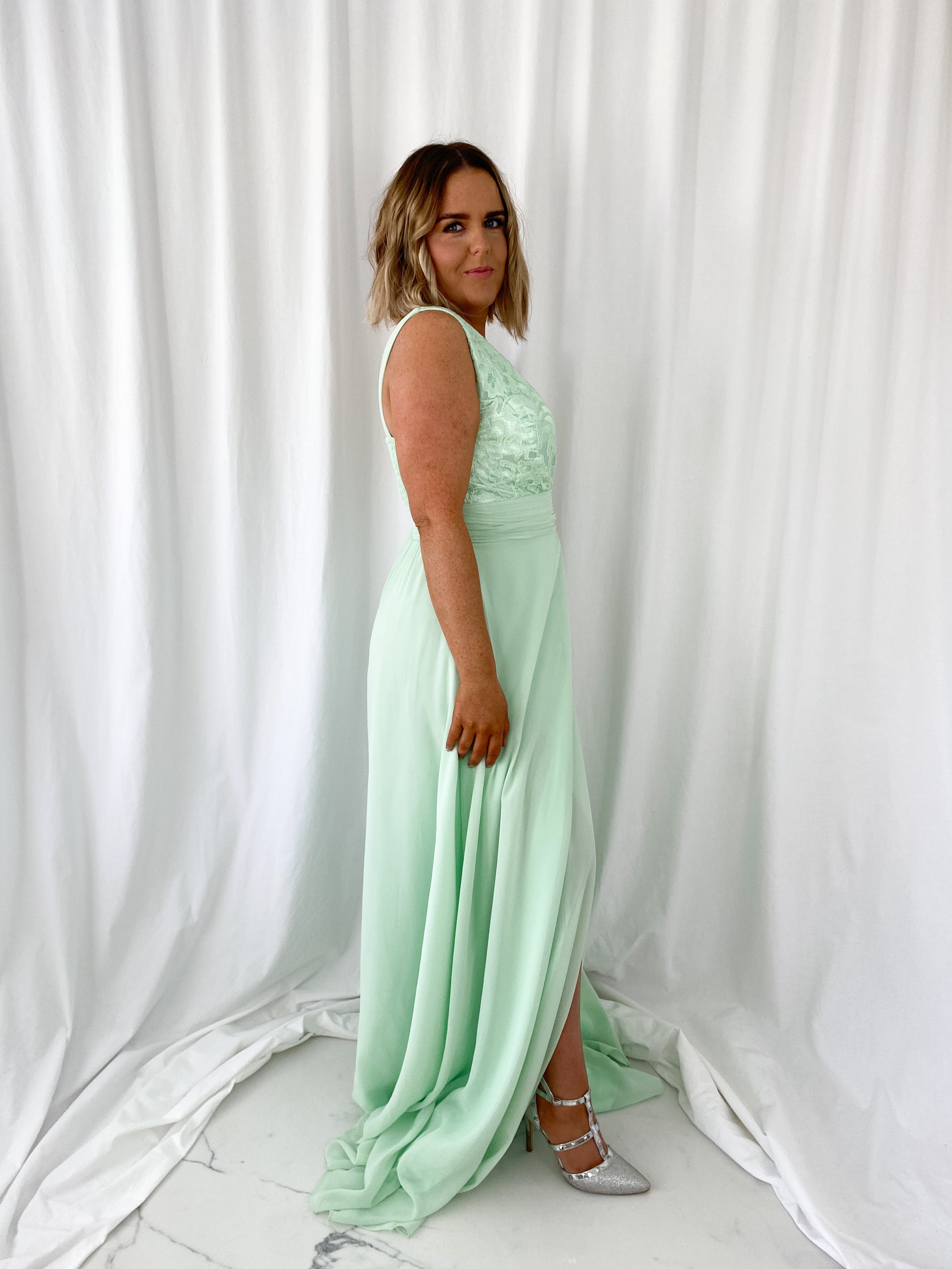Darlene Maxi Dress with Open Slit – Light Green – Lined – Elastic Back Model Height is 5ft 2 Model wears size 42 42 – UK14 44 – UK16 46 – UK18 48 – UK20 50 – UK22