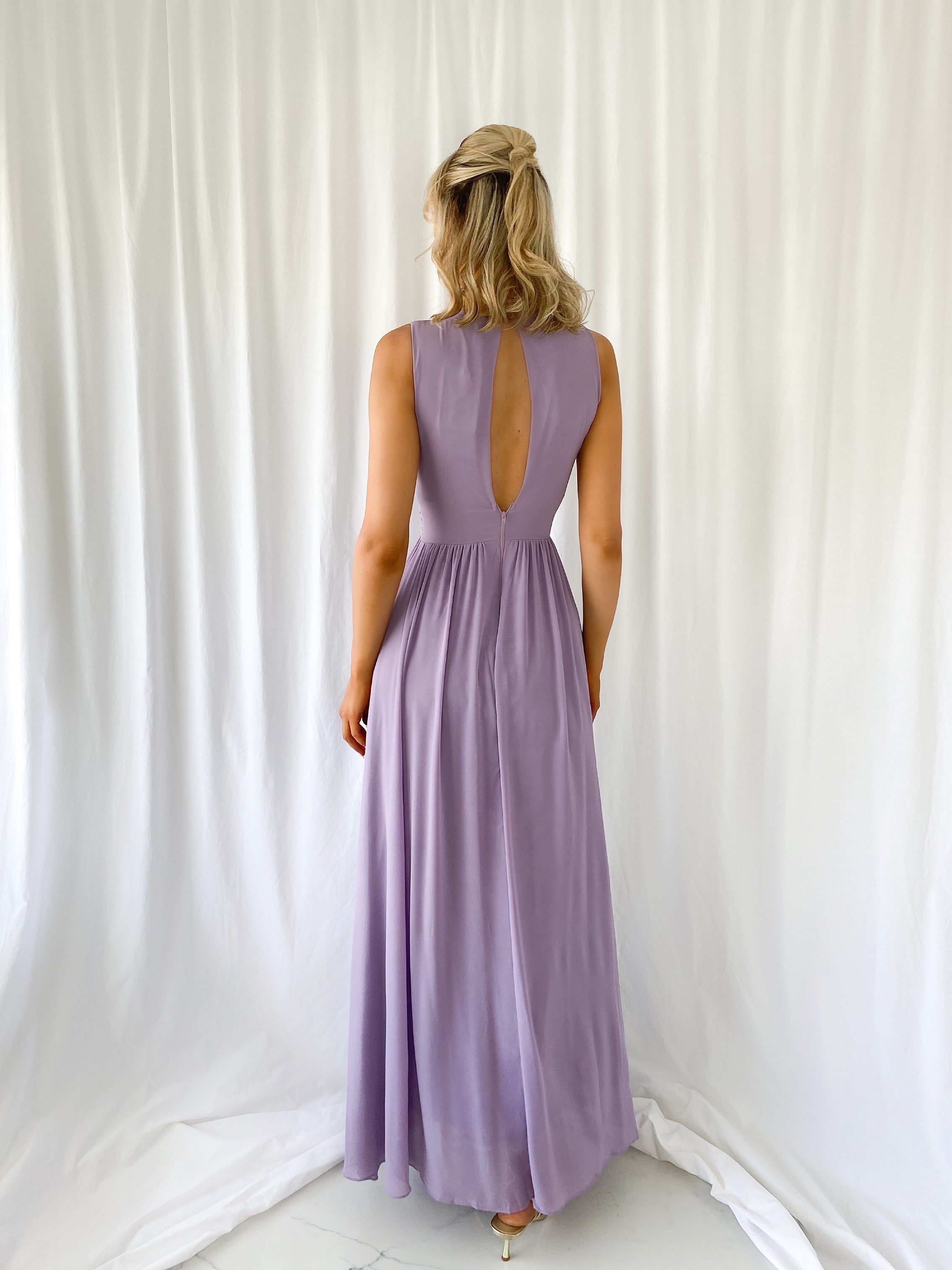 Edina Cut Out Maxi Dress – Lavender – open back – small fit Model 6ft – Size Small – UK8