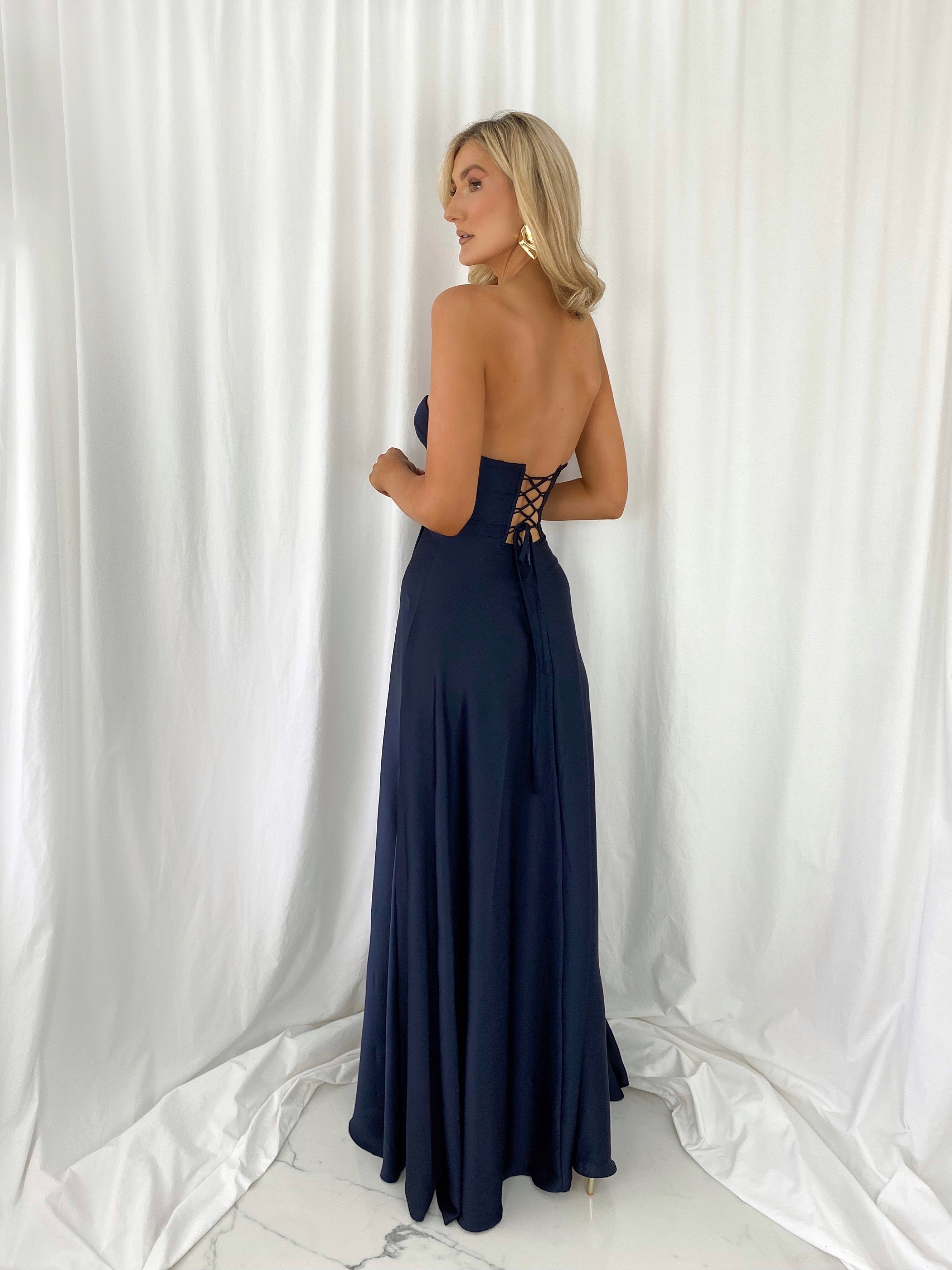 Emma Off The Shoulder Corset Dress – Navy – Font slit – Comes with stripy – Small fit Model 6ft – Size Small – UK8