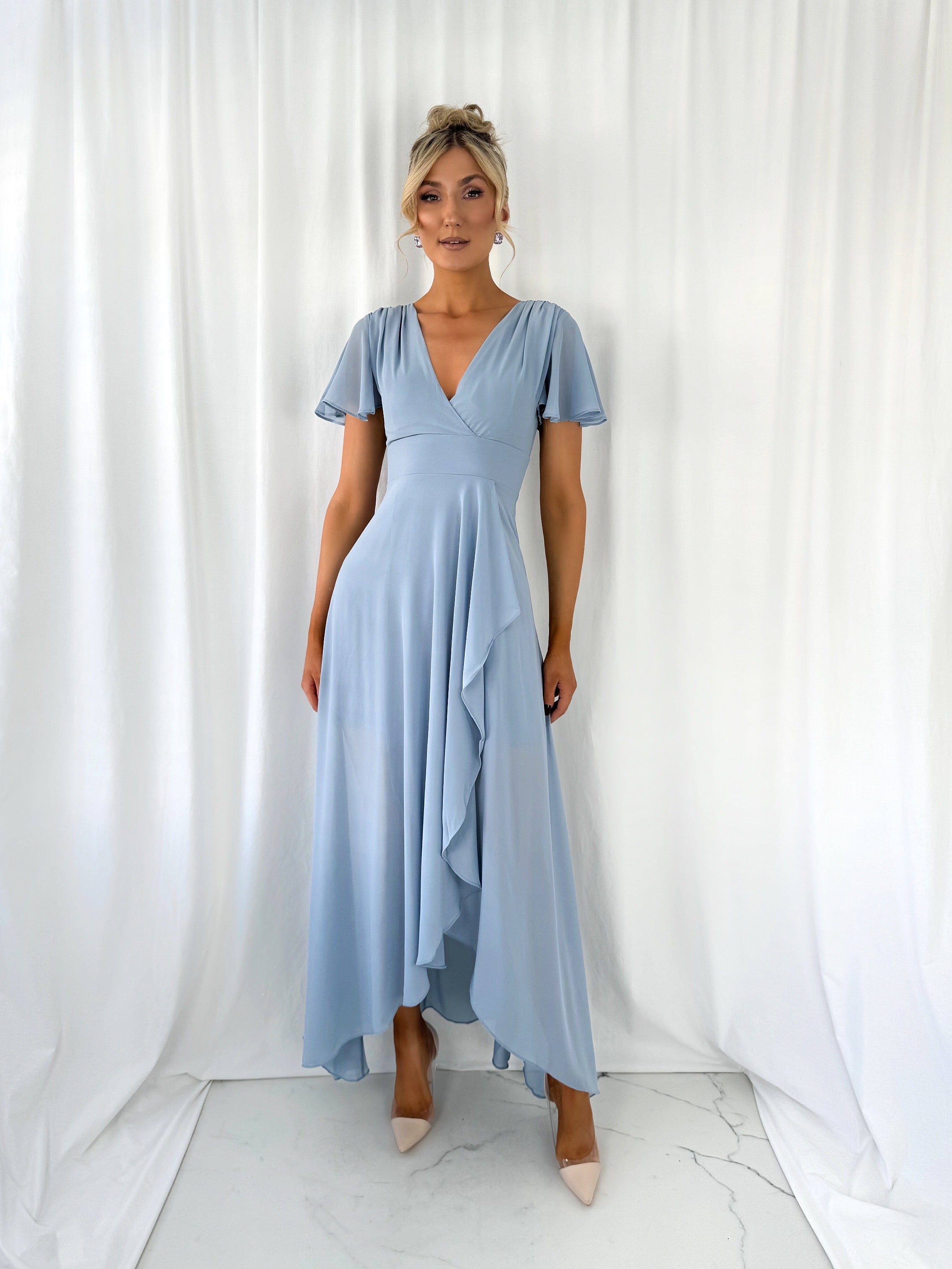 Gaya Ruffle Dress – Dusty Blue – short sleeves – lined Model 6ft – Size Small – UK8