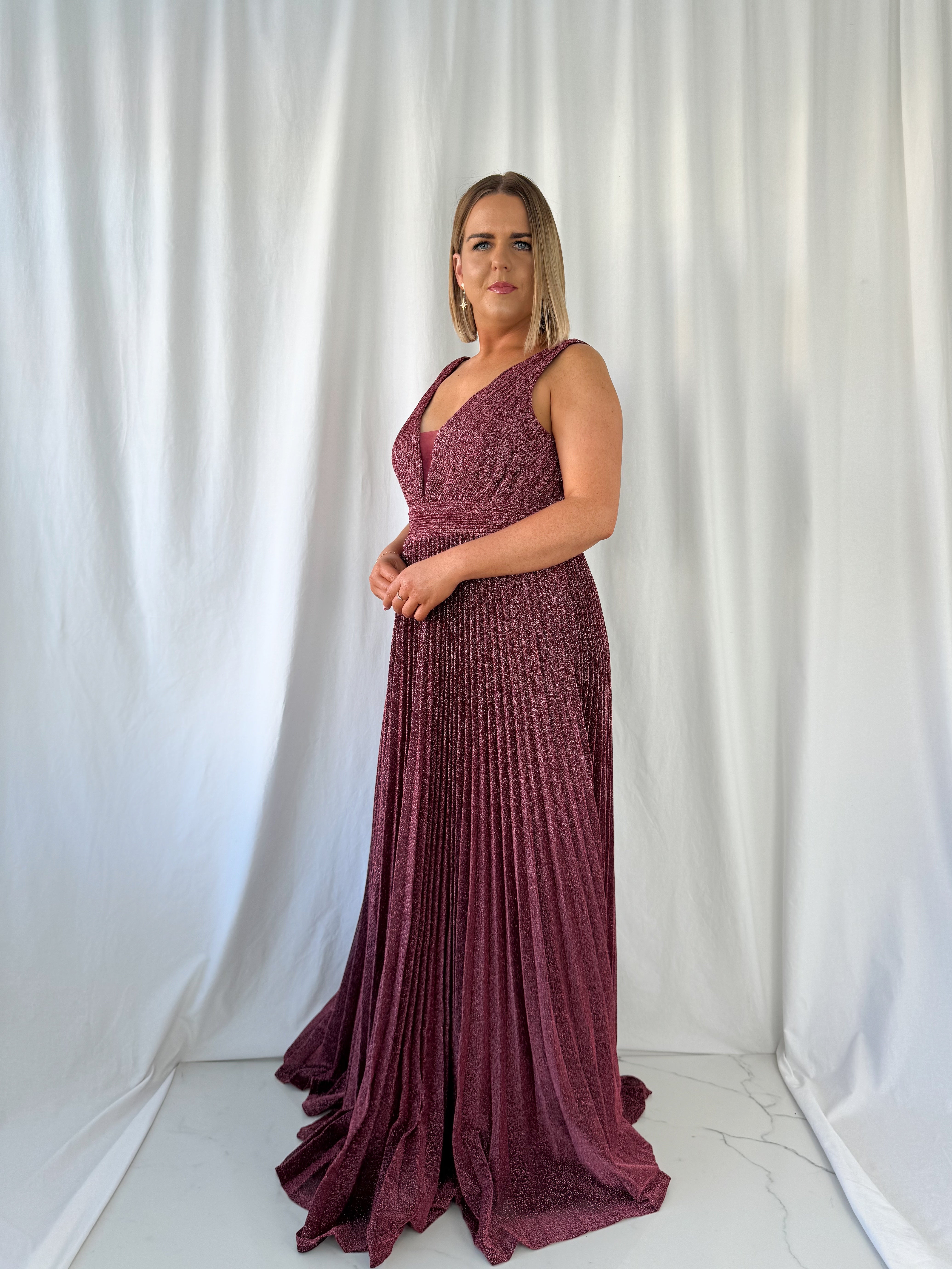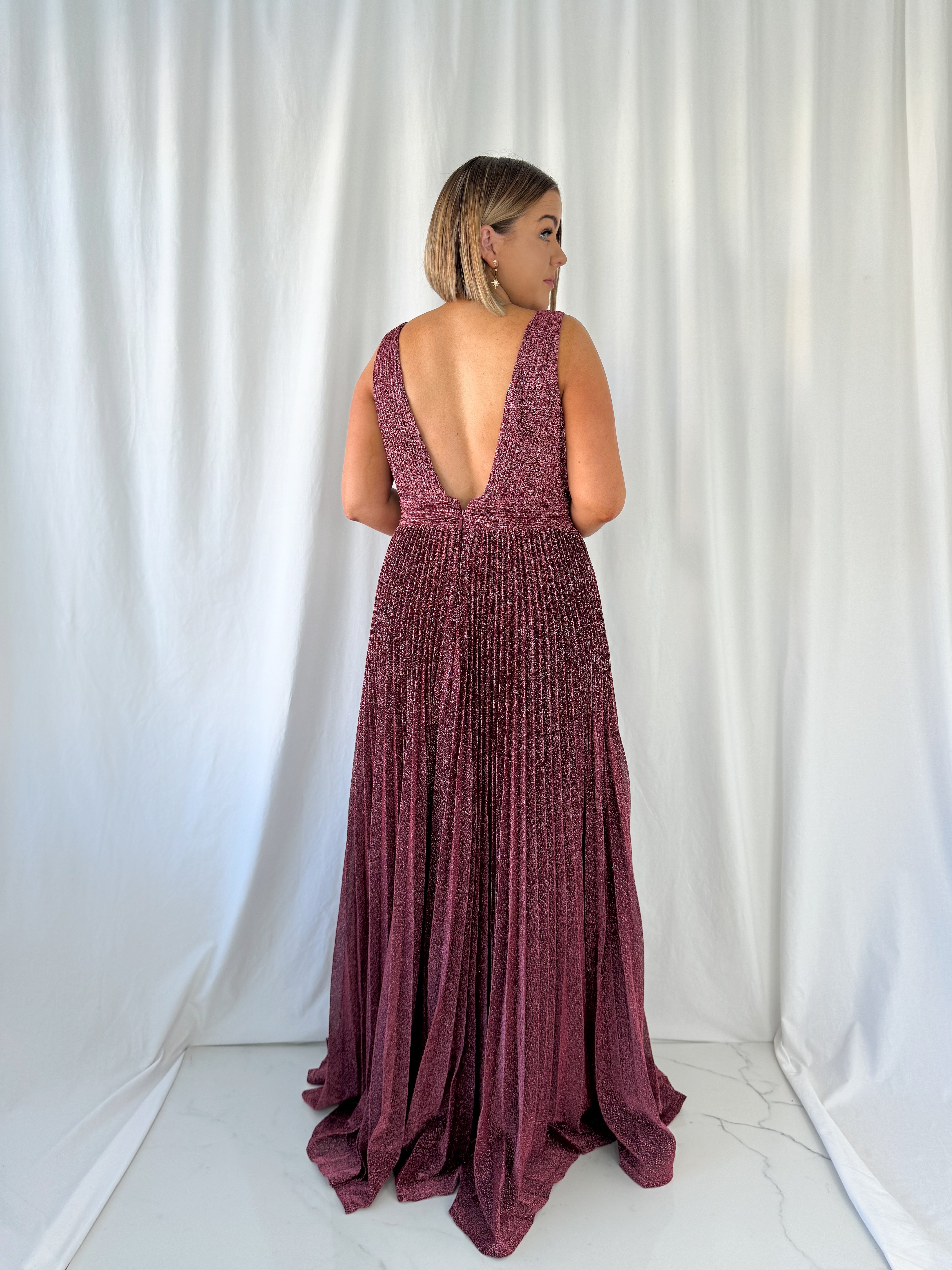 Joely Pleated Maxi Glitter Dress – Wine