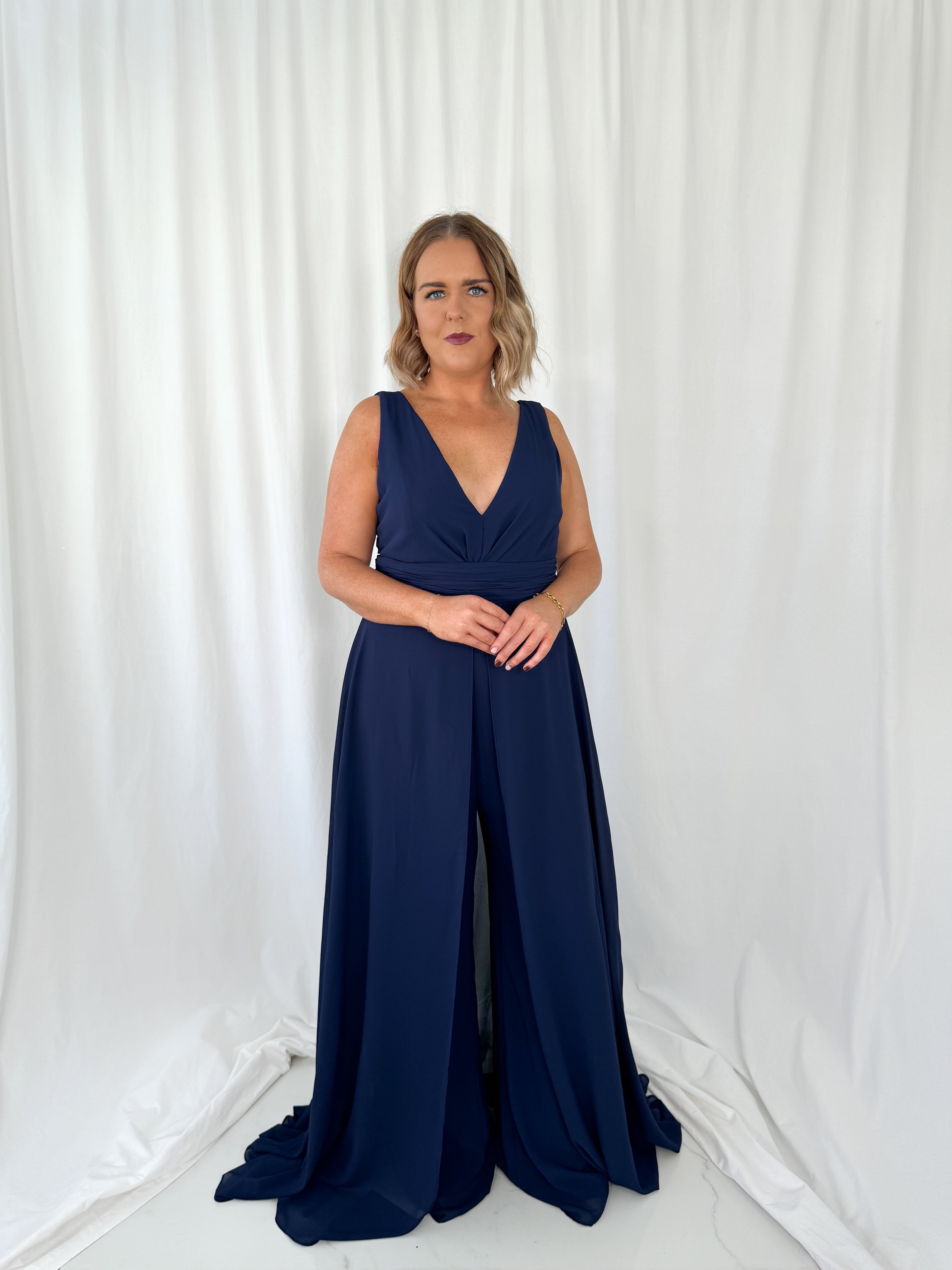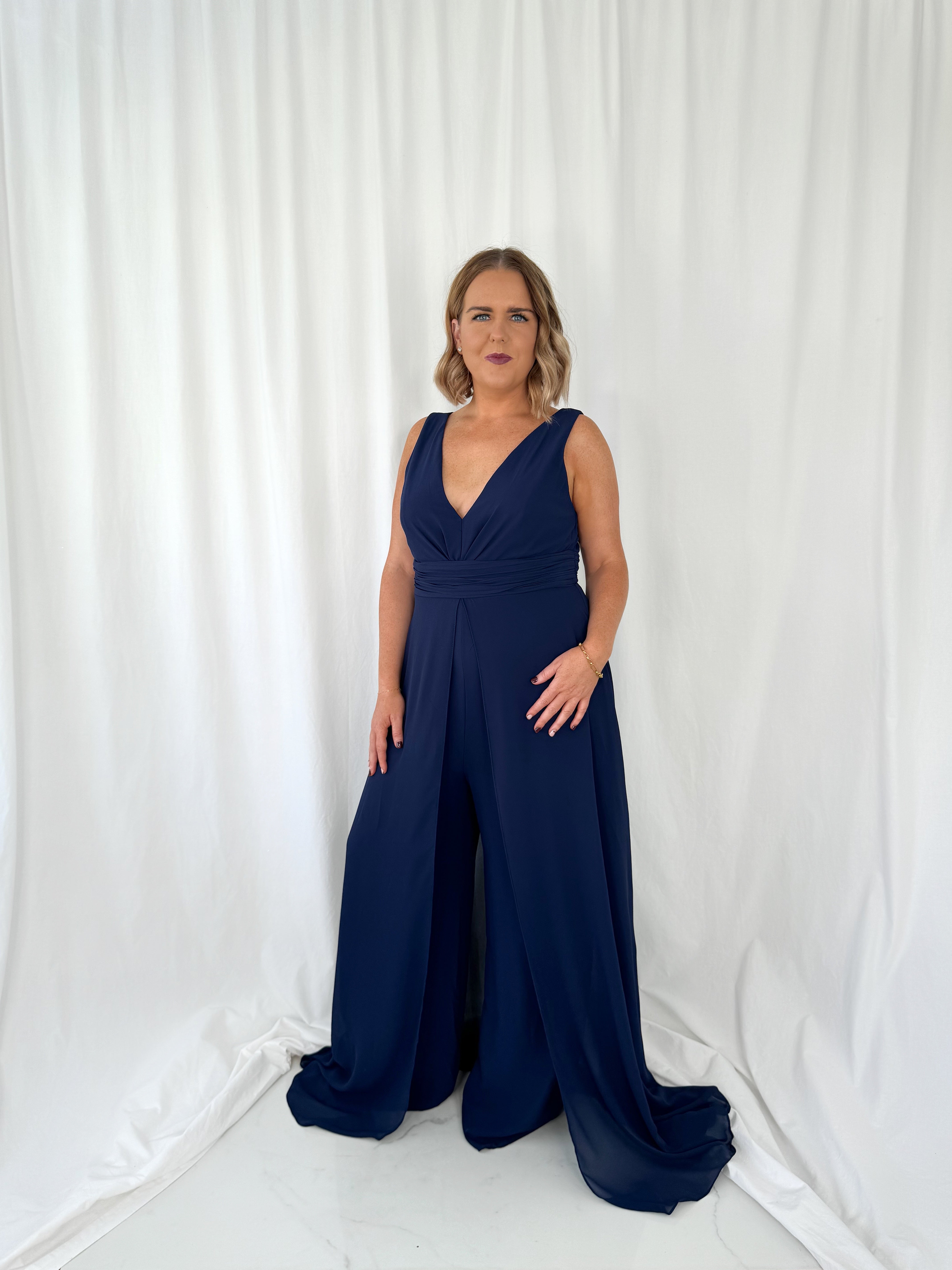 Curve Jumpsuit with a Cape – Navy Model Height is 5ft 2 Model wears size 42 42 – UK14 44 – UK16 46 – UK18 48 – UK20 50 – UK22