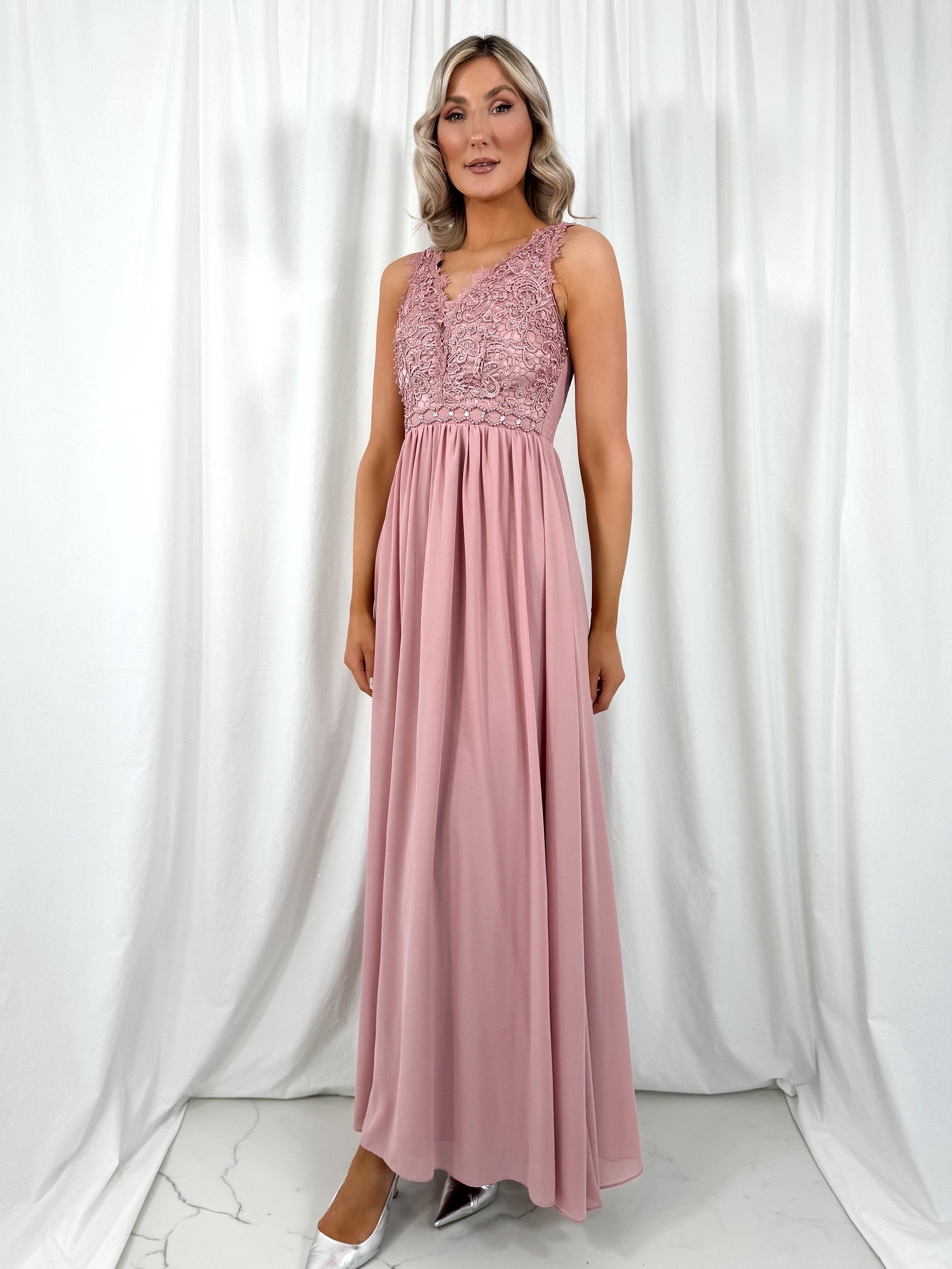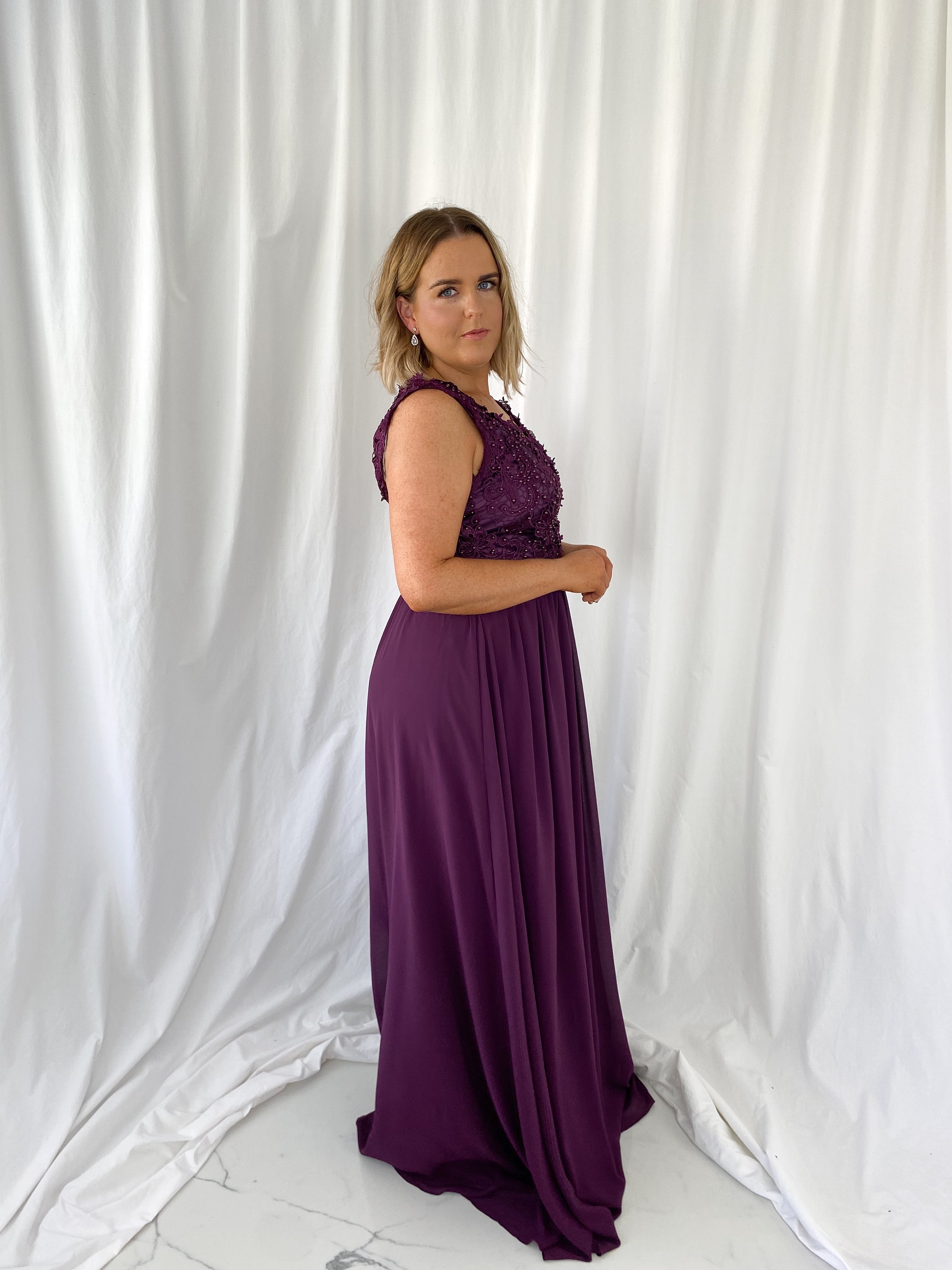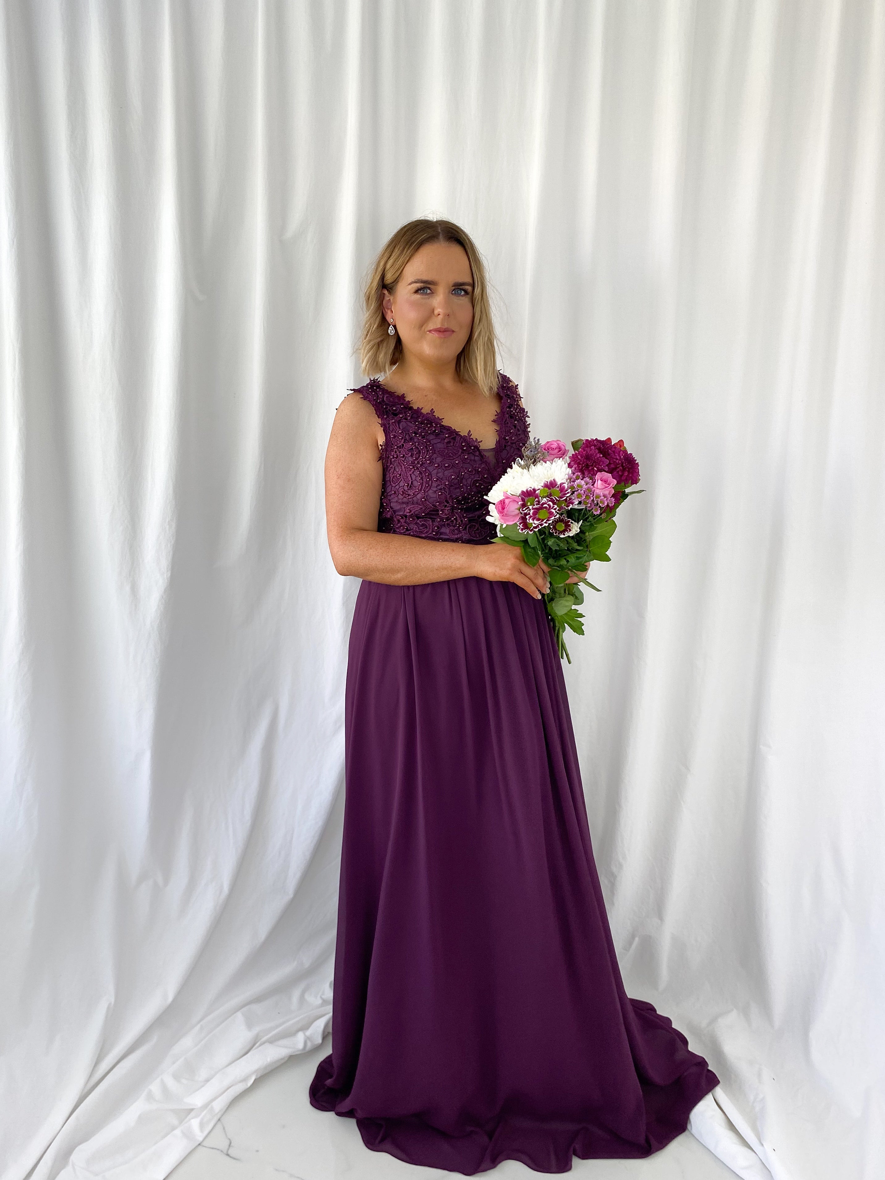 Laetitia Maxi Dress with Embroidered Top – Aubergine – Lined – Elasticated back Model Height is 5ft 2 Model wears size 42 42 – UK14 44 – UK16 46 – UK18 48 – UK20 50 – UK22