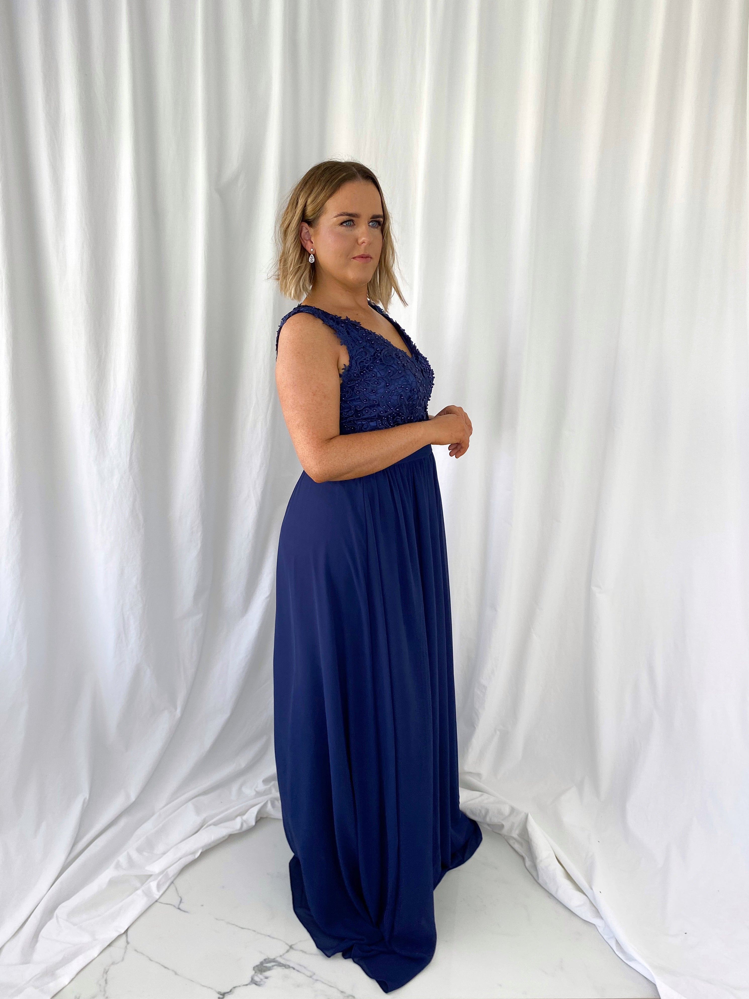 Laetitia Maxi Dress with Embroidered Top – Marine – Lined – Elasticated back Model Height is 5ft 2 Model wears size 42 42 – UK14 44 – UK16 46 – UK18 48 – UK20 50 – UK22