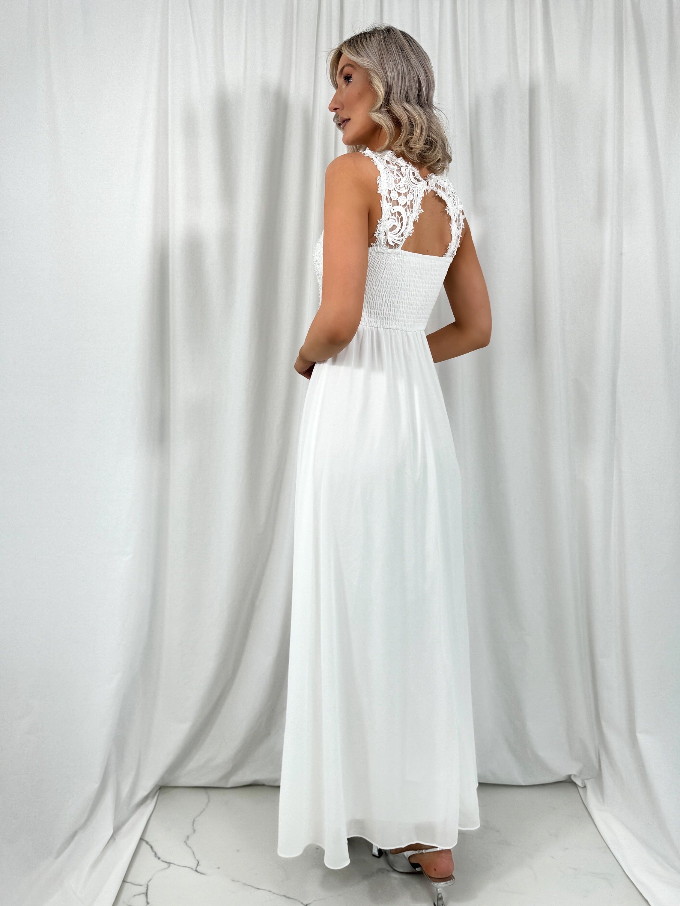 Laetitia Maxi Dress with Embroidered Top – White Lined Mesh – Elasticated back Model Height is 6ft 2 Model wears size 8