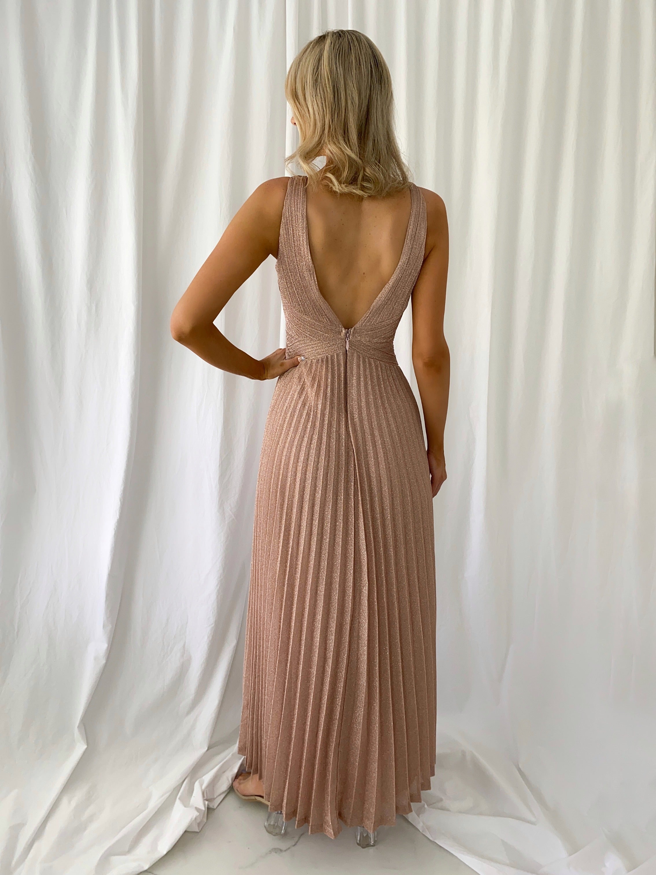 Madisson Pleated Maxi Glitter Dress – Rose Lined Dress Small fit Model 6ft – Size Small – UK8