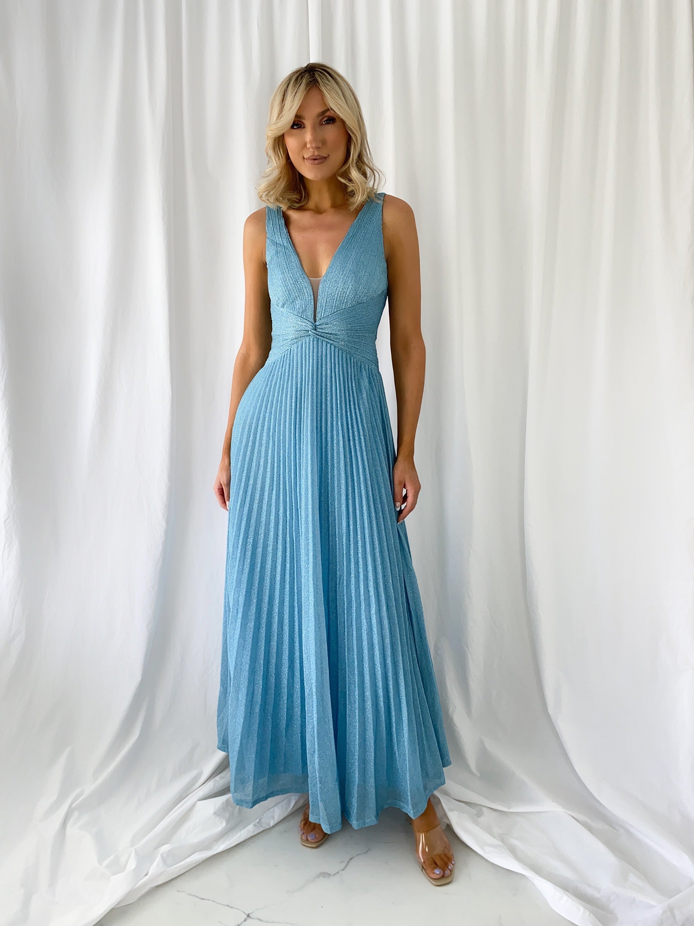 Madisson Pleated Maxi Glitter Dress – Sky Blue Lined Dress Small fit Model 6ft – Size Small – UK8