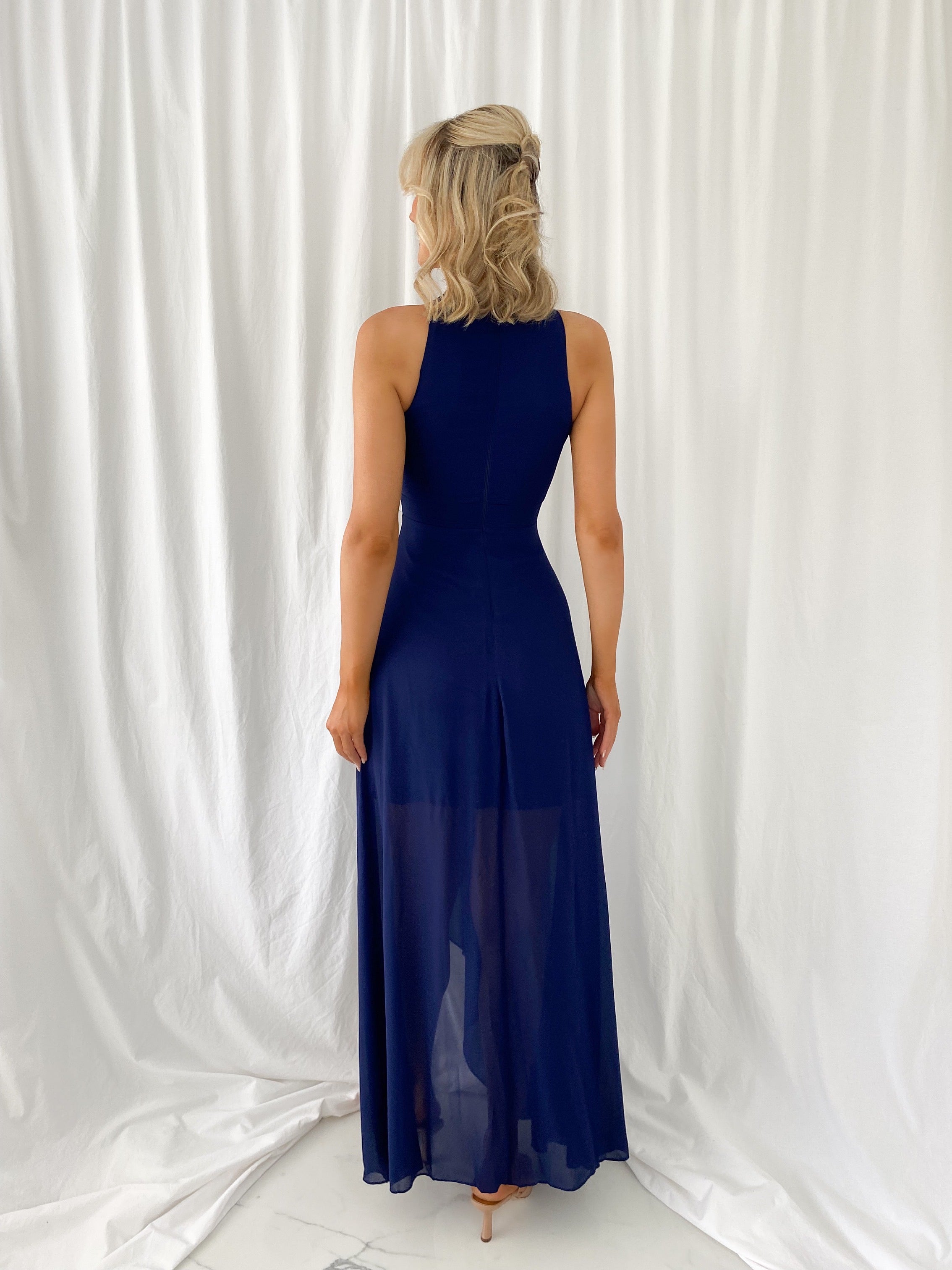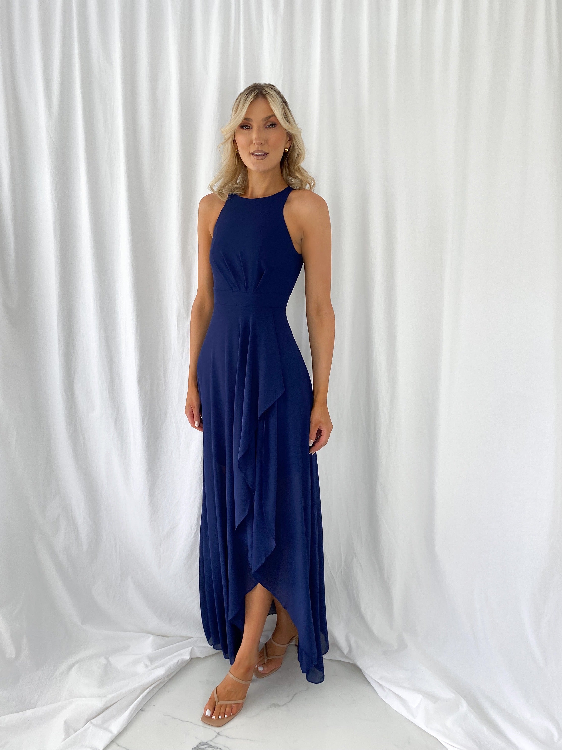 Maria Maxi Dress with Ruffle Skirt – Marine – Back Zipper – Lined – Small fit Model 6ft – Size Small – UK8