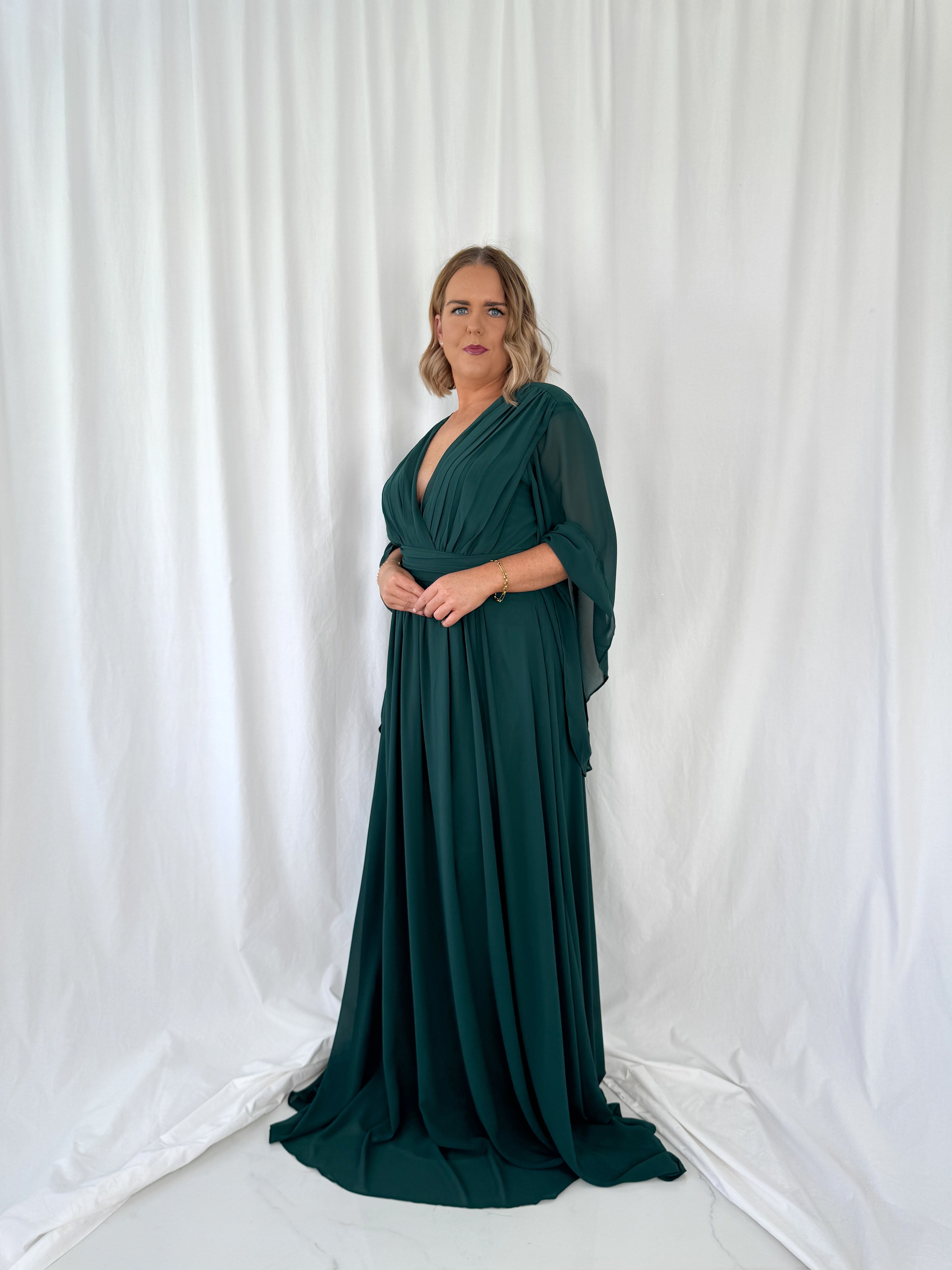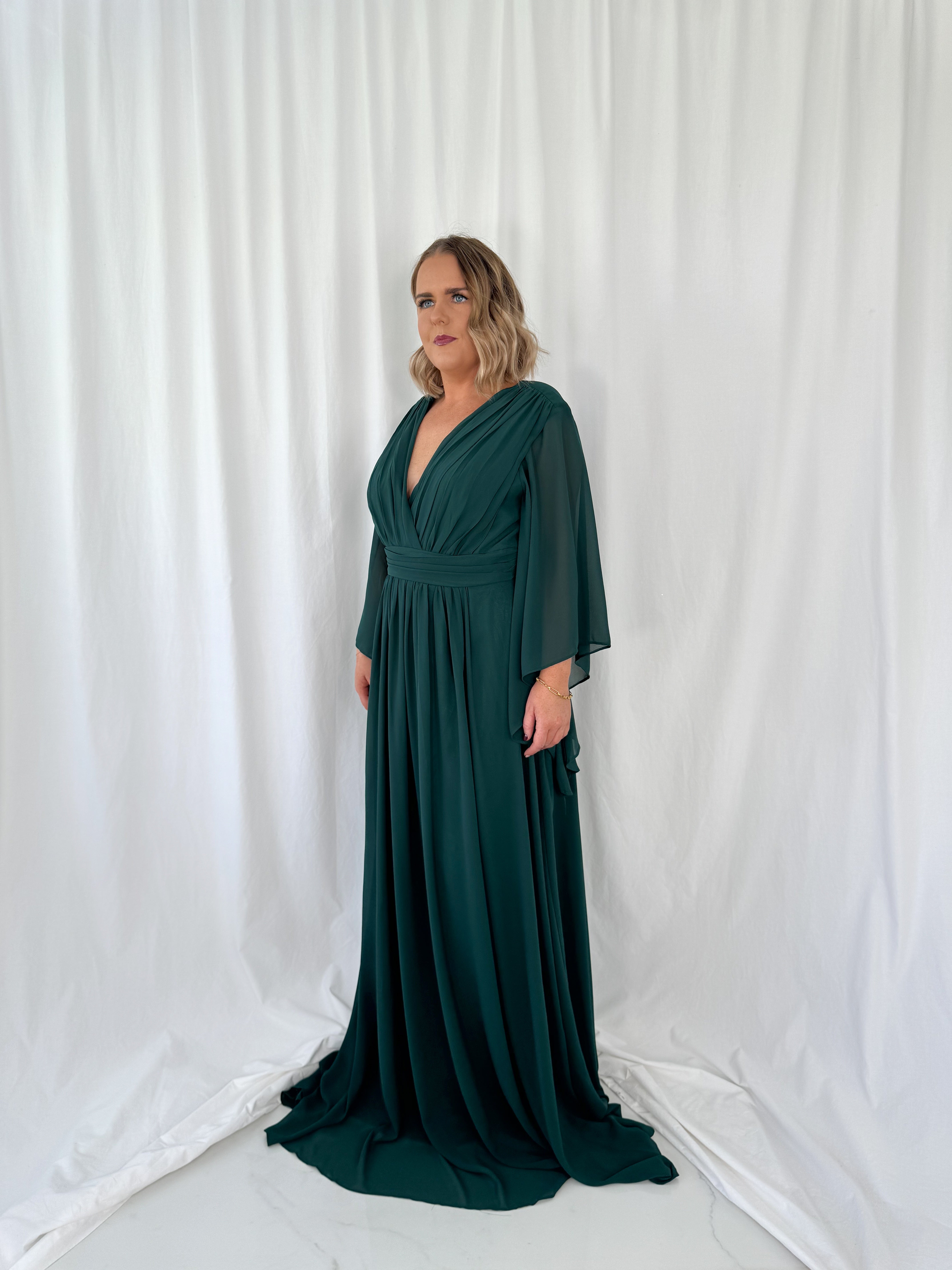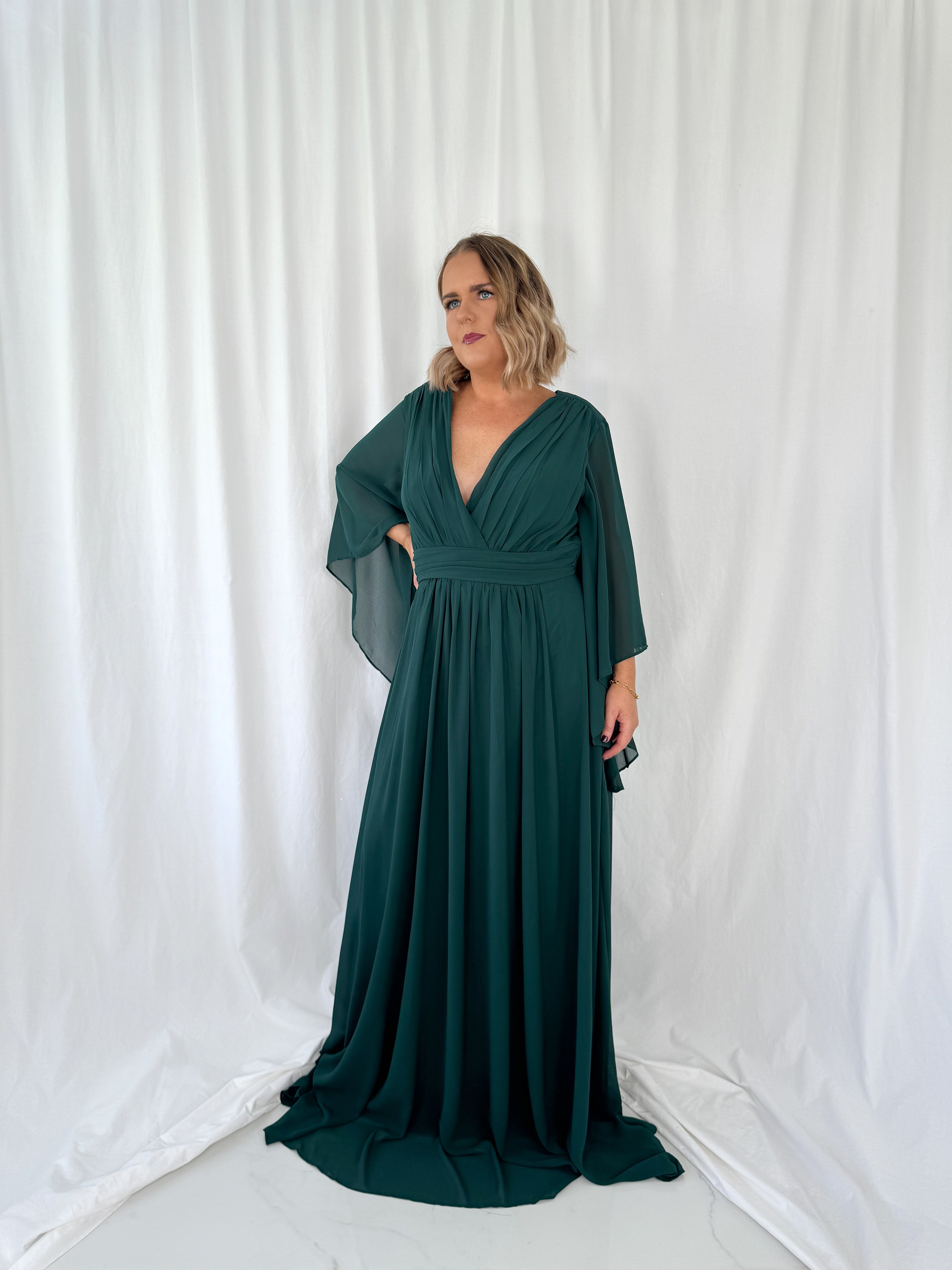 Marthe Bell Sleeves Curve Dress – Green Elastic Waist Model Height is 5ft 2 Model wears size 42 42 – UK14 44 – UK16 46 – UK18 48 – UK20 50 – UK22
