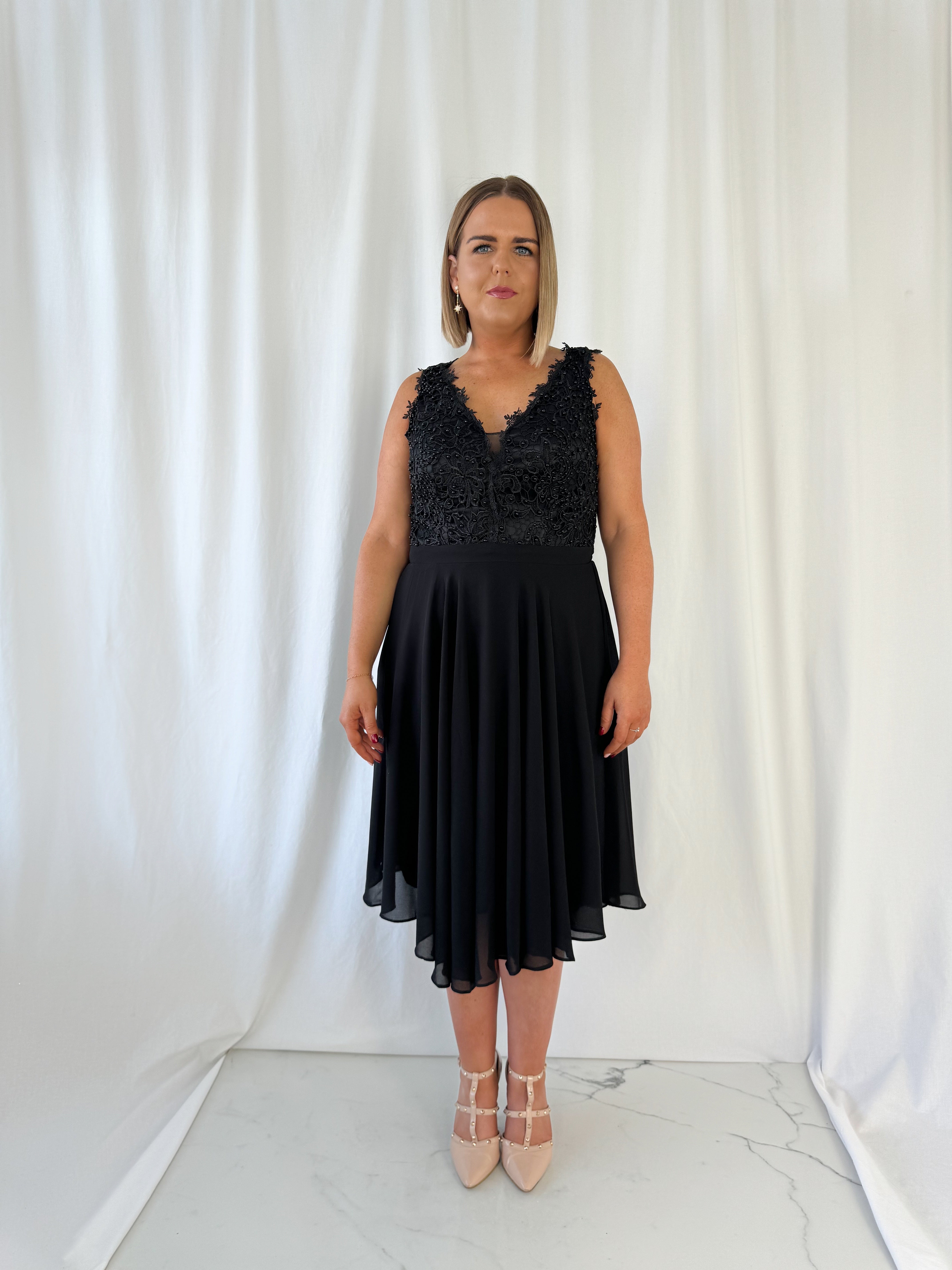 Mathie Embroidered Top Short Curve Dress – Black Lined Dress Open Back Model wears size 42 42 – UK14 44 – UK16 46 – UK18 48 – UK20 50 – UK22