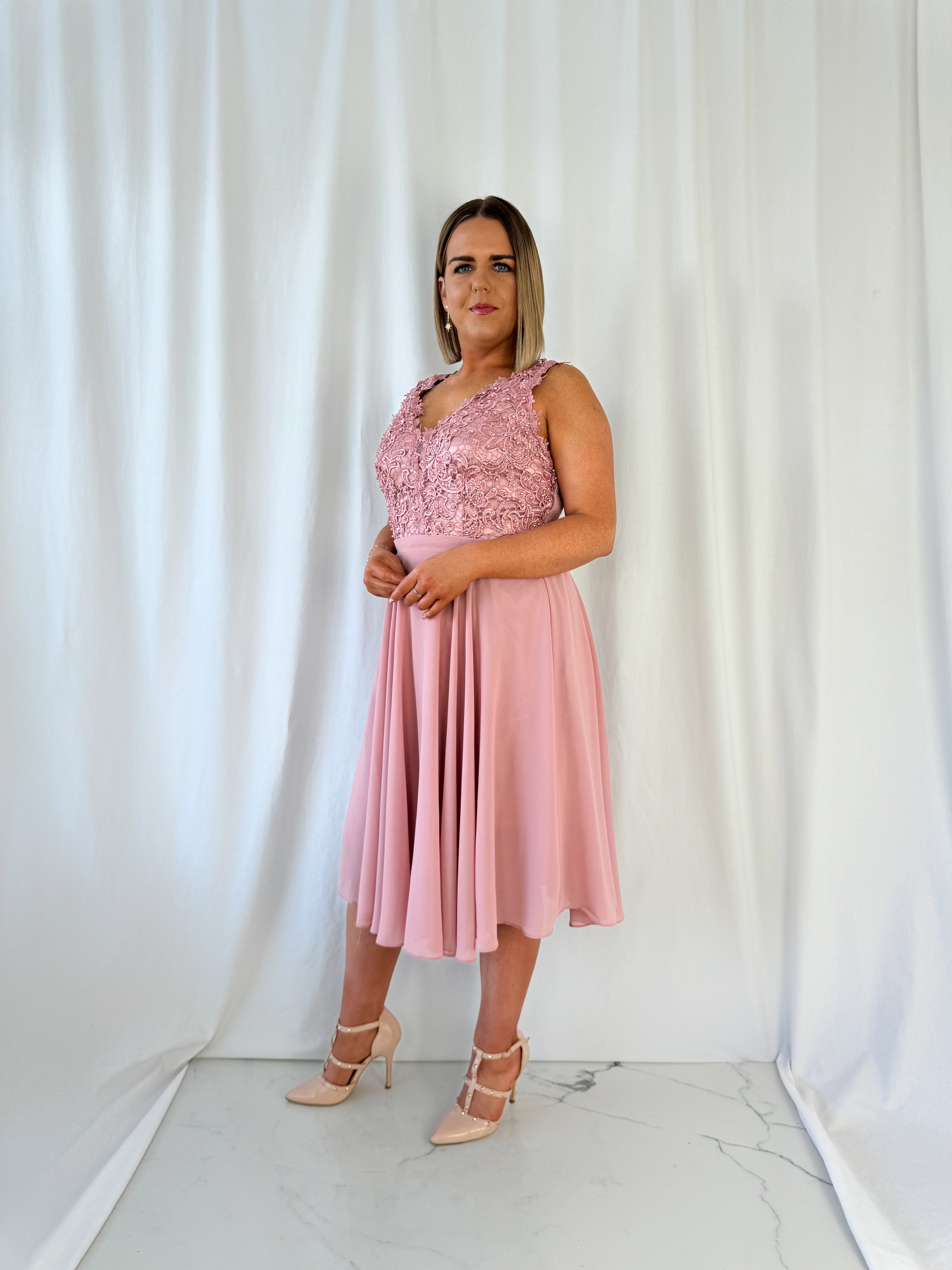 Mathie Embroidered Top Short Curve Dress – Old Rose Lined Dress Open Back Model wears size 42 42 – UK14 44 – UK16 46 – UK18 48 – UK20 50 – UK22