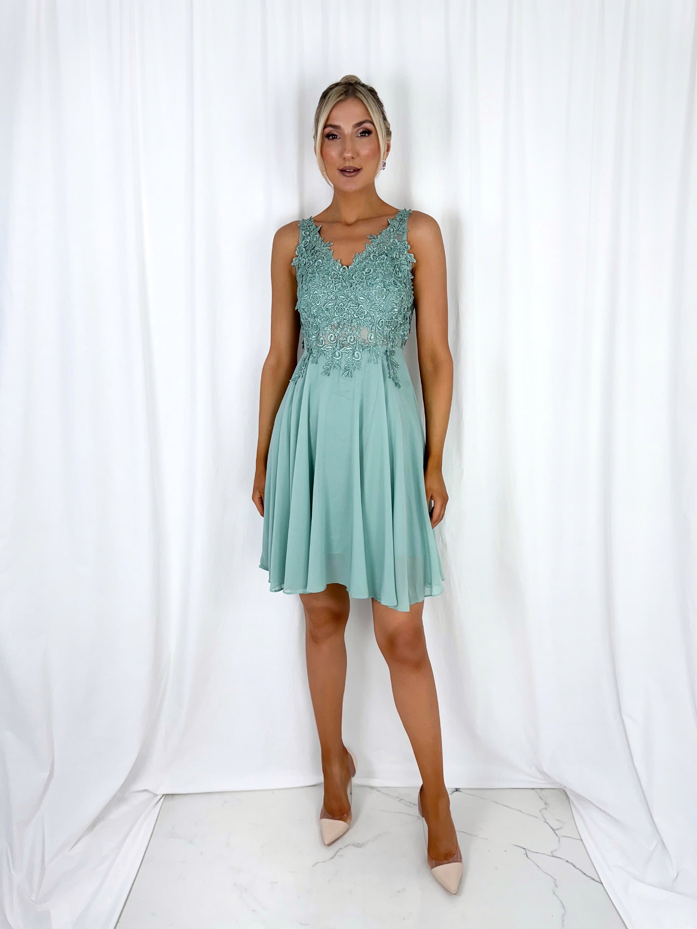 Mathie Embroidered Top Short Dress – Sage Green – Lined – Open Back Model 6ft – Size Small – UK8