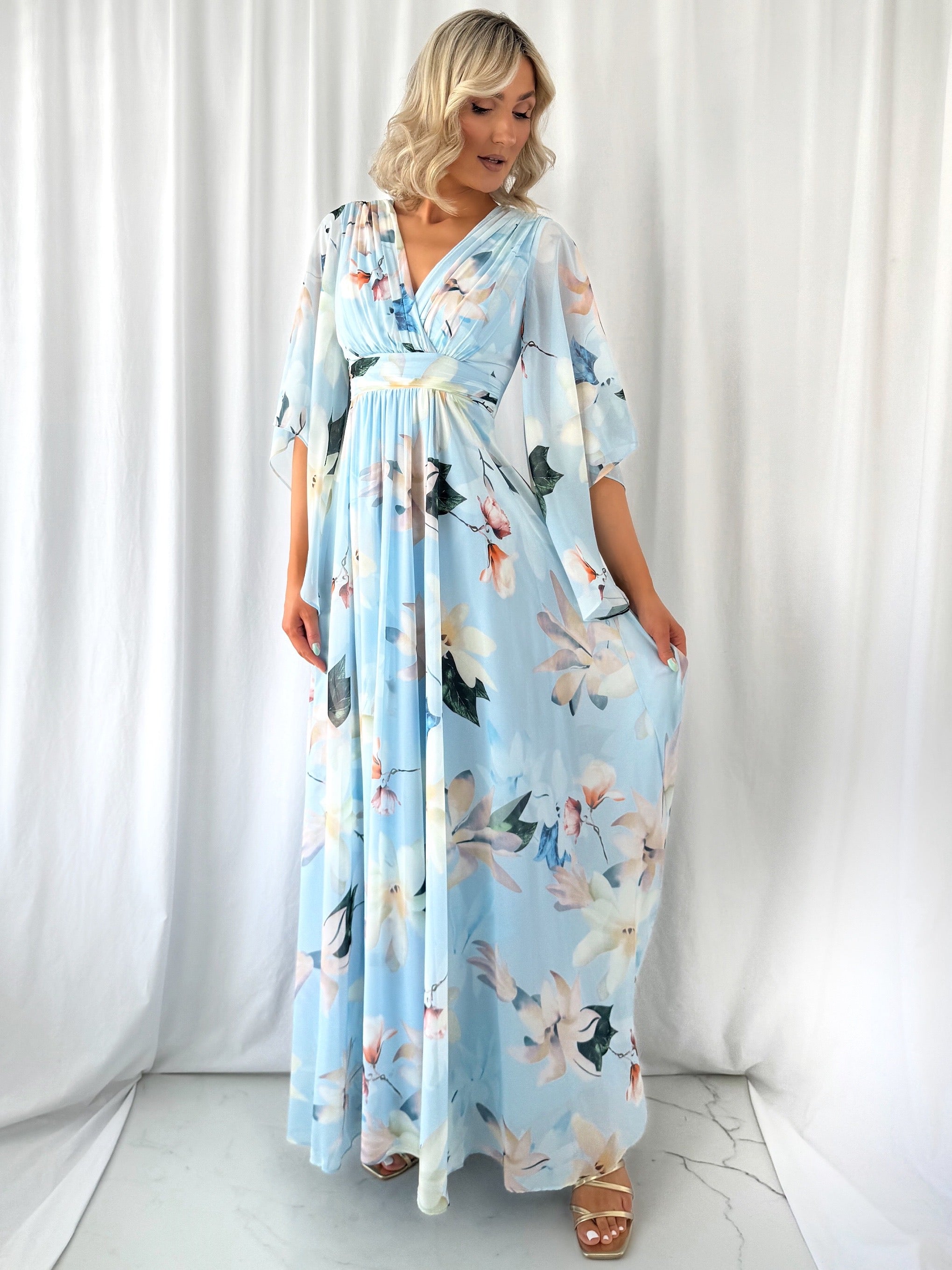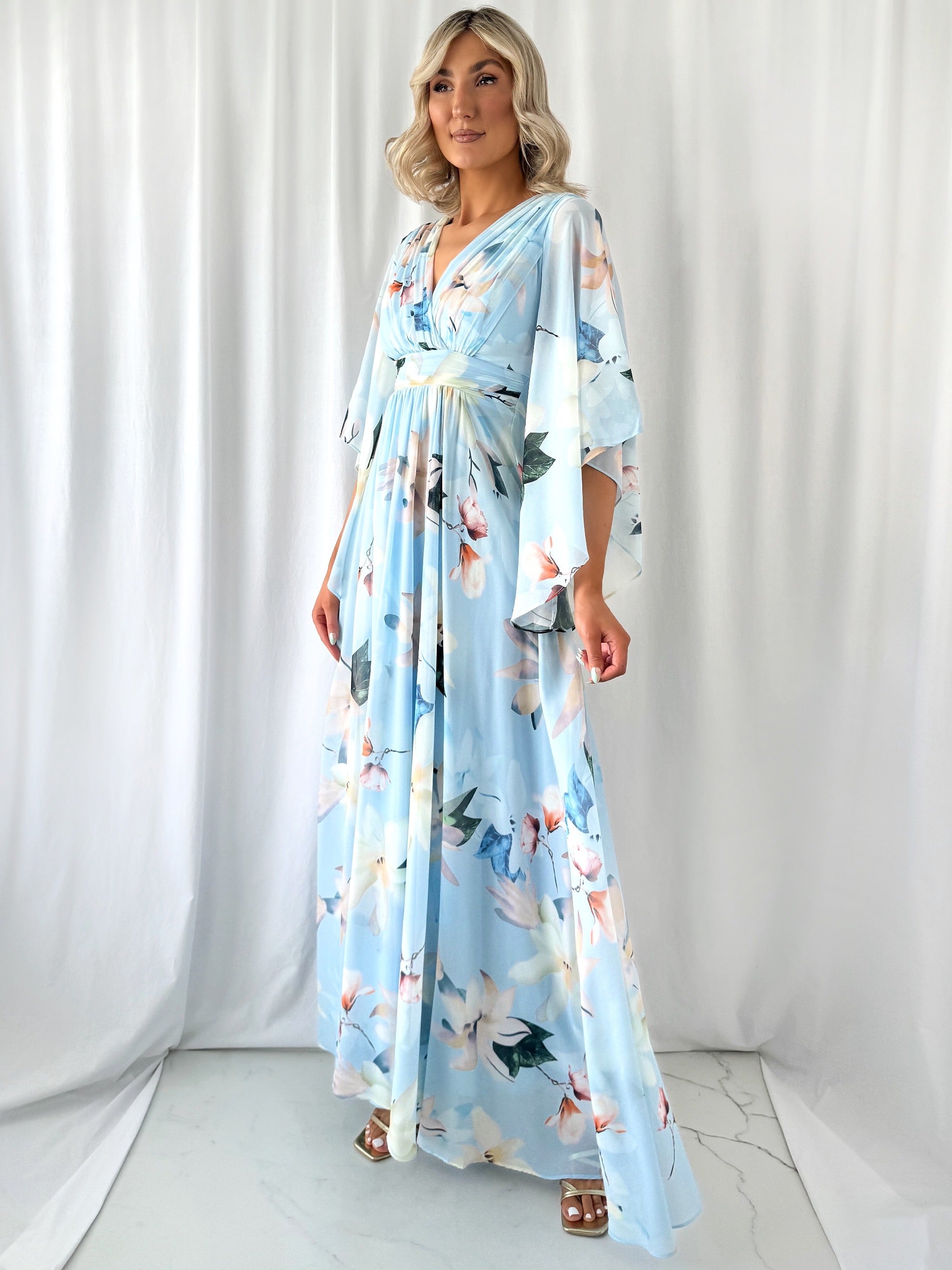Natalia Maxi Floral Dress with Bell Sleeves – Light Blue Model 6ft – Size Small – UK8