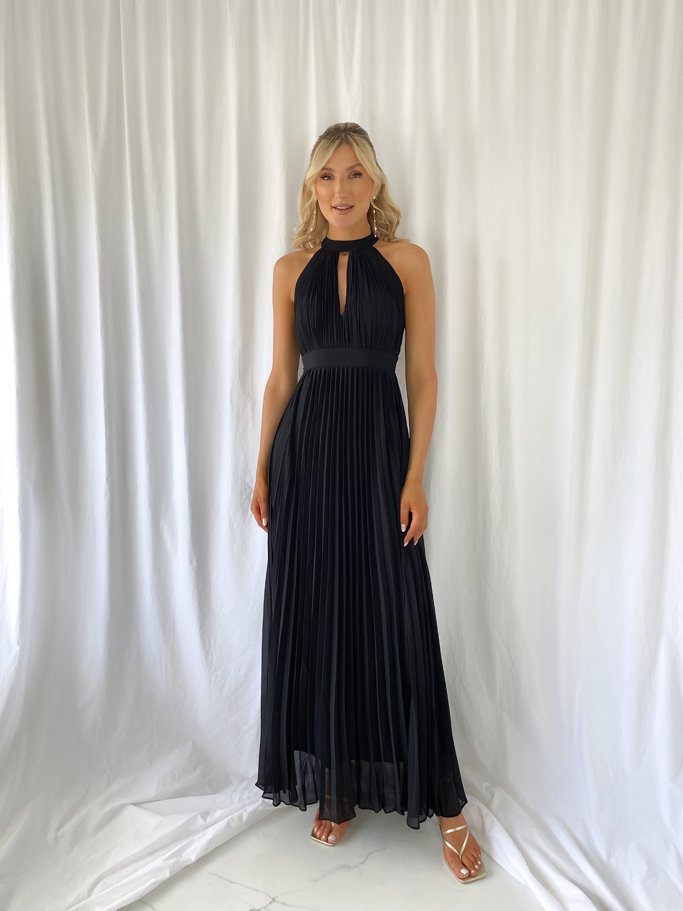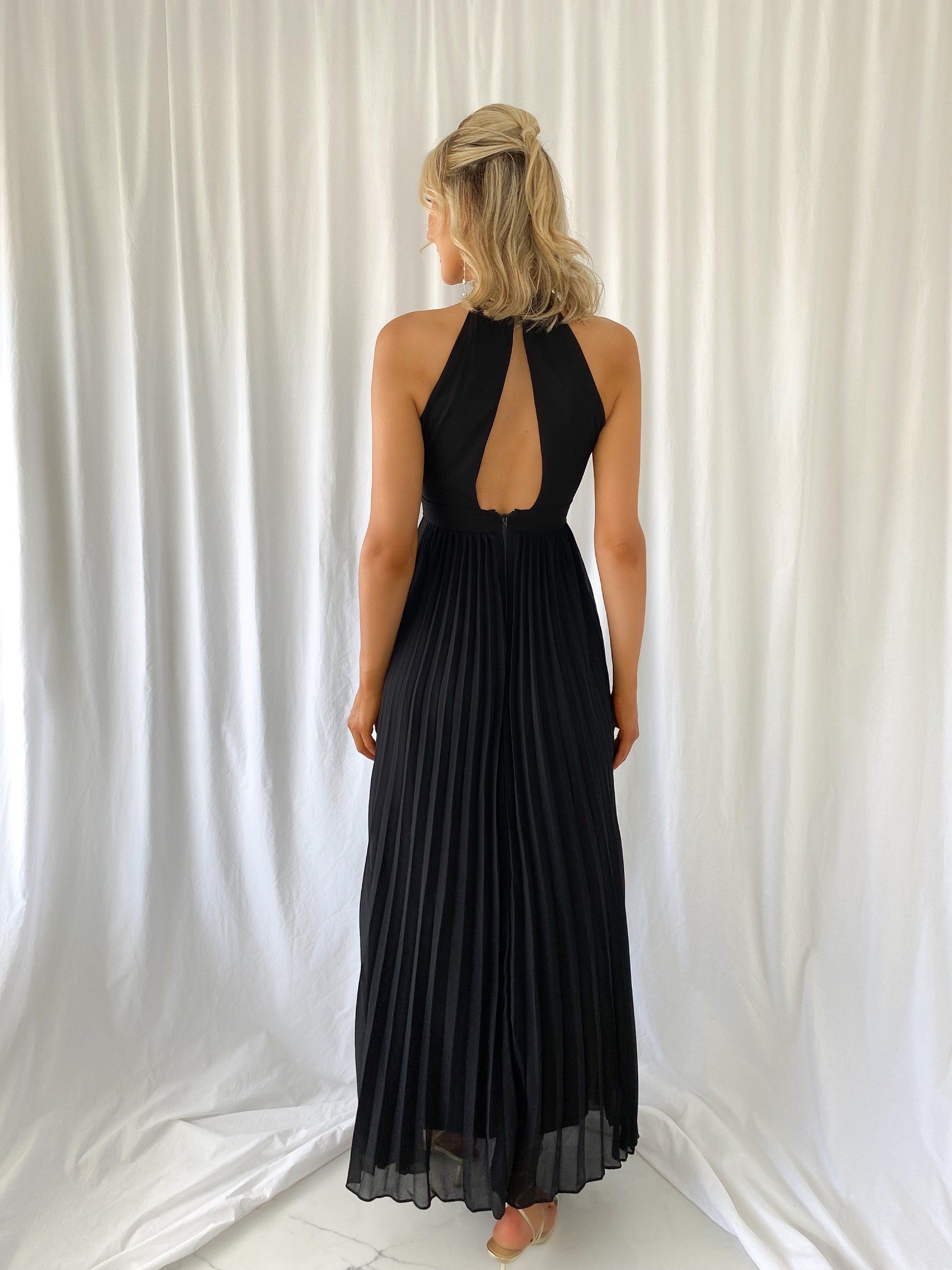 Roxy Pleated Maxi Dress – Black – key hole – open back Model 6ft – Size Small – UK8
