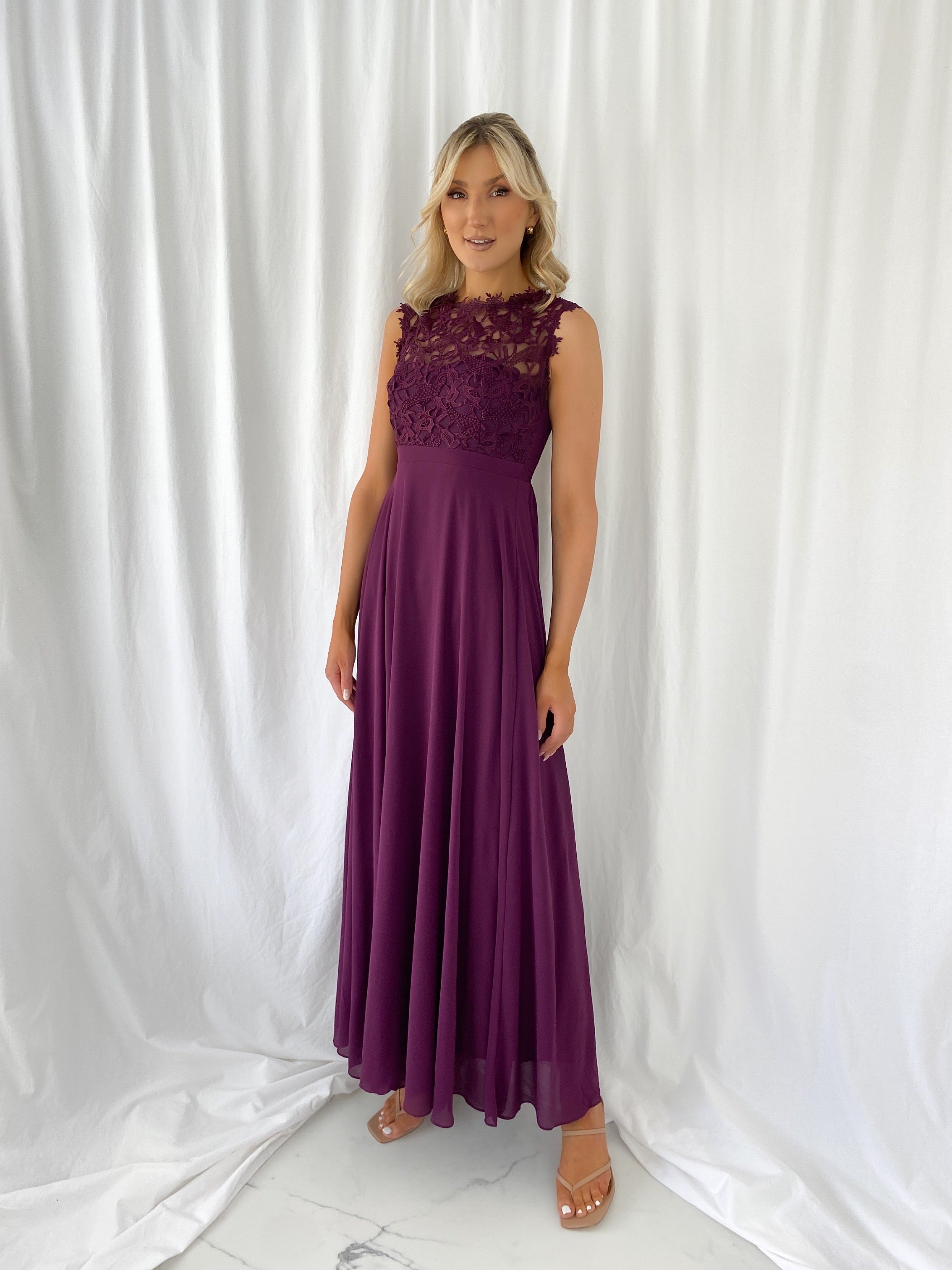 Savina Maxi Dress with Embroidered Top – Aubergine
