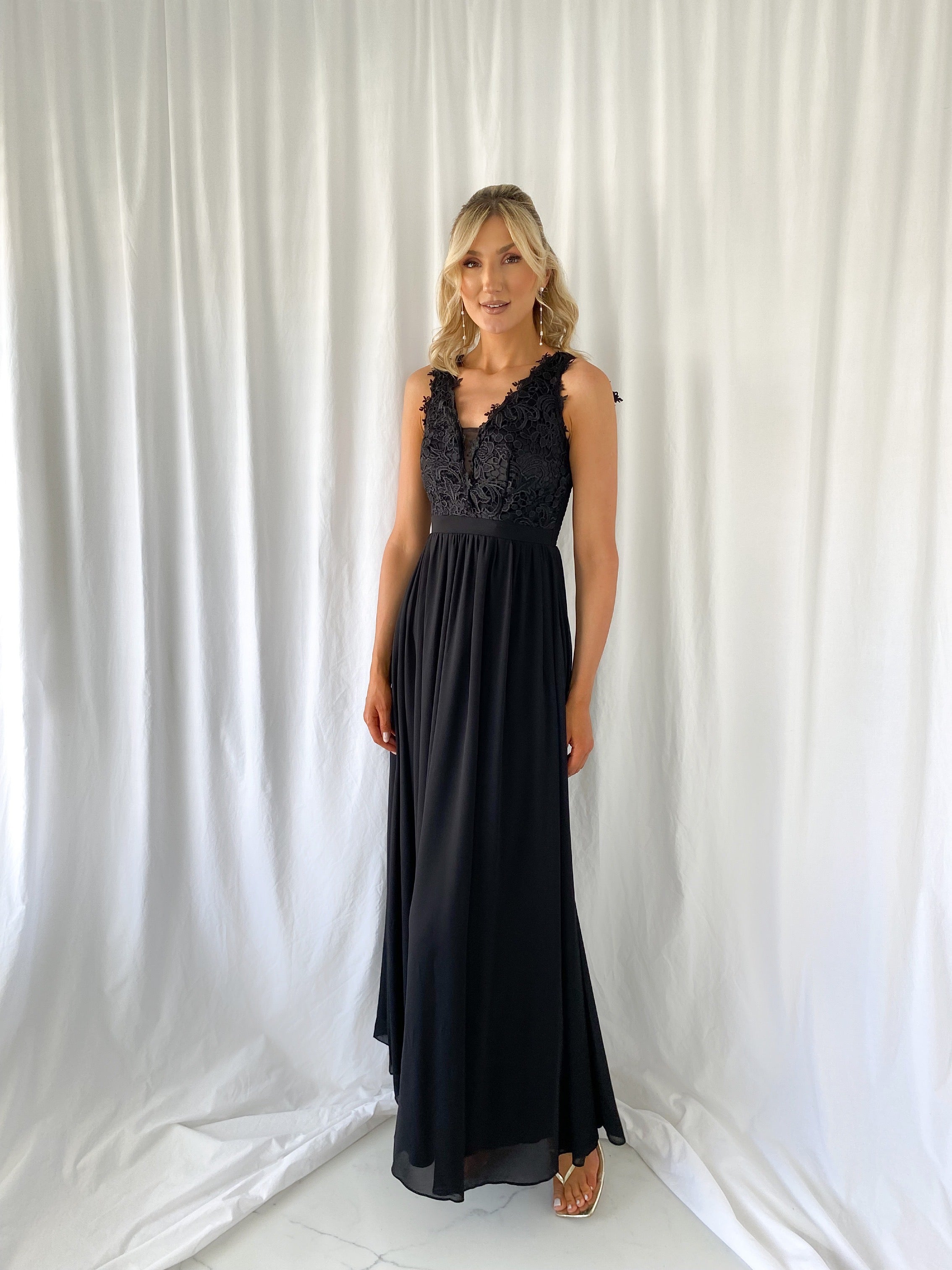 Telma Broderie Top Pleated Maxi Dress – Black