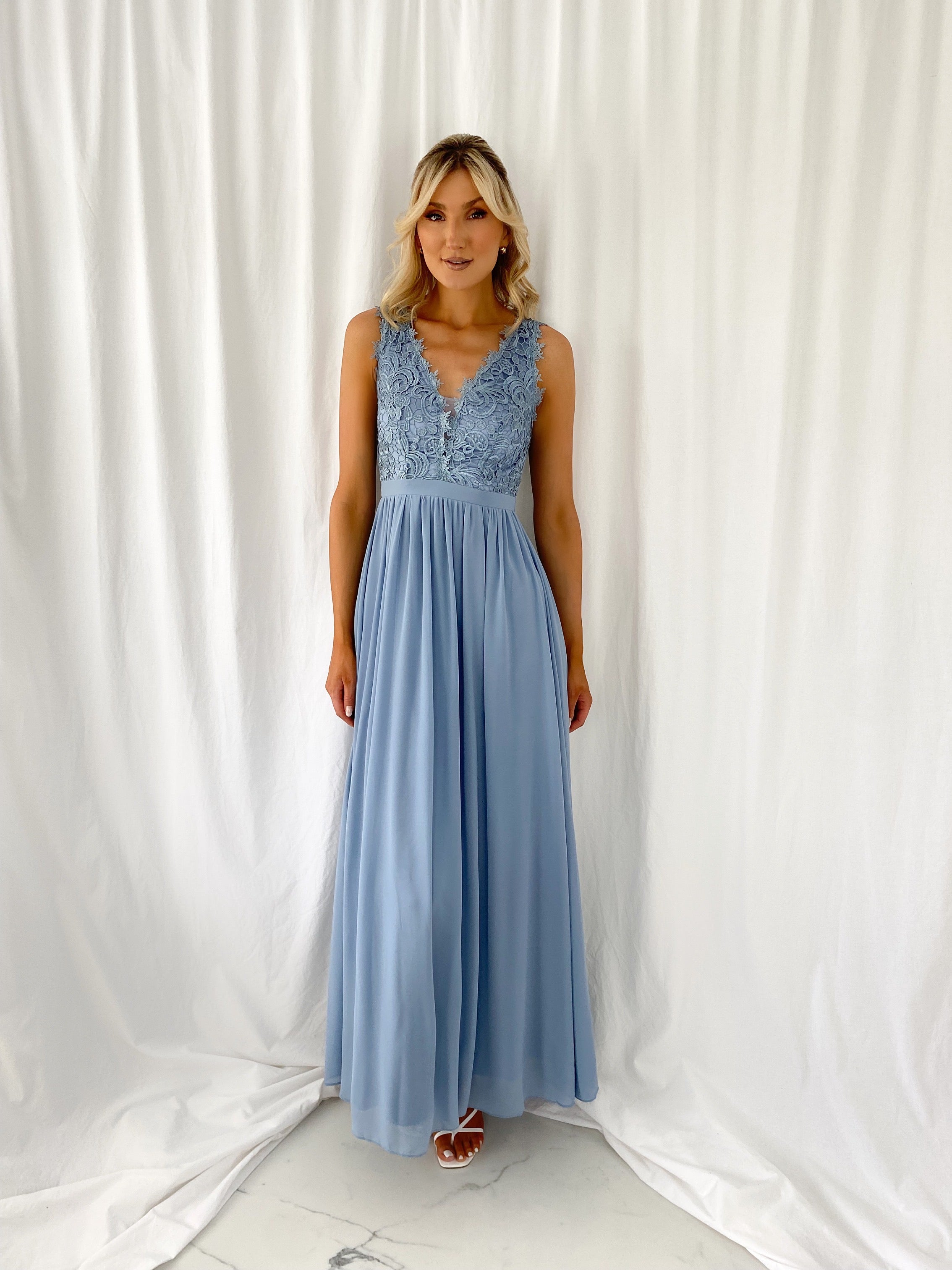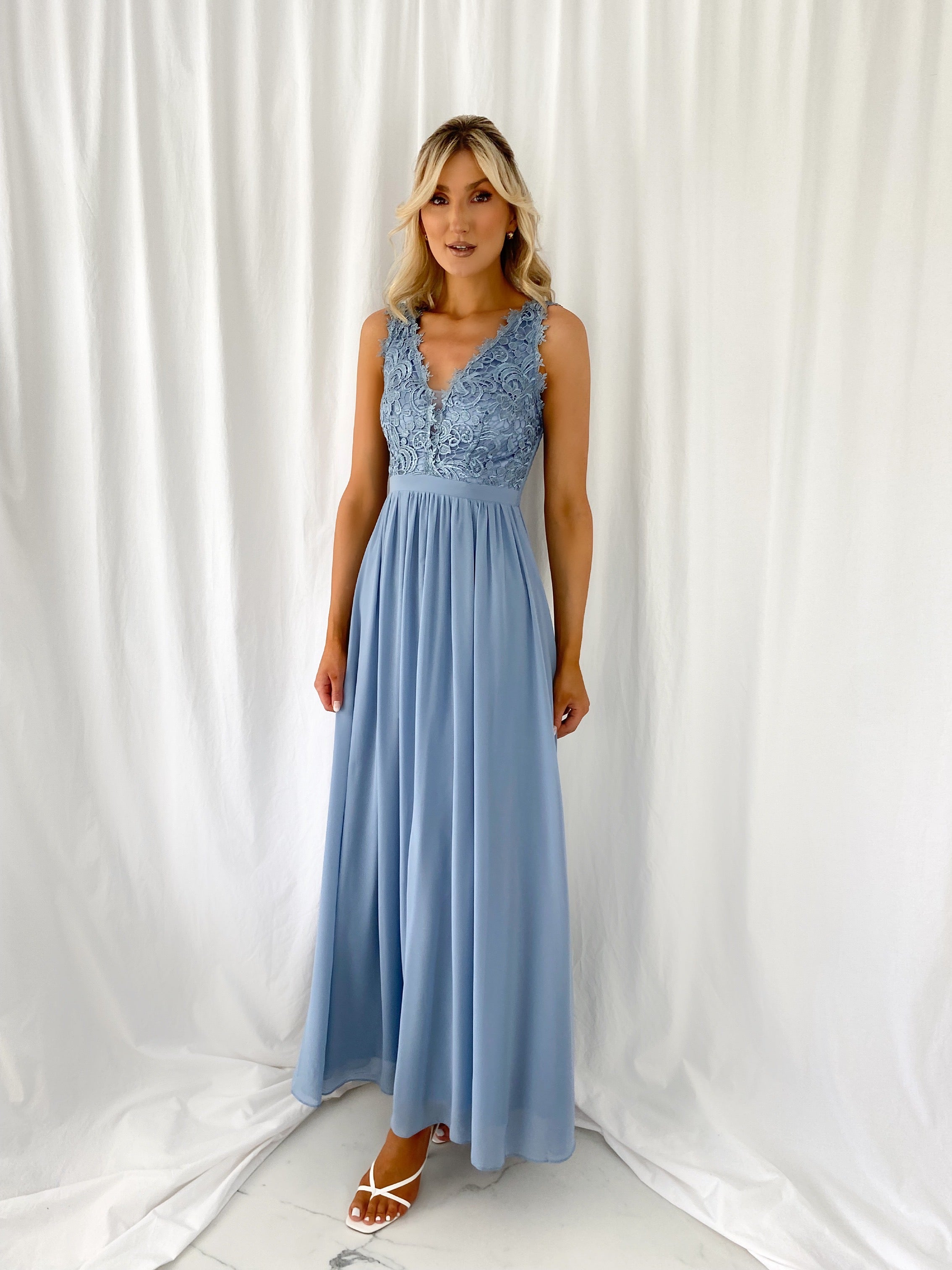 Telma Broderie Top Pleated Maxi Dress – Light Blue – Elasticated back – Small fit Model 6ft – Size Small – UK8