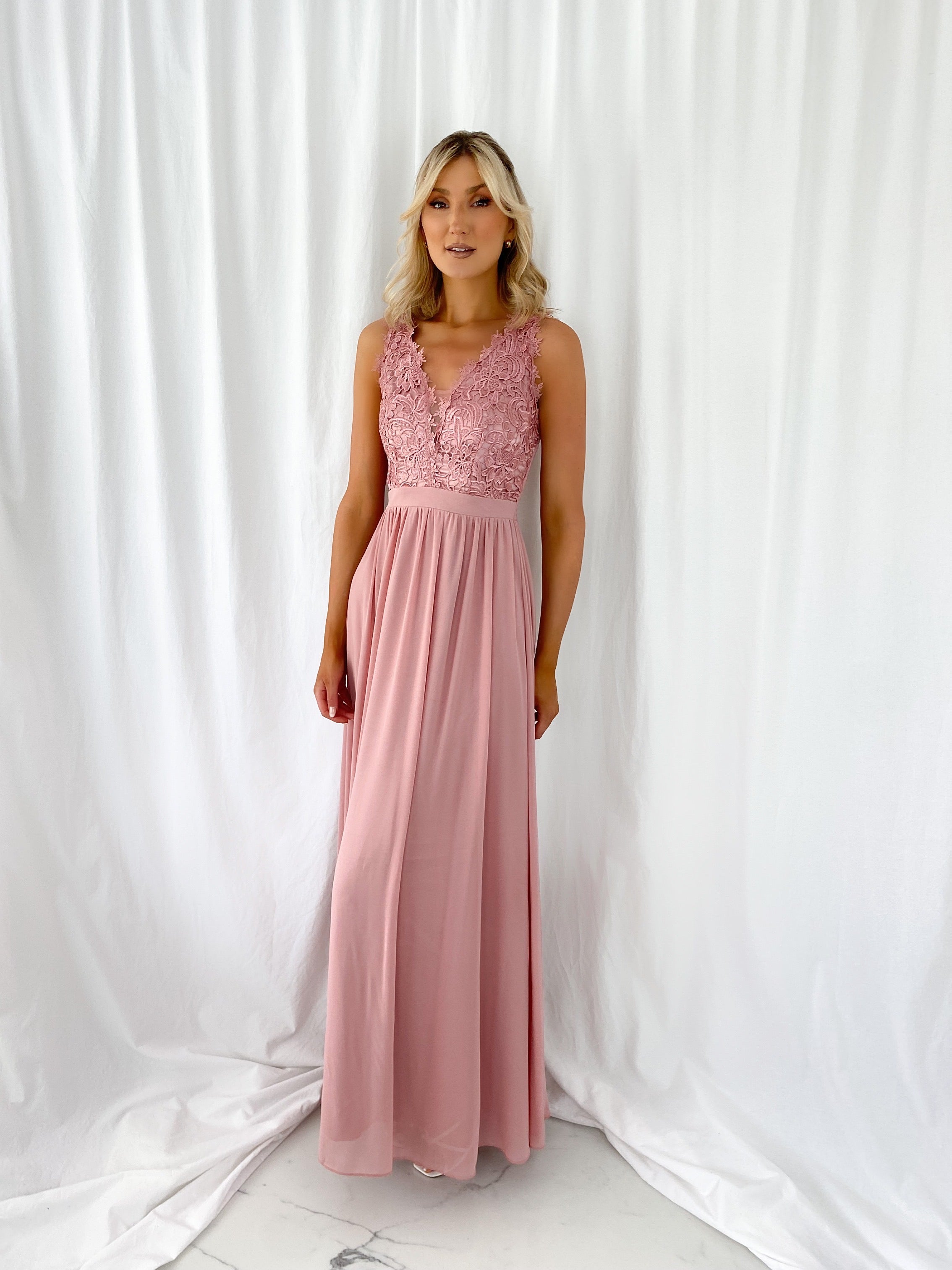 Telma Broderie Top Pleated Maxi Dress – Old Rose – Elasticated back – Small fit Model 6ft – Size Small – UK8