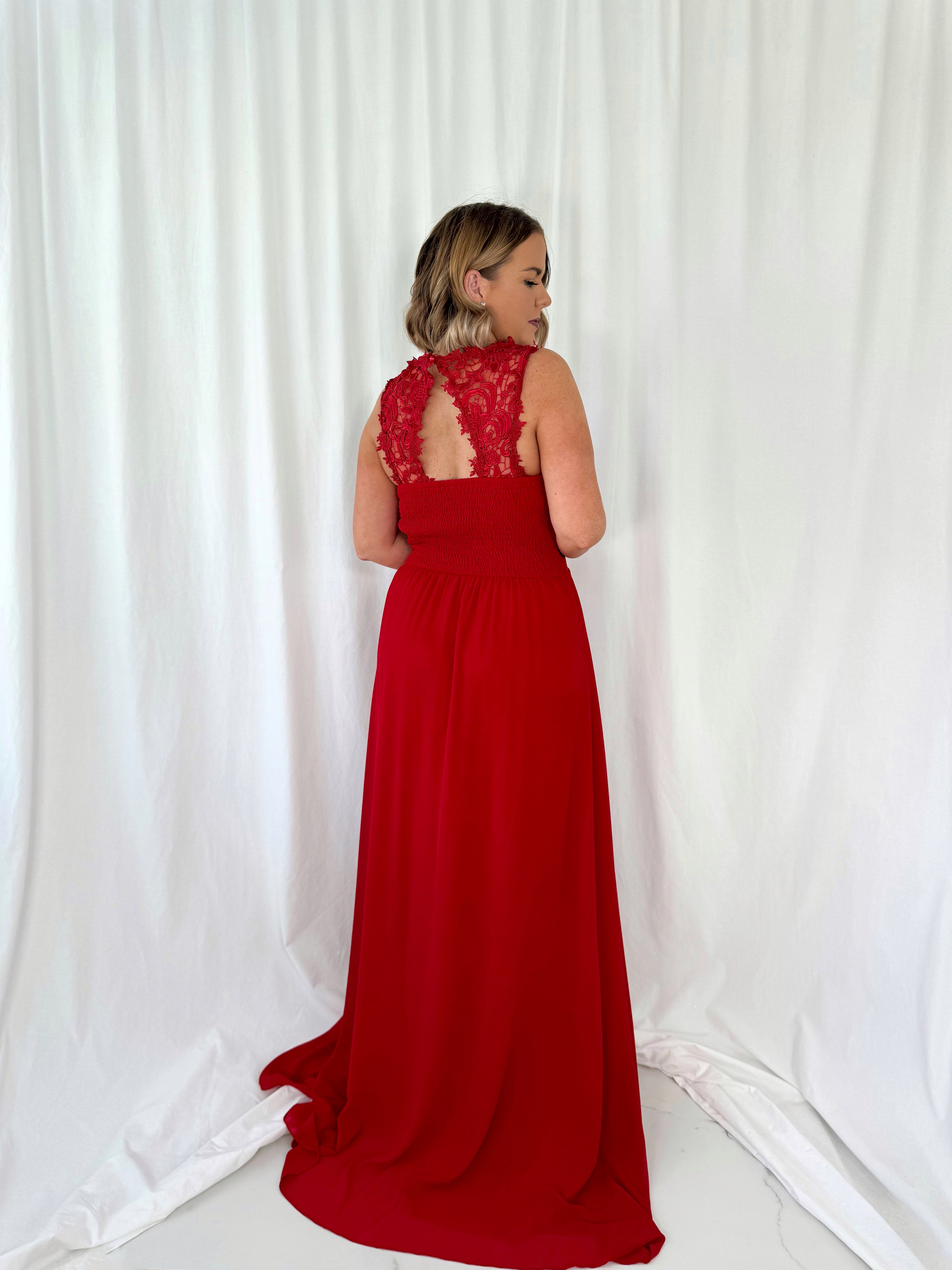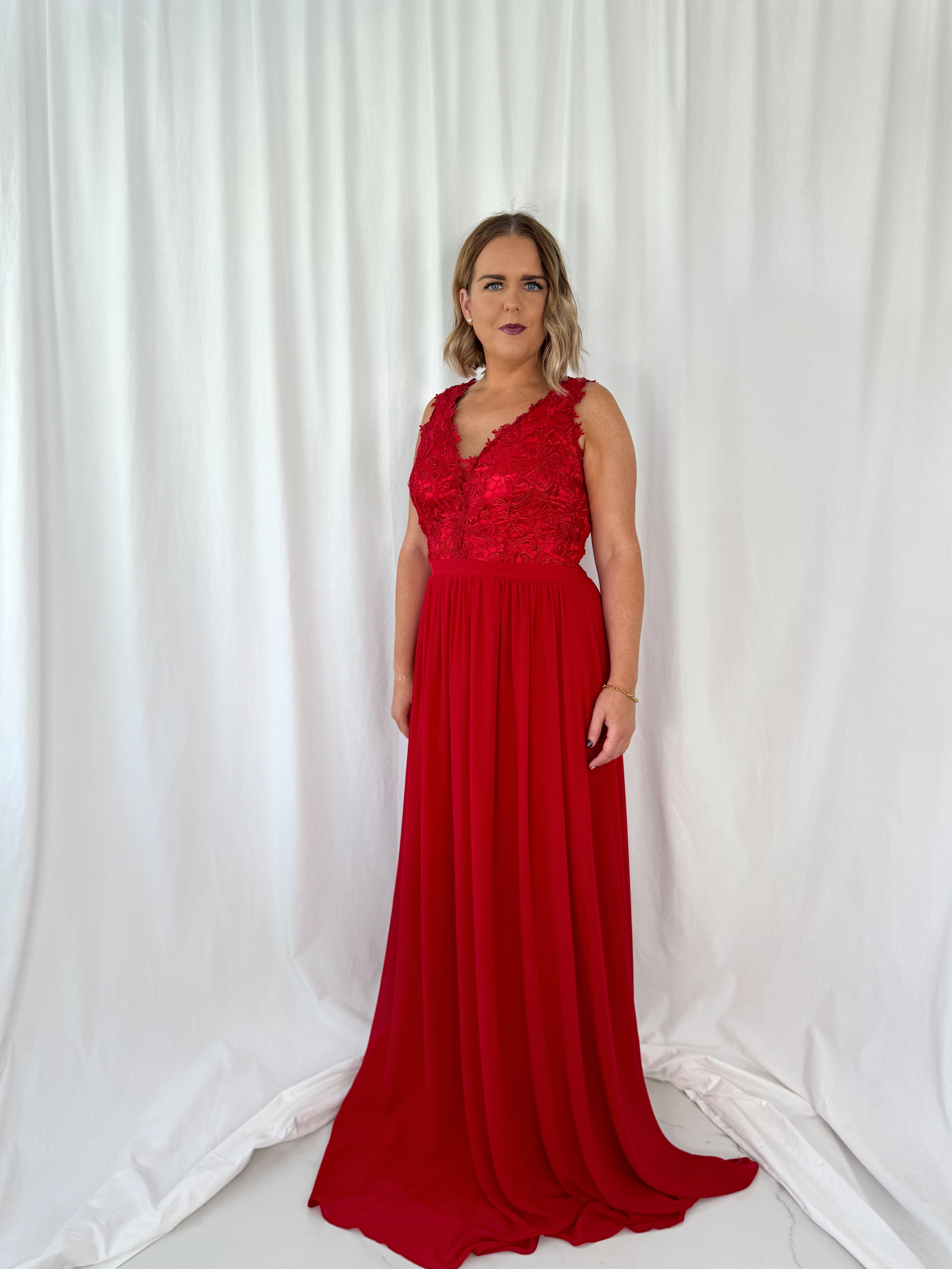 Telma Broderie Top Pleated Maxi Dress – Red – Elasticated back Model Height is 5ft 2 Model wears size 42 42 – UK14 44 – UK16 46 – UK18 48 – UK20 50 – UK22