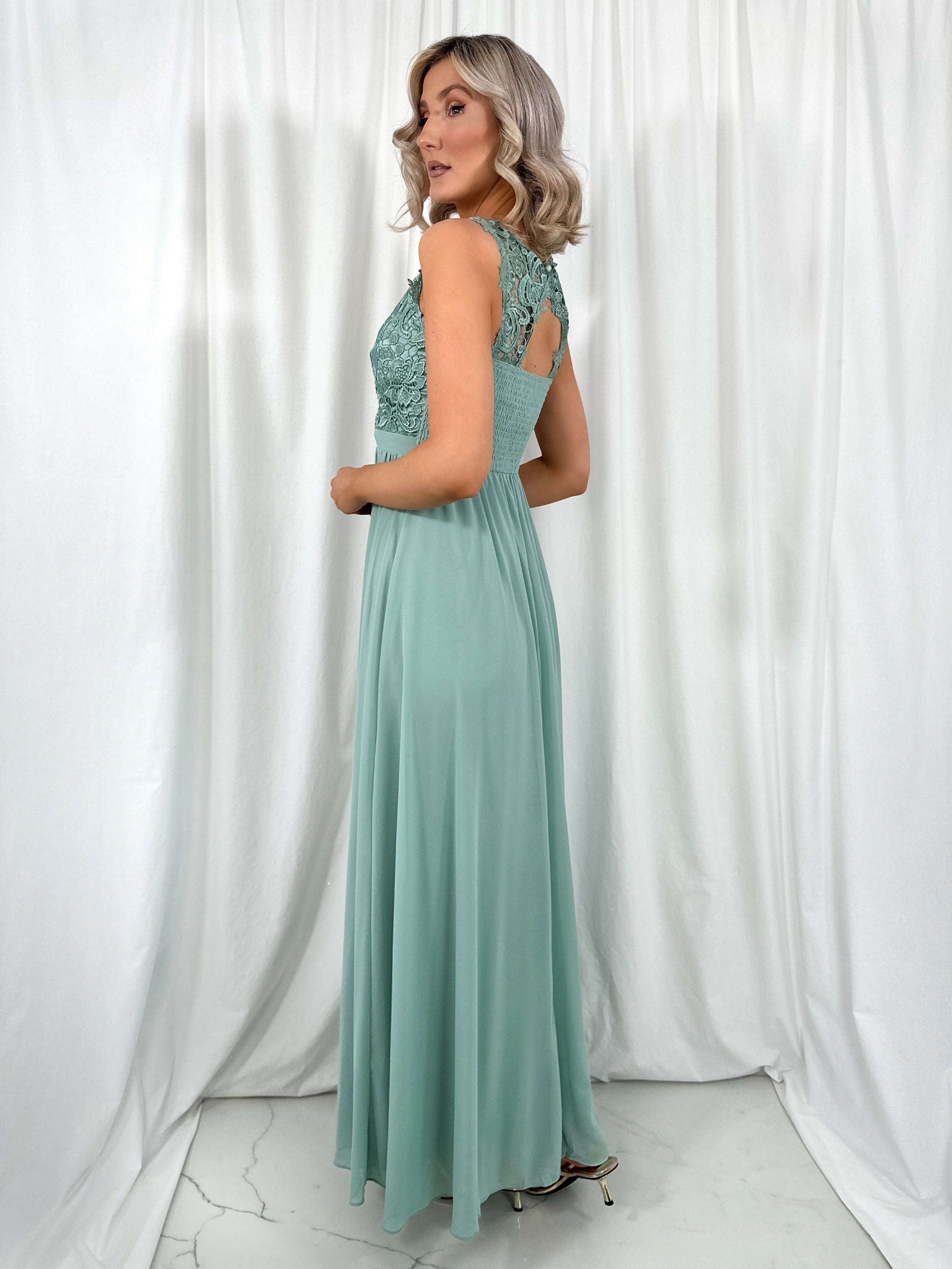 Telma Broderie Top Pleated Maxi Dress – Sage Green – Elasticated back – Small fit Model 6ft – Size Small – UK8