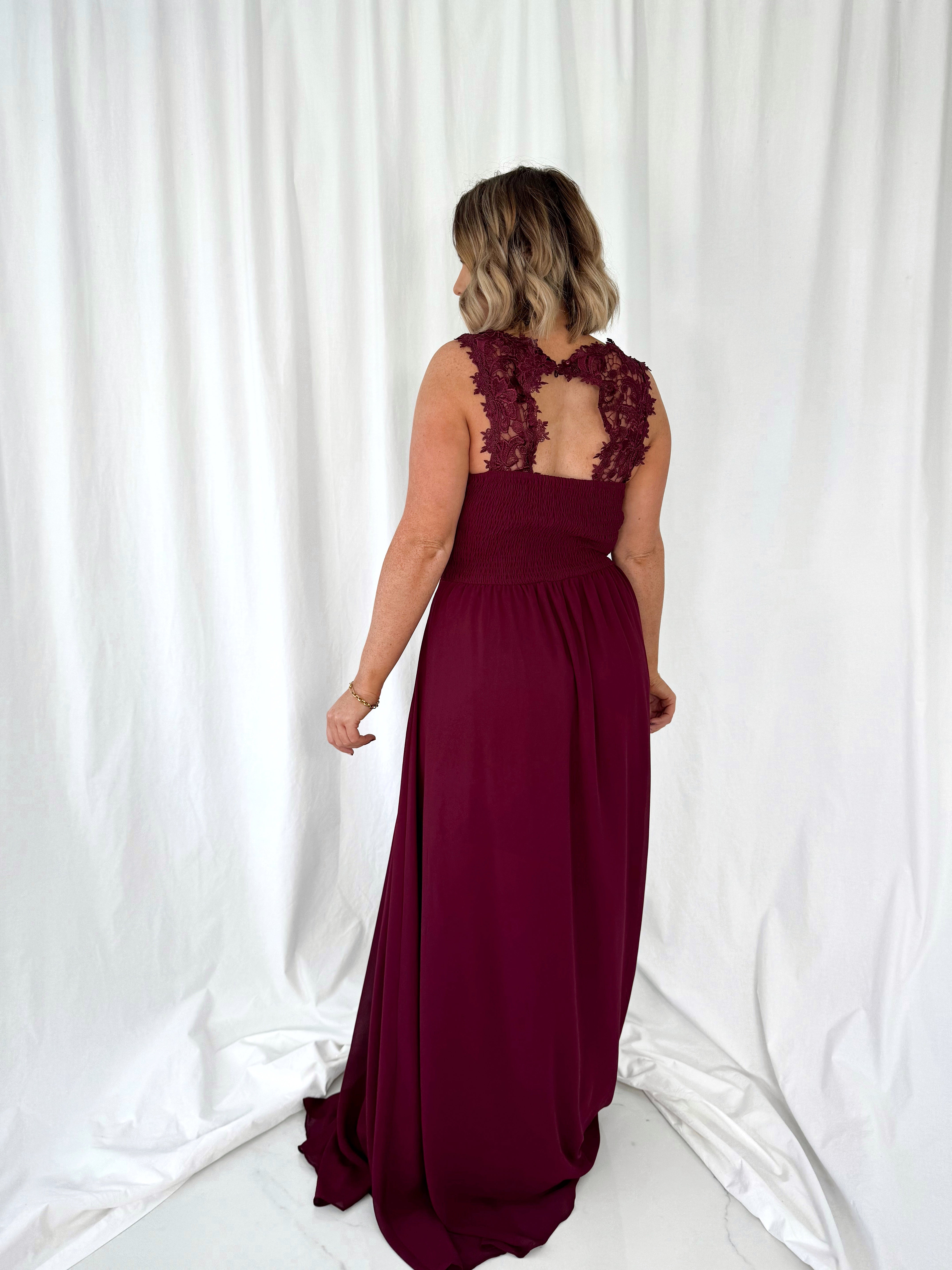 Telma Broderie Top Pleated Maxi Dress – Wine – Elasticated back Model Height is 5ft 2 Model wears size 42 42 – UK14 44 – UK16 46 – UK18 48 – UK20 50 – UK22