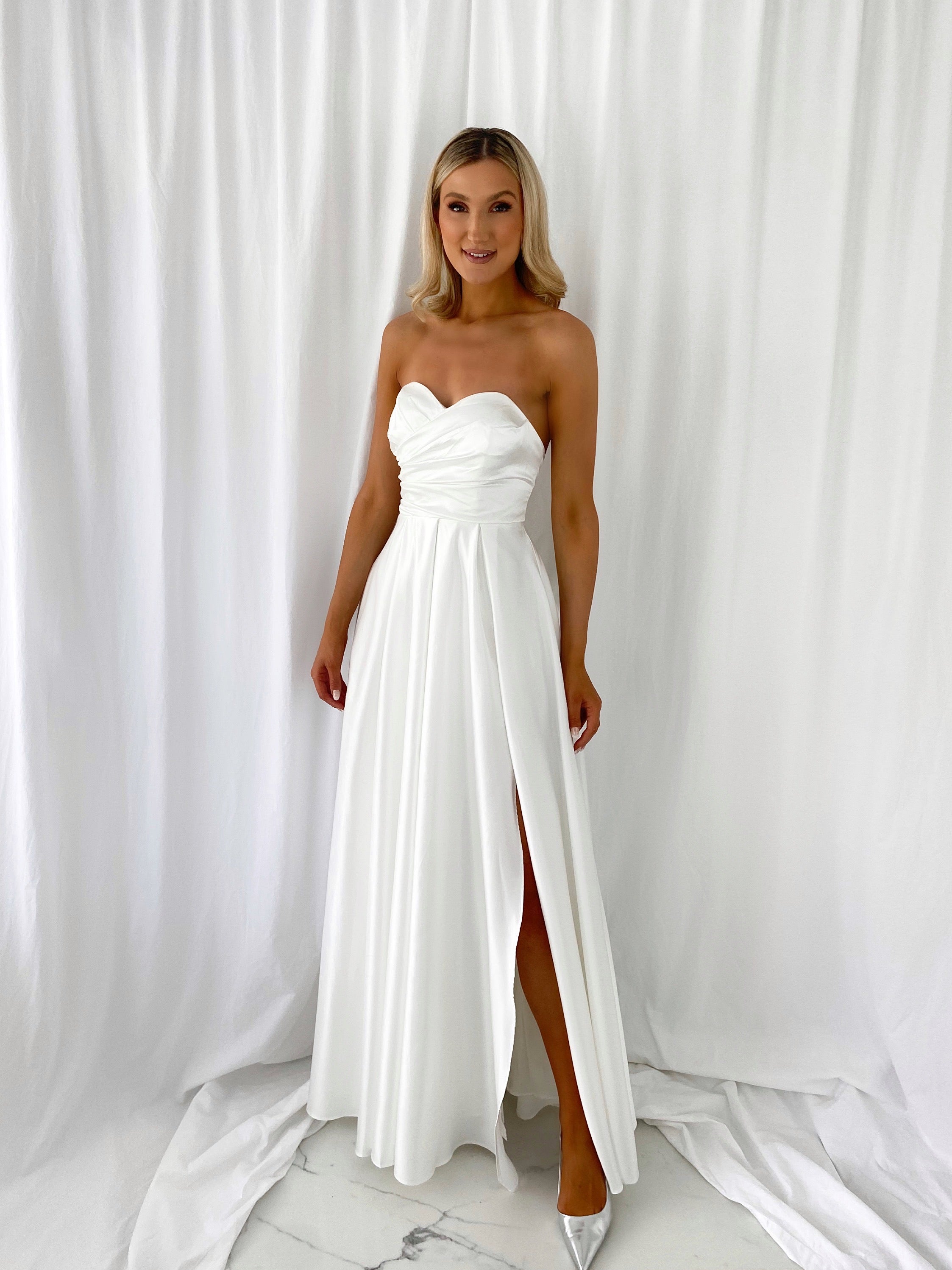 Teresa Off The Shoulder Maxi Dress – White – Strappy Back – Princess Skirt – Side Slit – Comes with Shoulder Strappy – Small fit Model 6ft – Size Small – UK8