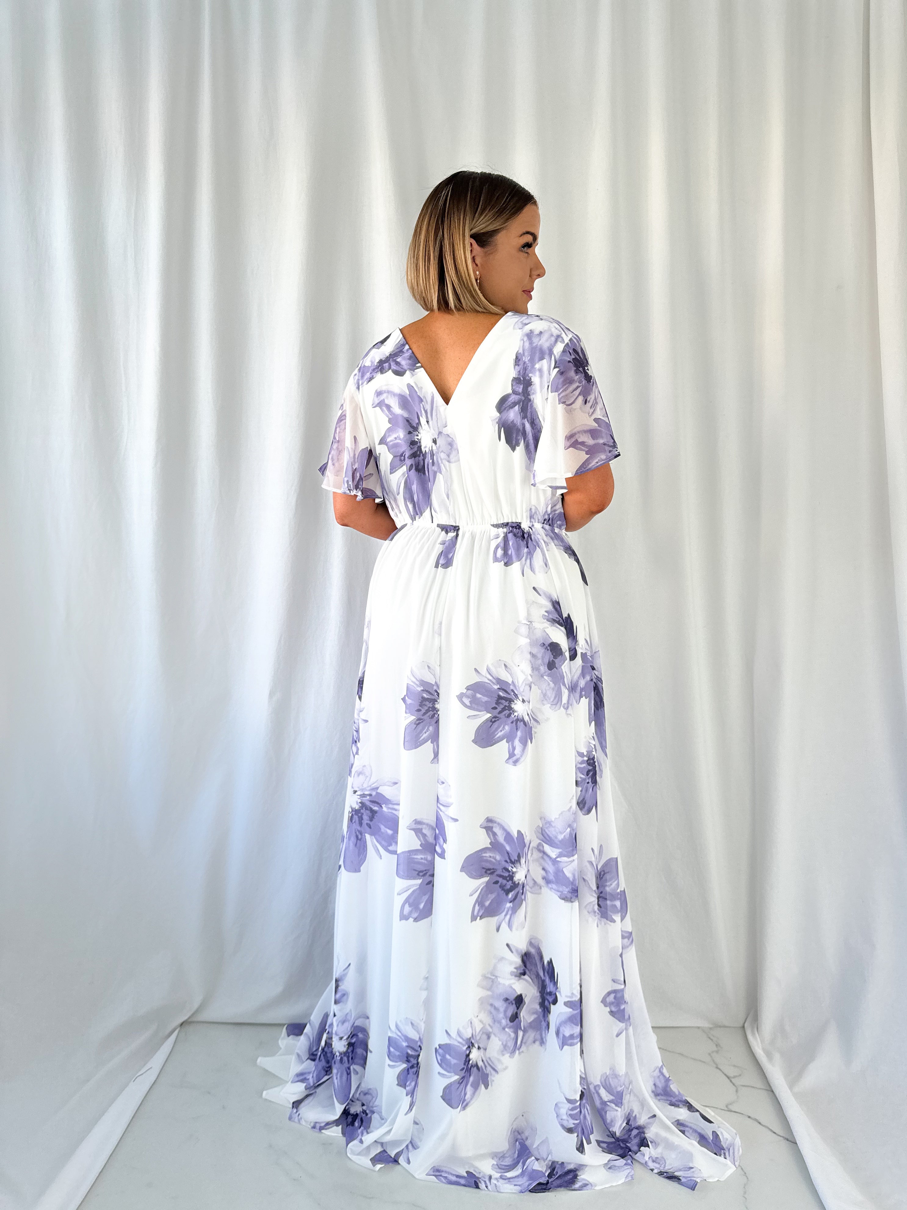 Vicky Maxi Floral Curve Dress – White and Purple – Lined – Short Sleeves Model wears size 42 42 – UK14 44 – UK16 46 – UK18 48 – UK20 50 – UK22