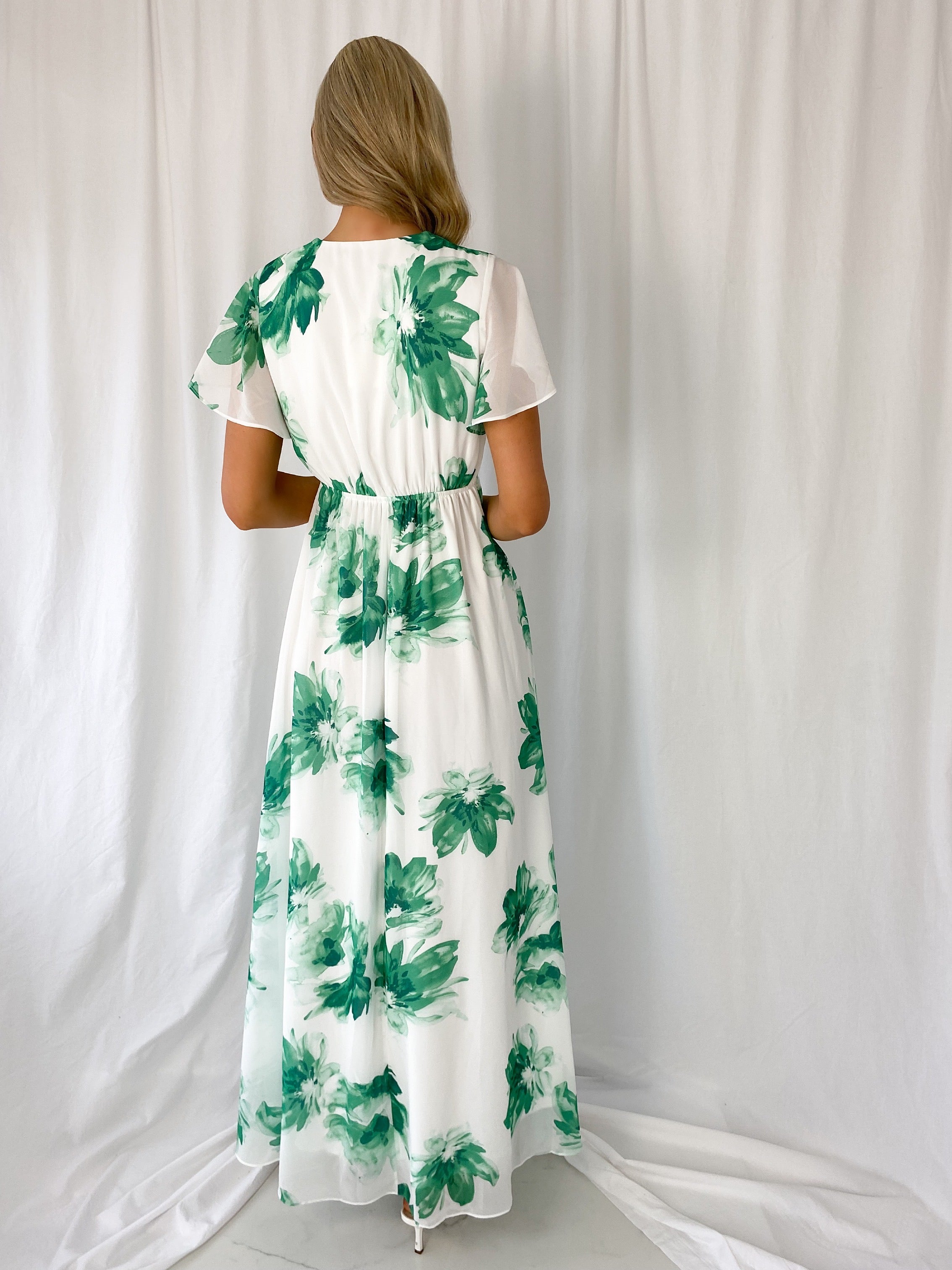 Vicky Maxi Floral Dress – White and Green – Lined – Short Sleeves – Small fit Model 6ft – Size Small – UK8