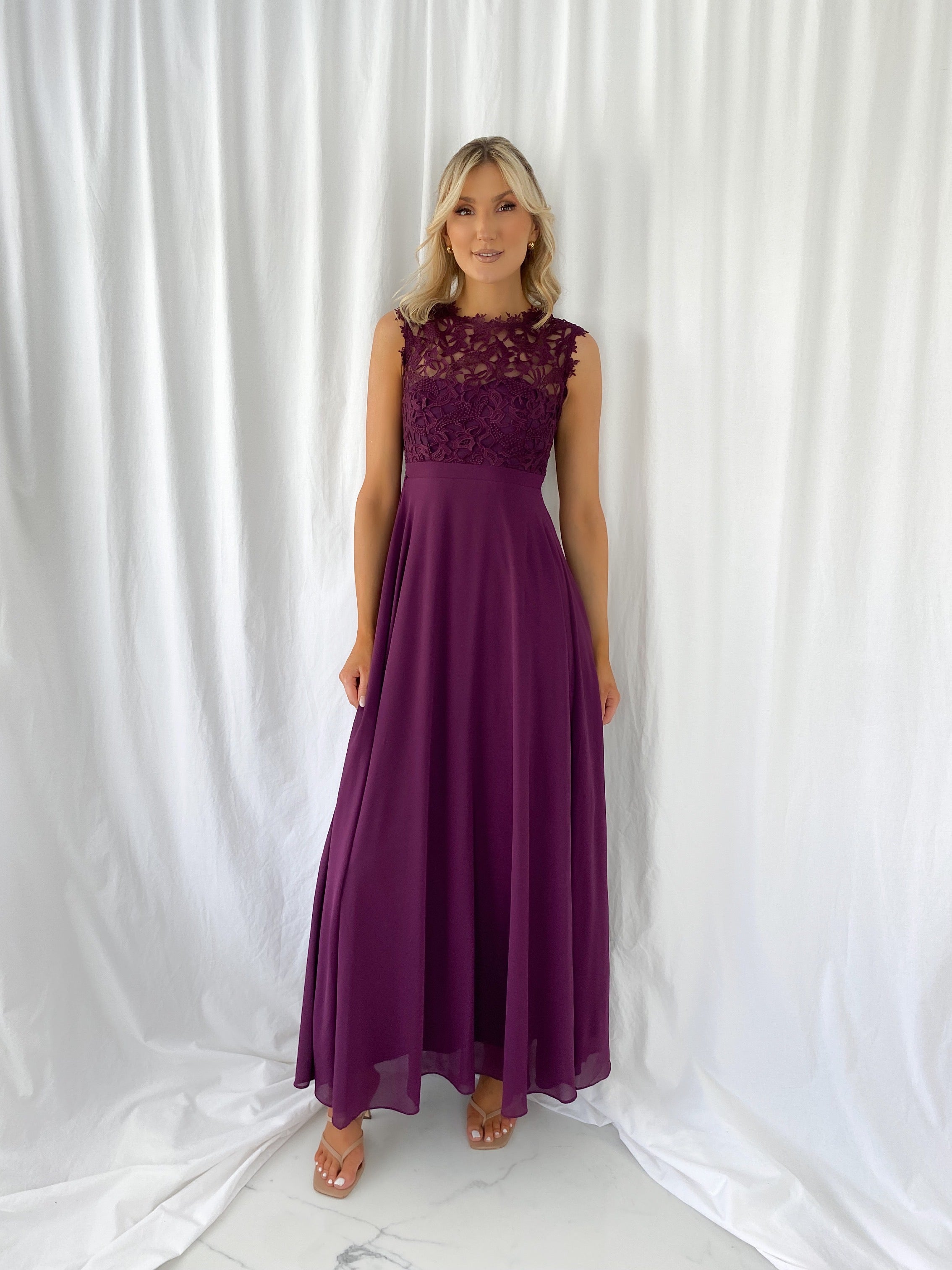 Savina Maxi Dress with Embroidered Top – Aubergine