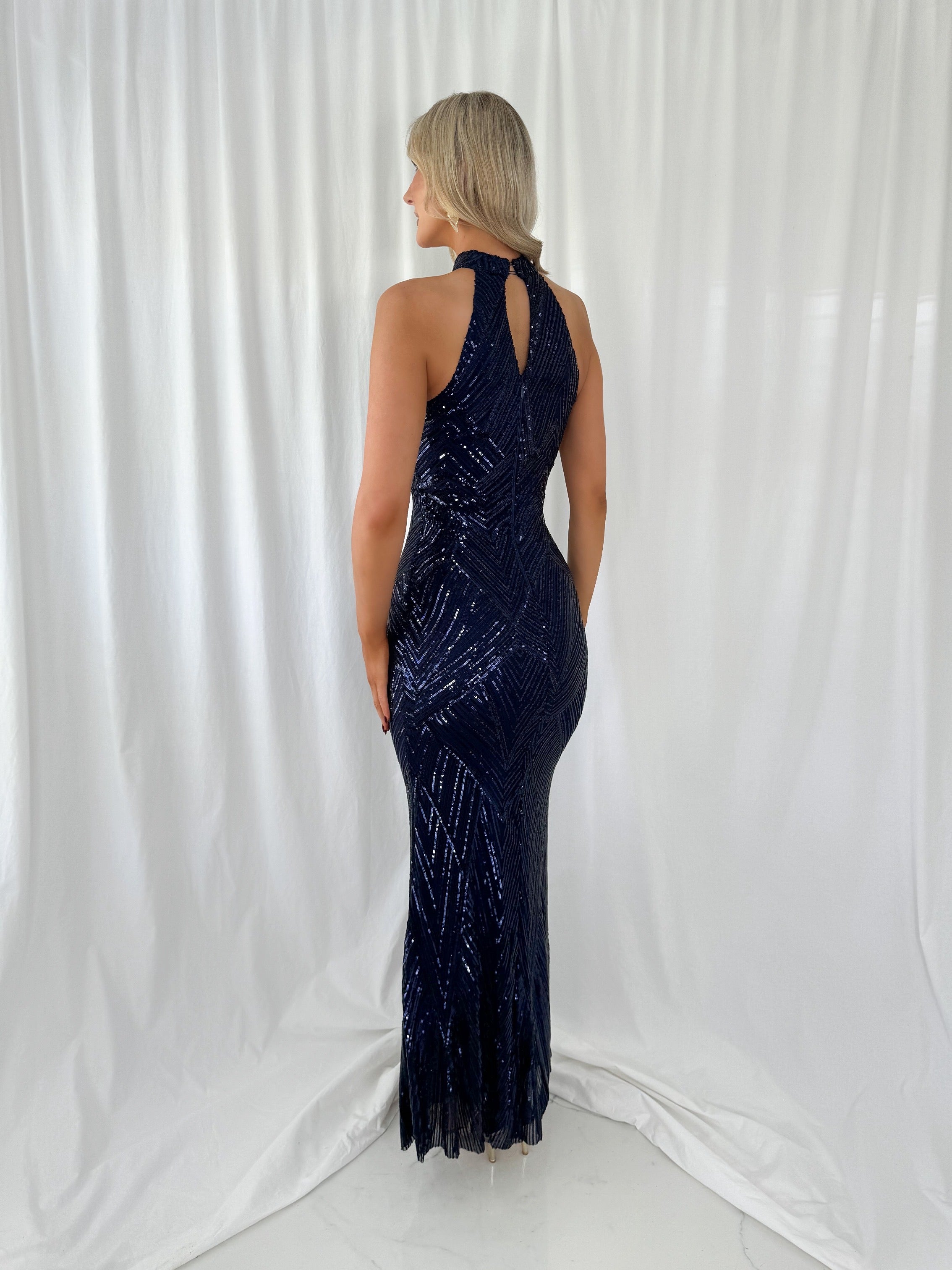Suzanne Halter Neck mermaid Maxi Dress – Navy
