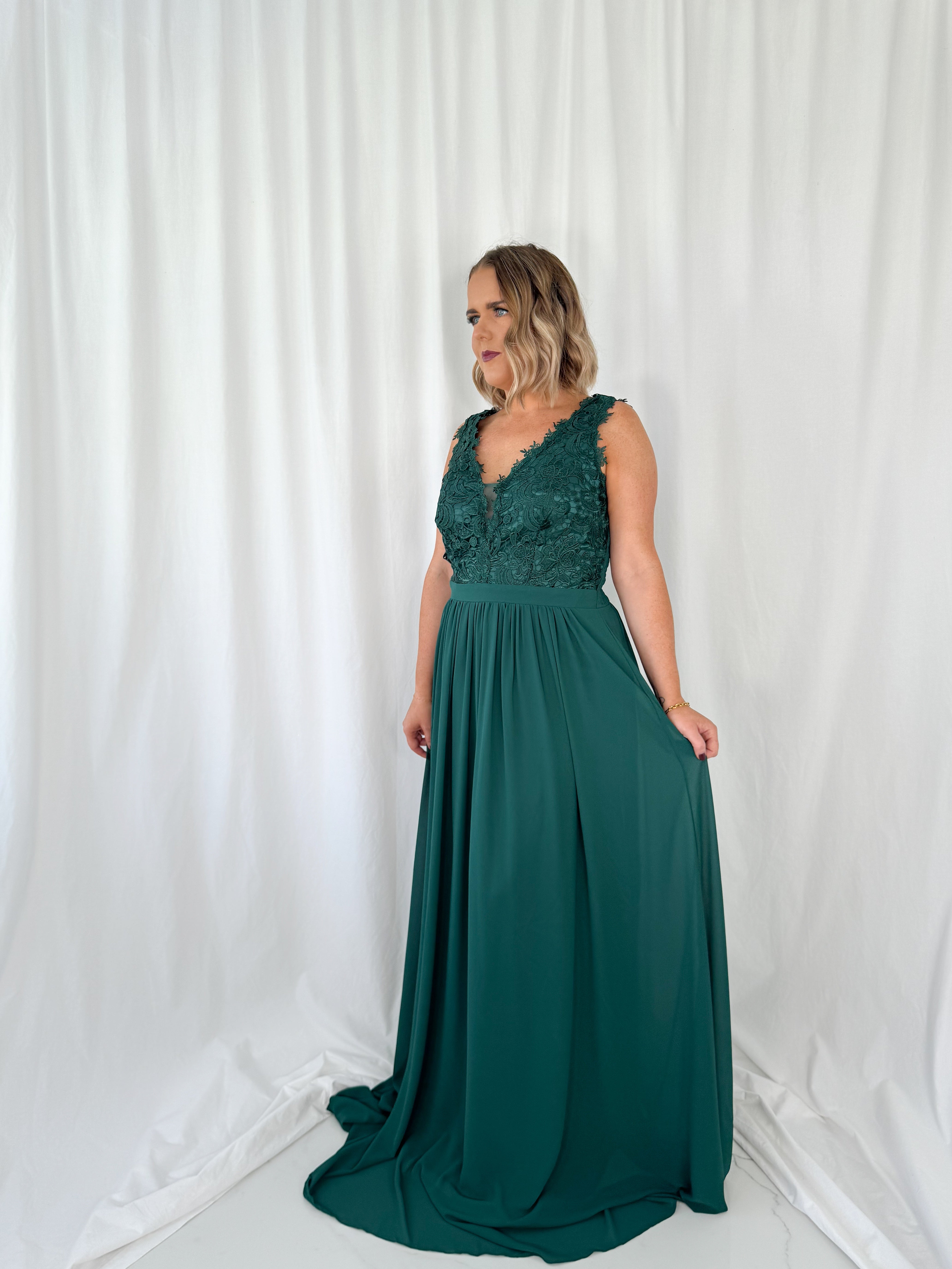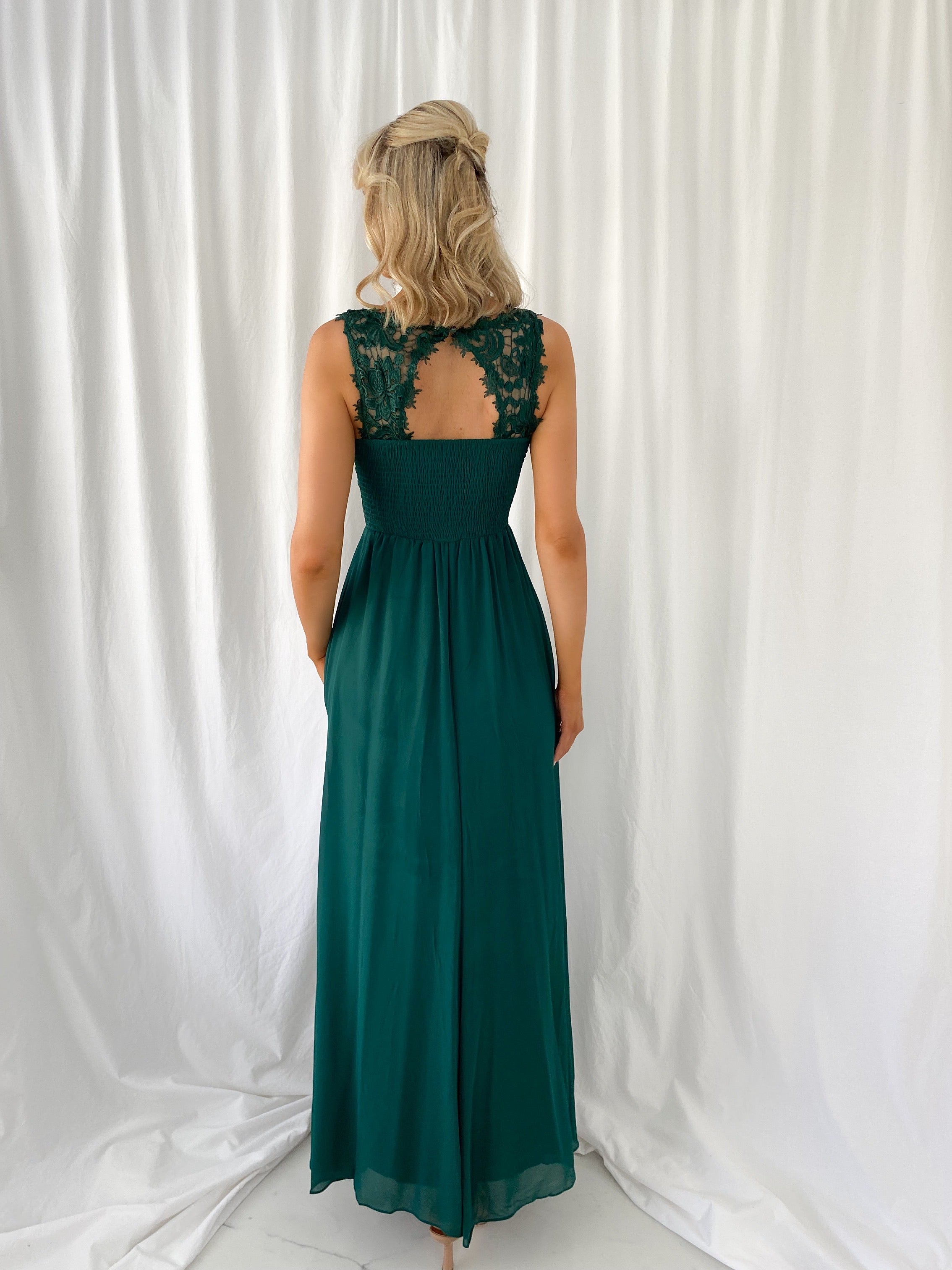 Telma Broderie Top Pleated Maxi Dress – Dark Green
