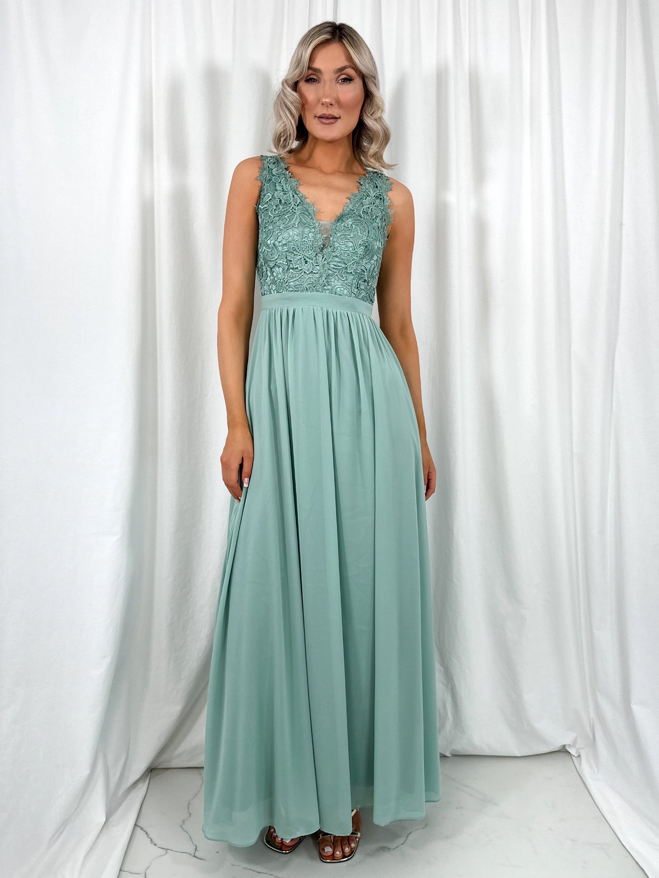 Telma Broderie Top Pleated Maxi Dress – Sage Green