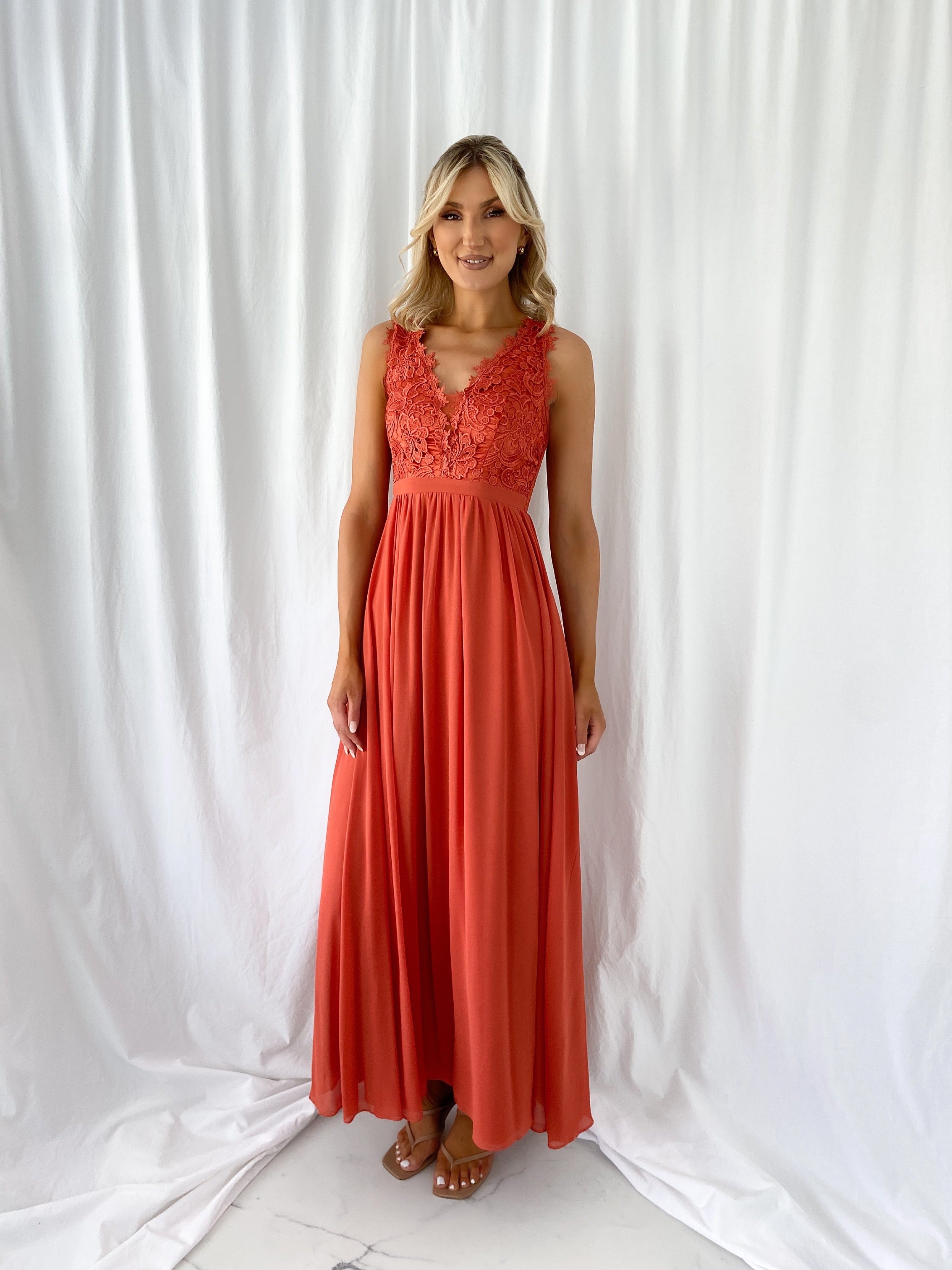Telma Broderie Top Pleated Maxi Dress – Orange