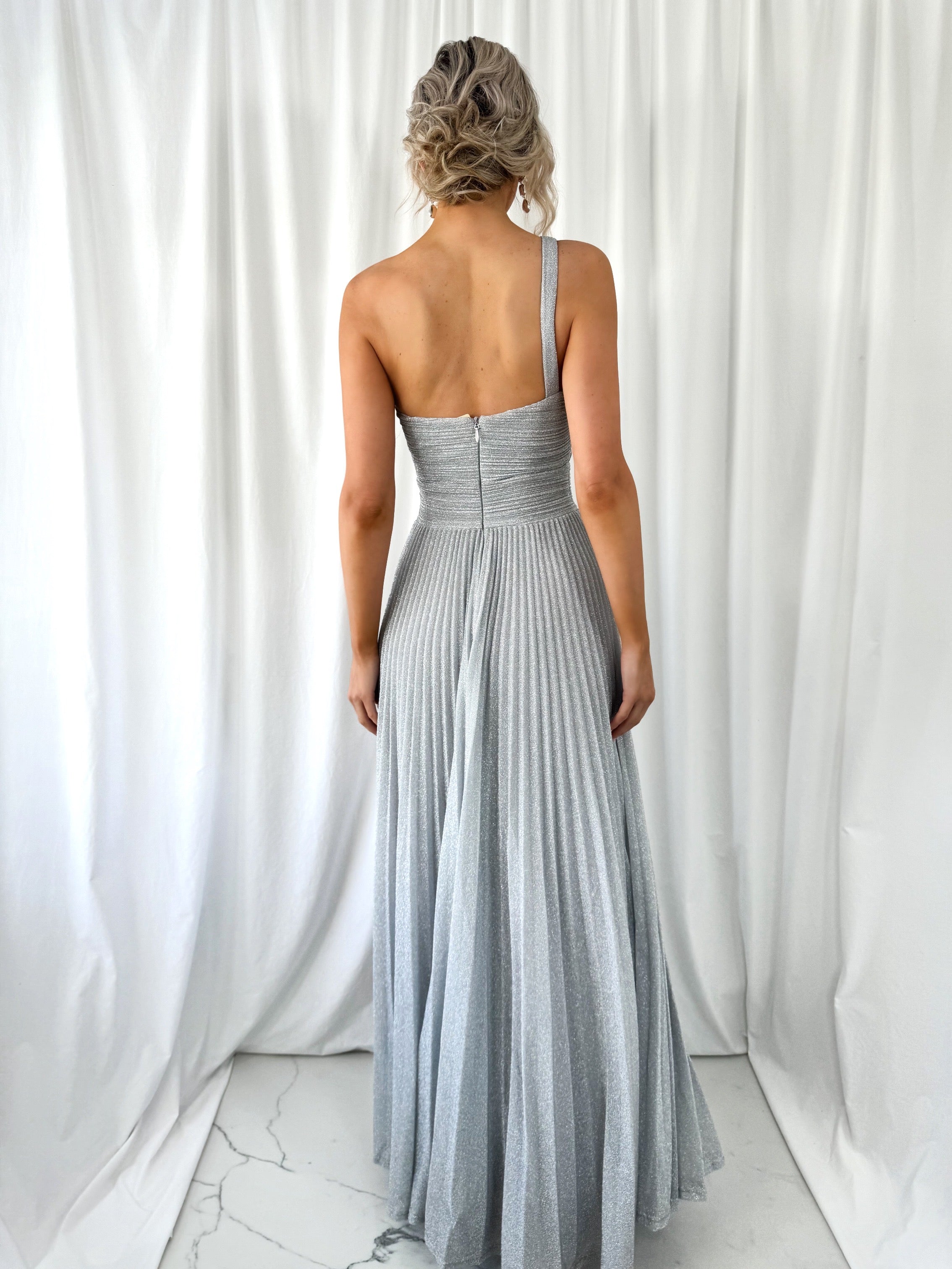 Coraly Bright Pleated Maxi Dress with Draped One Shoulder Top – Silver